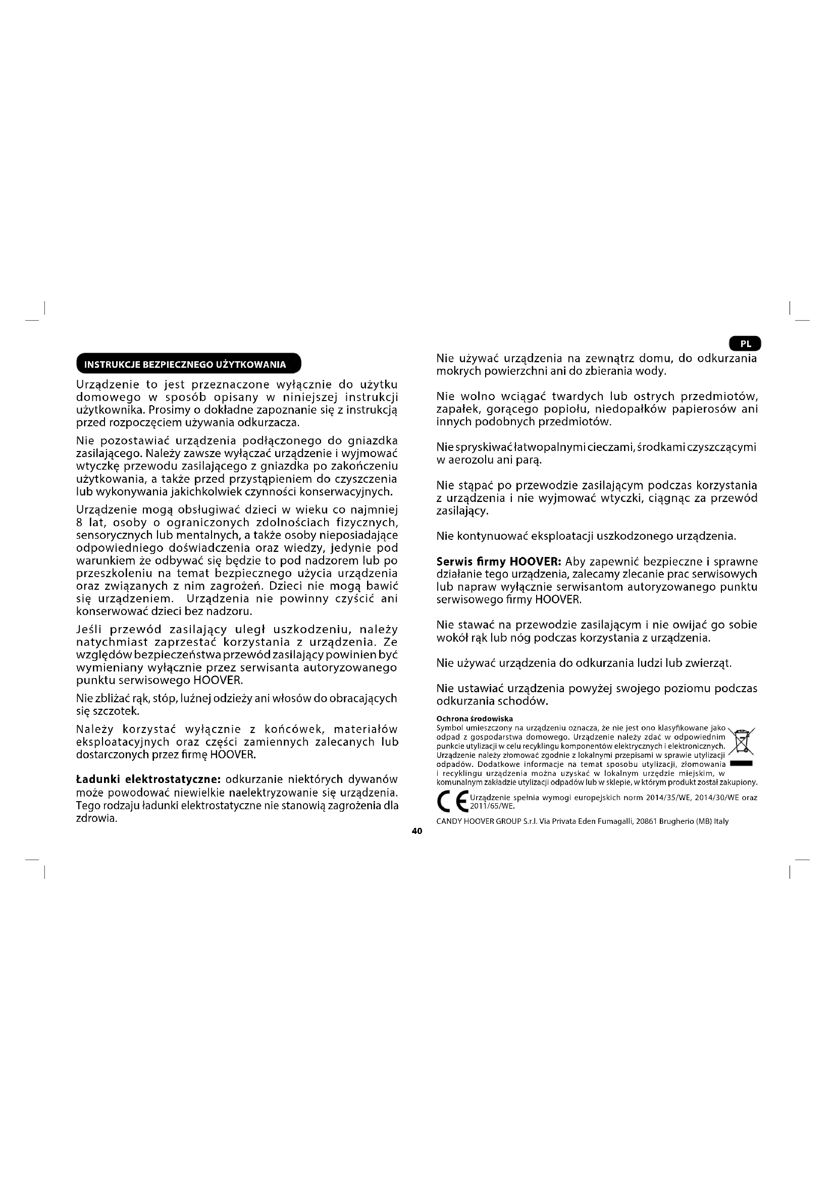 Urządzenie to jest przeznaczone wyłącznie do użytku domowego w sposób opisany w niniejszej instrukcji użytkownika. Prosimy o dokładne zapoznanie się z instrukcją przed rozpoczęciem używania odkurzacza. Nie pozostawiać urządzenia podłączonego do gniazdka zasilającego. Należy zawsze wyłączać urządzenie i wyjmować wtyczkę przewodu zasilającego z gniazdka po zakończeniu użytkowania, a także przed przystąpieniem do czyszczenia lub wykonywania jakichkolwiek czynności konserwacyjnych. Urządzenie mogą obsługiwać dzieci w wieku co najmniej 8 lat, osoby o ograniczonych zdolnościach fizycznych, sensorycznych lub mentalnych, a także osoby nieposiadające odpowiedniego doświadczenia oraz wiedzy, jedynie pod warunkiem że odbywać się będzie to pod nadzorem lub po przeszkoleniu na temat bezpiecznego użycia urządzenia oraz związanych z nim zagrożeń. Dzieci nie mogą bawić się urządzeniem. Urządzenia nie powinny czyścić ani konserwować dzieci bez nadzoru. Jeśli przewód zasilający uległ uszkodzeniu, należy natychmiast zaprzestać korzystania z urządzenia. Ze względów bezpieczeństwa przewód zasilający powinien być wymieniany wyłącznie przez serwisanta autoryzowanego punktu serwisowego HOOVER. Nie zbliżać rąk, stóp, luźnej odzieży ani włosów do obracających się szczotek. Należy korzystać wyłącznie z końcówek, materiałów eksploatacyjnych oraz części zamiennych zalecanych lub dostarczonych przez rmę HOOVER. Ładunki elektrostatyczne: odkurzanie niektórych dywanów może powodować niewielkie naelektryzowanie się urządzenia. Tego rodzaju ładunki elektrostatyczne nie stanowią zagrożenia dla zdrowia. Nie używać urządzenia na zewnątrz domu, do odkurzania mokrych powierzchni ani do zbierania wody. Nie wolno wciągać twardych lub ostrych przedmiotów, zapałek, gorącego popiołu, niedopałków papierosów ani innych podobnych przedmiotów. Nie spryskiwać łatwopalnymi cieczami, środkami czyszczącymi w aerozolu ani parą. Nie stąpać po przewodzie zasilającym podczas korzystania z urządzenia i nie wyjmować wtyczki, ciągnąc za przewód zasilający. Nie kontynuować eksploatacji uszkodzonego urządzenia. Serwis rmy HOOVER: Aby zapewnić bezpieczne i sprawne działanie tego urządzenia, zalecamy zlecanie prac serwisowych lub napraw wyłącznie serwisantom autoryzowanego punktu serwisowego rmy HOOVER. Nie stawać na przewodzie zasilającym i nie owijać go sobie wokół rąk lub nóg podczas korzystania z urządzenia. Nie używać urządzenia do odkurzania ludzi lub zwierząt. Nie ustawiać urządzenia powyżej swojego poziomu podczas odkurzania schodów. Ochrona środowiska Symbol umieszczony na urządzeniu oznacza, że nie jest ono klasykowane jako odpad z gospodarstwa domowego. Urządzenie należy zdać w odpowiednim punkcie utylizacji w celu recyklingu komponentów elektrycznych i elektronicznych. Urządzenie należy złomować zgodnie z lokalnymi przepisami w sprawie utylizacji odpadów. Dodatkowe informacje na temat sposobu utylizacji, złomowania i recyklingu urządzenia można uzyskać w lokalnym urzędzie miejskim, w komunalnym zakładzie utylizacji odpadów lub w sklepie, w którym produkt został zakupiony. Urządzenie spełnia wymogi europejskich norm 2014/35/WE, 2014/30/WE oraz 2011/65/WE. CANDY HOOVER GROUP S.r.l. Via Privata Eden Fumagalli, 20861 Brugherio (MB) Italy
