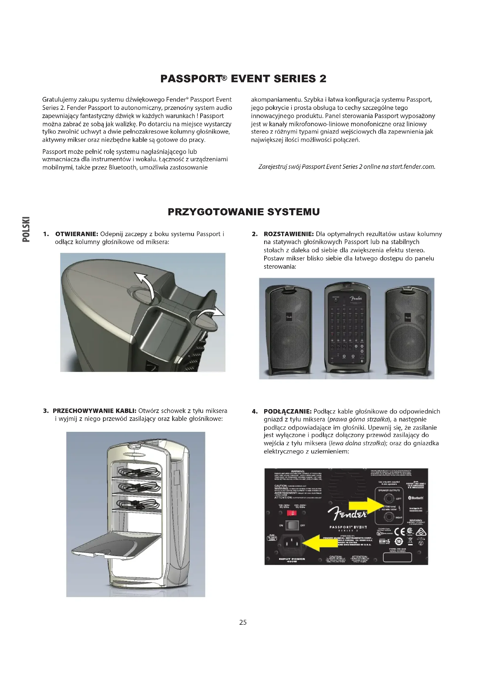 Lautsprecherkabel (im Lieferumfang) an. TECHNISCHE DATEN TYP PR 845 LEISTUNGSAUFNAHME 450W AUSGANGSLEISTUNG 375W SICHERUNG T6,3A H, 250V VERSTÄRKERTYP Class D LAUTSPRECHER zwei 8” Woofer, zwei 1,2” HF-Treiber ABMESSUNGEN UND GEWICHT Breite: 73,66 cm (29”) Höhe: 58,42 cm (23”) Tiefe: 27,94 cm (11”) Gewicht: 19,96 kg (44 lbs) Technische Daten können unangekündigt geändert werden. DEUTSCH25 PRZYGOTOWANIE SYSTEMU Gratulujemy zakupu systemu dźwiękowego Fender® Passport Event Series 2. Fender Passport to autonomiczny, przenośny system audio zapewniający fantastyczny dźwięk w każdych warunkach ! Passport można zabrać ze sobą jak walizkę. Po dotarciu na miejsce wystarczy tylko zwolnić uchwyt a dwie pełnozakresowe kolumny głośnikowe, aktywny mikser oraz niezbędne kable są gotowe do pracy. Passport może pełnić rolę systemu nagłaśniającego lub wzmacniacza dla instrumentów i wokalu. Łączność z urządzeniami mobilnymi, także przez Bluetooth, umożliwia zastosowanie akompaniamentu. Szybka i łatwa konfiguracja systemu Passport, jego pokrycie i prosta obsługa to cechy szczególne tego innowacyjnego produktu. Panel sterowania Passport wyposażony jest w kanały mikrofonowo-liniowe monofoniczne oraz liniowy stereo z różnymi typami gniazd wejściowych dla zapewnienia jak największej ilości możliwości połączeń. Zarejestruj swój Passport Event Series 2 online na start.fender.com. POL SKI PASSPORT