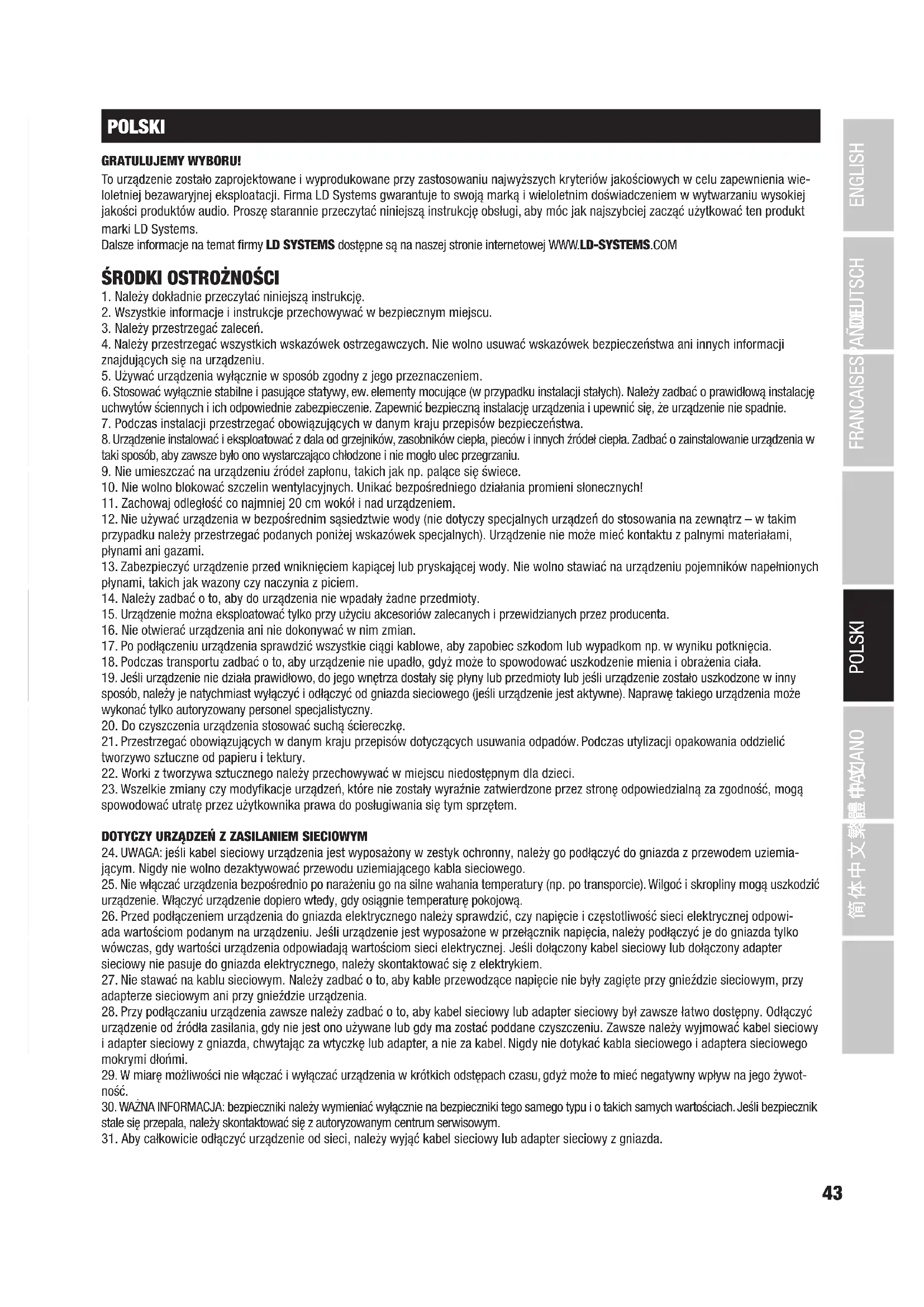 POLSKI GRATULUJEMY WYBORU! To urządzenie zostało zaprojektowane i wyprodukowane przy zastosowaniu najwyższych kryteriów jakościowych w celu zapewnienia wie- loletniej bezawaryjnej eksploatacji. Firma LD Systems gwarantuje to swoją marką i wieloletnim doświadczeniem w wytwarzaniu wysokiej jakości produktów audio. Proszę starannie przeczytać niniejszą instrukcję obsługi, aby móc jak najszybciej zacząć użytkować ten produkt marki LD Systems. Dalsze informacje na temat firmy LD SYSTEMS dostępne są na naszej stronie internetowej WWW.LD-SYSTEMS.COM