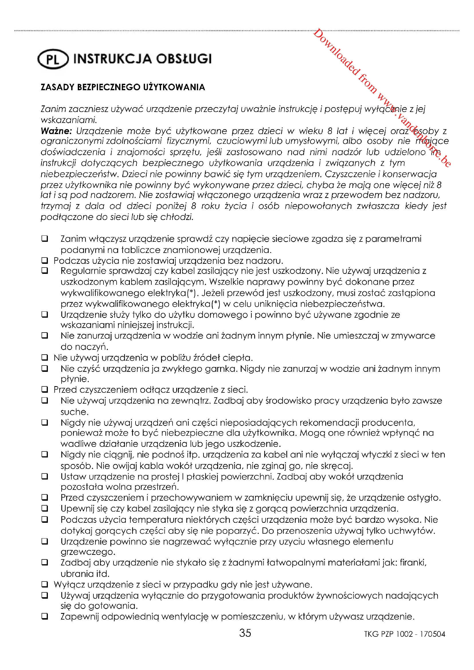 Zanim zaczniesz używać urządzenie przeczytaj uważnie instrukcję i postępuj wyłącznie z jej wskazaniami. Ważne: Urządzenie może być użytkowane przez dzieci w wieku 8 lat i więcej oraz osoby z ograniczonymi zdolnościami fizycznymi, czuciowymi lub umysłowymi, albo osoby nie mające doświadczenia i znajomości sprzętu, jeśli zastosowano nad nimi nadzór lub udzielono im instrukcji dotyczących bezpiecznego użytkowania urządzenia i związanych z tym niebezpieczeństw. Dzieci nie powinny bawić się tym urządzeniem. Czyszczenie i konserwacja przez użytkownika nie powinny być wykonywane przez dzieci, chyba że mają one więcej niż 8 lat i są pod nadzorem. Nie zostawiaj włączonego urządzenia wraz z przewodem bez nadzoru, trzymaj z dala od dzieci poniżej 8 roku życia i osób niepowołanych zwłaszcza kiedy jest podłączone do sieci lub się chłodzi. Zanim włączysz urządzenie sprawdź czy napięcie sieciowe zgadza się z parametrami podanymi na tabliczce znamionowej urządzenia. Podczas użycia nie zostawiaj urządzenia bez nadzoru. Regularnie sprawdzaj czy kabel zasilający nie jest uszkodzony. Nie używaj urządzenia z uszkodzonym kablem zasilającym. Wszelkie naprawy powinny być dokonane przez wykwalifikowanego elektryka(*). Jeżeli przewód jest uszkodzony, musi zostać zastąpiona przez wykwalifikowanego elektryka(*) w celu uniknięcia niebezpieczeństwa. Urządzenie służy tylko do użytku domowego i powinno być używane zgodnie ze wskazaniami niniejszej instrukcji. Nie zanurzaj urządzenia w wodzie ani żadnym innym płynie. Nie umieszczaj w zmywarce do naczyń. Nie używaj urządzenia w pobliżu źródeł ciepła. Nie czyść urządzenia ja zwykłego garnka. Nigdy nie zanurzaj w wodzie ani żadnym innym płynie. Przed czyszczeniem odłącz urządzenie z sieci. Nie używaj urządzenia na zewnątrz. Zadbaj aby środowisko pracy urządzenia było zawsze suche. Nigdy nie używaj urządzeń ani części nieposiadających rekomendacji producenta, ponieważ może to być niebezpieczne dla użytkownika. Mogą one również wpłynąć na wadliwe działanie urządzenia lub jego uszkodzenie. Nigdy nie ciągnij, nie podnoś itp. urządzenia za kabel ani nie wyłączaj wtyczki z sieci w ten sposób. Nie owijaj kabla wokół urządzenia, nie zginaj go, nie skręcaj. Ustaw urządzenie na prostej I płaskiej powierzchni. Zadbaj aby wokół urządzenia pozostała wolna przestrzeń. Przed czyszczeniem i przechowywaniem w zamknięciu upewnij się, że urządzenie ostygło. Upewnij się czy kabel zasilający nie styka się z gorącą powierzchnia urządzenia. Podczas użycia temperatura niektórych części urządzenia może być bardzo wysoka. Nie dotykaj gorących części aby się nie poparzyć. Do przenoszenia używaj tylko uchwytów. Urządzenie powinno sie nagrzewać wyłącznie przy uzyciu własnego elementu grzewczego. Zadbaj aby urządzenie nie stykało się z żadnymi łatwopalnymi materiałami jak: firanki, ubrania itd. Wyłącz urządzenie z sieci w przypadku gdy nie jest używane. Używaj urządzenia wyłącznie do przygotowania produktów żywnościowych nadających się do gotowania. Zapewnij odpowiednią wentylację w pomieszczeniu, w którym używasz urządzenie. Downloaded from www.vandenborre.beCopies of the I/B. Please reproduce them without any changes except under special instruction from Team International BELGIUM. The pages must be reproduced and folded in order to obtain a booklet A5 (+/- 148.5 mm width x 210 mm height). When folding, make sure you keep the good numbering when you turn the pages of the I/B. Don’t change the page numbering. Keep the language integrity.