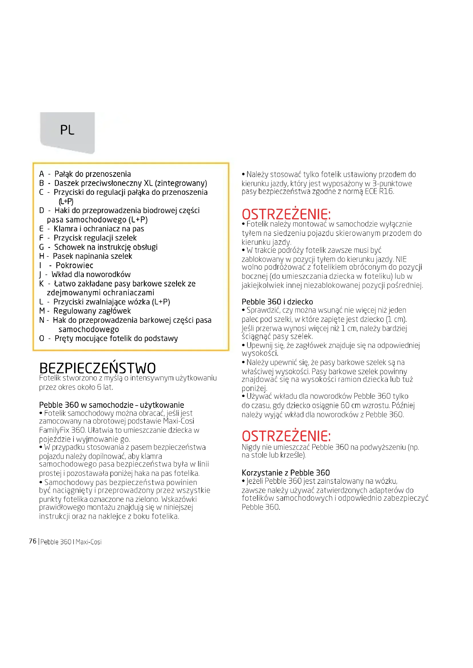 - Jeżeli Pebble 360 jest zainstalowany na wózku, zawsze należy używać zatwierdzonych adapterów do fotelików samochodowych i odpowiednio zabezpieczyć Pebble 360. A - Pałąk do przenoszenia B - Daszek przeciwsłoneczny XL (zintegrowany) C - Przyciski do regulacji pałąka do przenoszenia (L+P) D - Haki do przeprowadzenia biodrowej części pasa samochodowego (L+P) E - Klamra i ochraniacz na pas F - Przycisk regulacji szelek G - Schowek na instrukcję obsługi H - Pasek napinania szelek I - Pokrowiec J - Wkład dla noworodków K - Łatwo zakładane pasy barkowe szelek ze zdejmowanymi ochraniaczami L - Przyciski zwalniające wózka (L+P) M - Regulowany zagłówek N - Hak do przeprowadzenia barkowej części pasa samochodowego O - Pręty mocujące fotelik do podstawyMaxi-Cosi