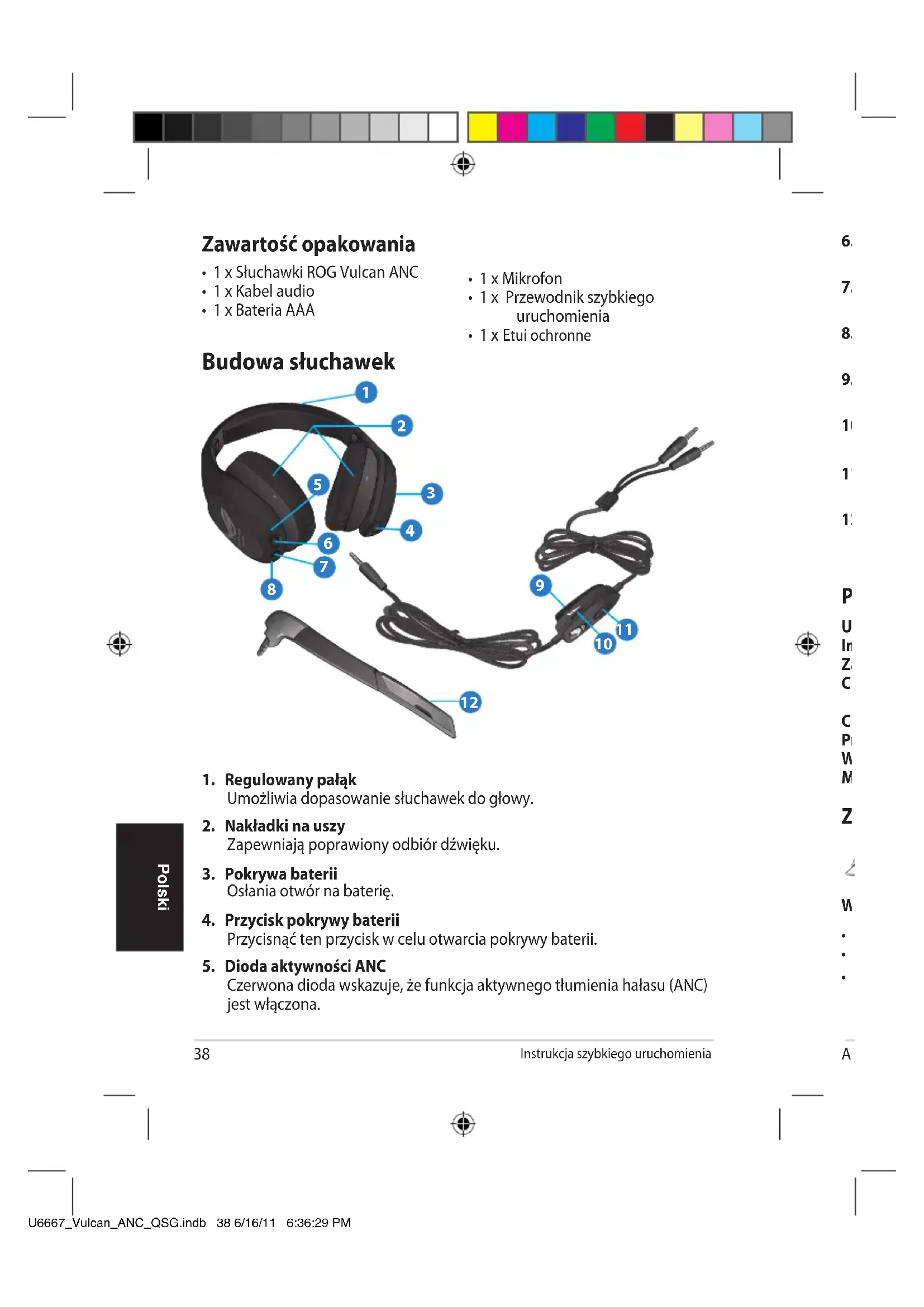 - Przesunąć sterowanie głośnością w celu zwiększenia/zmniejszenia głośności. Podstawowe dane techniczne Układ sterujący: 40 mm Impedancja: 32 omów Zakres częstotliwości: 10~20 Khz Charakterystyka ANC (Aktywne tłumienie hałasu): Maksymalnie >15 dB Szerokość pasma skutecznego >600 MHz Charakterystyka PNC (Pasywne tłumienie hałasu): Maksymalnie >30 dB Praca na baterii: Do 40 godzin (przy jednej baterii AAA) Wymiary (mm): 206 mm x 196 mm x 80 mm (dł. x szer. x wys.) Masa: 325 g U6667_Vulcan_ANC_QSG.indb 38 6/16/11 6:36:29 PMInstrukcja szybkiego uruchomienia ASUS ROG Vulcan ANC 39 Polski Budowa słuchawek