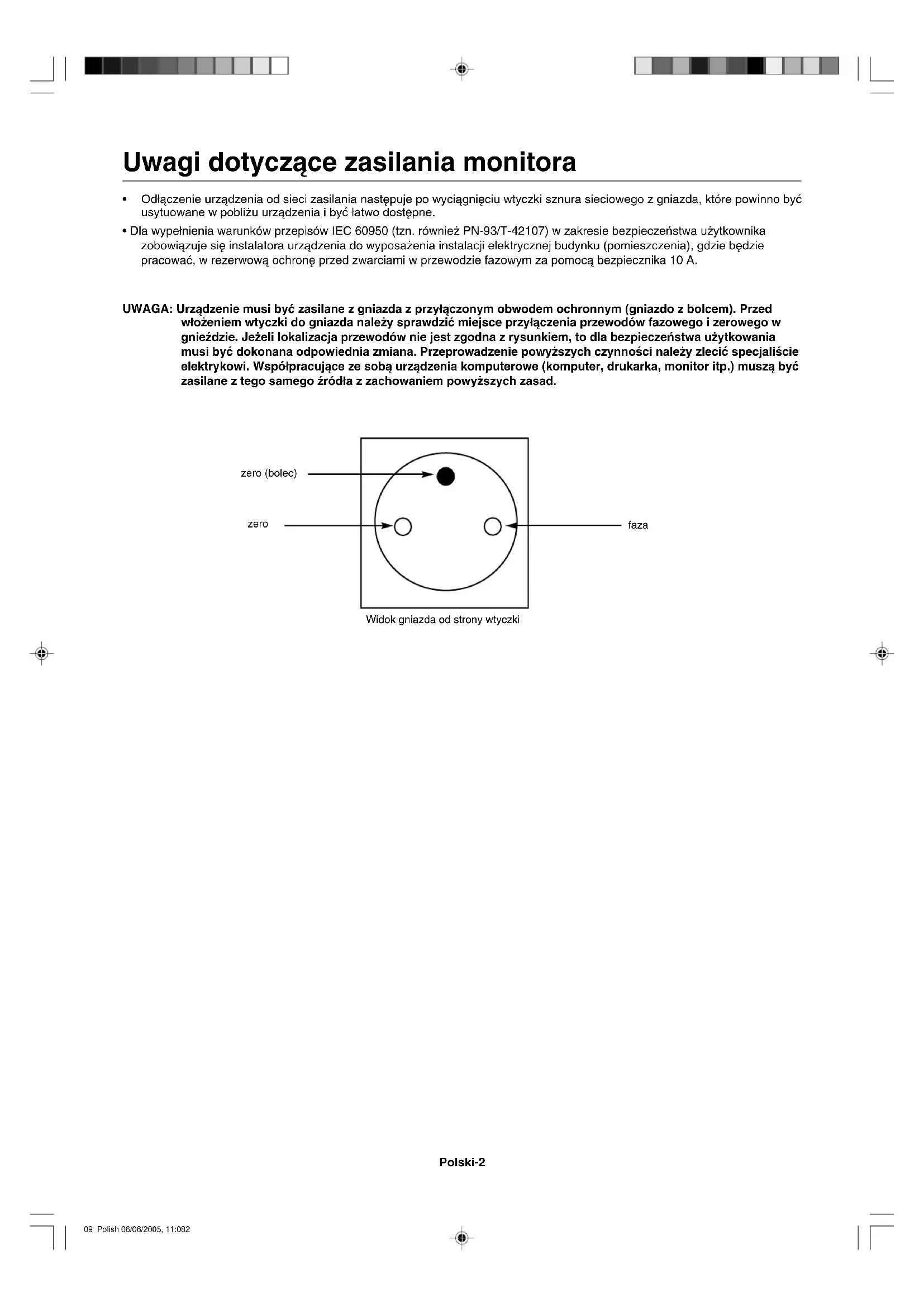 - Dla wype∏nienia warunków przepisów IEC 60950 (tzn. równie˝ PN-93/T-42107) w zakresie bezpieczeƒstwa u˝ytkownika zobowiàzuje si´ instalatora urzàdzenia do wyposa˝enia instalacji elektrycznej budynku (pomieszczenia), gdzie b´dzie pracowaç, w rezerwowà ochron´ przed zwarciami w przewodzie fazowym za pomocà bezpiecznika 10A. UWAGA: Urzàdzenie musi byç zasilane z gniazda z przy∏àczonym obwodem ochronnym (gniazdo z bolcem). Przed w∏o˝eniem wtyczki do gniazda nale˝y sprawdziç miejsce przy∏àczenia przewodów fazowego izerowego w gnieêdzie. Je˝eli lokalizacja przewodów nie jest zgodna zrysunkiem, to dla bezpieczeƒstwa u˝ytkowania musi byç dokonana odpowiednia zmiana. Przeprowadzenie powy˝szych czynnoÊci nale˝y zleciç specjaliÊcie elektrykowi. Wspó∏pracujàce ze sobà urzàdzenia komputerowe (komputer, drukarka, monitor itp.) muszà byç zasilane ztego samego êród∏a z zachowaniem powy˝szych zasad. zero (bolec) zero faza Widok gniazda od strony wtyczki 09_Polish 06/06/2005, 11:082Polski Polski-3 Deklaracja DEKLARACJA PRODUCENTA Niniejszym oÊwiadczamy, ˝e monitor kolorowy typu MultiSync LCD3210 (L325RM) jest zgodny z Dyrektywà Rady 73/23/EEC: – EN 60950-1 Dyrektywà Rady 89/336/EEC: – EN 55022 – EN 61000-3-2 – EN 61000-3-3 – EN 55024 i oznaczony znakiem NEC Display Solutions, Ltd. 4-13-23, Shibaura, Minato-Ku Tokyo 108-0023, Japan Wa˝ne informacje W CELU UNIKNI¢CIA NIEBEZPIECZE¡STWA PO˚ARU LUB PORA˚ENIA PRÑDEM NIE NALE˚Y WYSTAWIAå MONITORA NA DESZCZ LUB NA DZIA¸ANIE WILGOCI. NALE˚Y TAK˚E SPRAWDZIå, CZY BOLCE WTYCZKI KABLA ZASILAJÑCEGO SÑ PRAWID¸OWO W¸O˚ONE DO GNIAZDA ZASILAJÑCEGO LUB GNIAZDA PRZED¸U˚ACZA. WTYCZKI NIE NALE˚Y WK¸ADAå DO GNIAZDA NA SI¸¢. NIE NALE˚Y OTWIERAå OBUDOWY, PONIEWA˚ WEWNÑTRZ ZNAJDUJÑ SI¢ ELEMENTY POD WYSOKIM NAPI¢CIEM. WSZELKIE PRACE SERWISOWE MO˚E WYKONYWAå JEDYNIE WYKWALIFIKOWANY PERSONEL. OSTRZE˚ENIE UWAGA OSTRZE˚ENIE: W CELU UNIKNI¢CIA NIEBEZPIECZE¡STWA PORA˚ENIA PRÑDEM ELEKTRYCZNYM UPEWNIJ SI¢, ˚E WTYCZKA PRZEWODU ZASILAJÑCEGO ZOSTA¸A WYCIÑGNI¢TA Z GNIAZDKA. ABY CA¸KOWICIE OD¸ÑCZYå ZASILANIE, NALE˚Y WYCIÑGNÑå WTYCZK¢ Z GNIAZDKA ZASILAJÑCEGO. NIE WOLNO ZDEJMOWAå OS¸ONY (ANI TYLNEJ ÂCIANKI). WEWNÑTRZ NIE MA ˚ADNYCH ELEMENTÓW, KTÓRE WYMAGA¸YBY OBS¸UGI PRZEZ U˚YTKOWNIKA. WSZELKIE PRACE SERWISOWE MO˚E WYKONYWAå JEDYNIE WYKWALIFIKOWANY PERSONEL. Ten symbol ostrzega u˝ytkownika, ˝e nie izolowane elementy wewnàtrz znajdujà si´ pod tak du˝ym napi´ciem, ˝e mo˝e ono spowodowaç pora˝enie pràdem elektrycznym. Jakikolwiek wi´c bezpoÊredni kontakt z dowolnym elementem wewnàtrz obudowy jest niebezpieczny. Ten symbol informuje u˝ytkownika, ˝e istotne informacje dotyczàce pracy i obs∏ugi monitora znajdujà si´ w za∏àczonych instrukcjach. W zwiàzku z tym nale˝y si´ szczegó∏owo z nimi zapoznaç w celu unikni´cia problemów. Utylizacja starych produktów firmy NEC W Unii Europejskiej Rozwiàzania prawne Unii Europejskiej wprowadzone w ka˝dym Paƒstwie Cz∏onkowskim wymagajà utylizacji zu˝ytych urzàdzeƒ elektrycznych i elektronicznych opatrzonych znakiem umieszczonym po lewej stronie, oddzielnie od normalnych odpadów domowych. Dotyczy to równie˝ monitorów i akcesoriów elektrycznych, takich jak przewód sygna∏owych lub zasilajàcych. Przy utylizacji takich produktów nale˝y post´powaç zgodnie z wytycznymi lokalnej administracji i / lub zapytaç si´ o sposób post´powania w sklepie, gdzie nabyto dany produkt lub nale˝y post´powaç zgodnie z umowà zawartà z firmà NEC. Wy˝ej wymienione oznaczenie produktów elektrycznych i elektronicznych odnosi si´ tylko do aktualnych Paƒstw Cz∏onkowskich Unii Europejskiej. Poza terenem Unii Europejskiej Je˝eli chcesz utylizowaç zu˝yte produkty elektryczne i elektroniczne poza terenem Unii Europejskiej, musisz skontaktowaç si´ z przedstawicielem lokalnych w∏adz i zapytaç si´ o prawid∏owà metod´ utylizacji. 09_Polish 06/06/2005, 11:083Polski-4