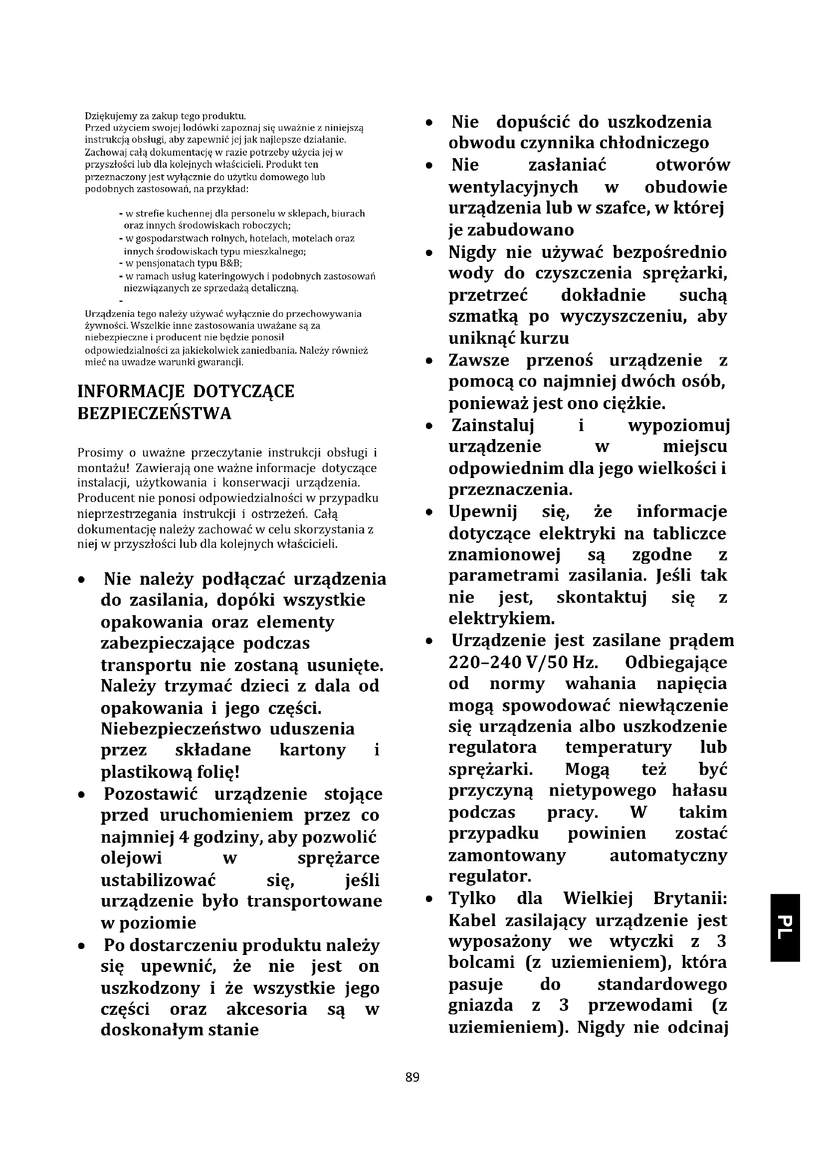 BEZPIECZEŃSTWA Prosimy o uważne przeczytanie instrukcji obsługi i montażu! Zawierają one ważne informacje dotyczące instalacji, użytkowania i konserwacji urządzenia. Producent nie ponosi odpowiedzialności w przypadku nieprzestrzegania instrukcji i ostrzeżeń. Całą dokumentację należy zachować w celu skorzystania z niej w przyszłości lub dla kolejnych właścicieli. Nie należy podłączać urządzenia do zasilania, dopóki wszystkie opakowania oraz elementy zabezpieczające podczas transportu nie zostaną usunięte. Należy trzymać dzieci z dala od opakowania i jego części. Niebezpieczeństwo uduszenia przez składane kartony i plastikową folię! Pozostawić urządzenie stojące przed uruchomieniem przez co najmniej 4 godziny, aby pozwolić olejowi w sprężarce ustabilizować się, jeśli urządzenie było transportowane w poziomie Po dostarczeniu produktu należy się upewnić, że nie jest on uszkodzony i że wszystkie jego części oraz akcesoria są w doskonałym stanie Nie dopuścić do uszkodzenia obwodu czynnika chłodniczego Nie zasłaniać otworów wentylacyjnych w obudowie urządzenia lub w szafce, w której je zabudowano Nigdy nie używać bezpośrednio wody do czyszczenia sprężarki, przetrzeć dokładnie suchą szmatką po wyczyszczeniu, aby uniknąć kurzu Zawsze przenoś urządzenie z pomocą co najmniej dwóch osób, ponieważ jest ono ciężkie. Zainstaluj i wypoziomuj urządzenie w miejscu odpowiednim dla jego wielkości i przeznaczenia. Upewnij się, że informacje dotyczące elektryki na tabliczce znamionowej są zgodne z parametrami zasilania. Jeśli tak nie jest, skontaktuj się z elektrykiem. Urządzenie jest zasilane prądem 220–240 V/50 Hz. Odbiegające od normy wahania napięcia mogą spowodować niewłączenie się urządzenia albo uszkodzenie regulatora temperatury lub sprężarki. Mogą też być przyczyną nietypowego hałasu podczas pracy. W takim przypadku powinien zostać zamontowany automatyczny regulator. Tylko dla Wielkiej Brytanii: Kabel zasilający urządzenie jest wyposażony we wtyczki z 3 bolcami (z uziemieniem), która pasuje do standardowego gniazda z 3 przewodami (z uziemieniem). Nigdy nie odcinaj