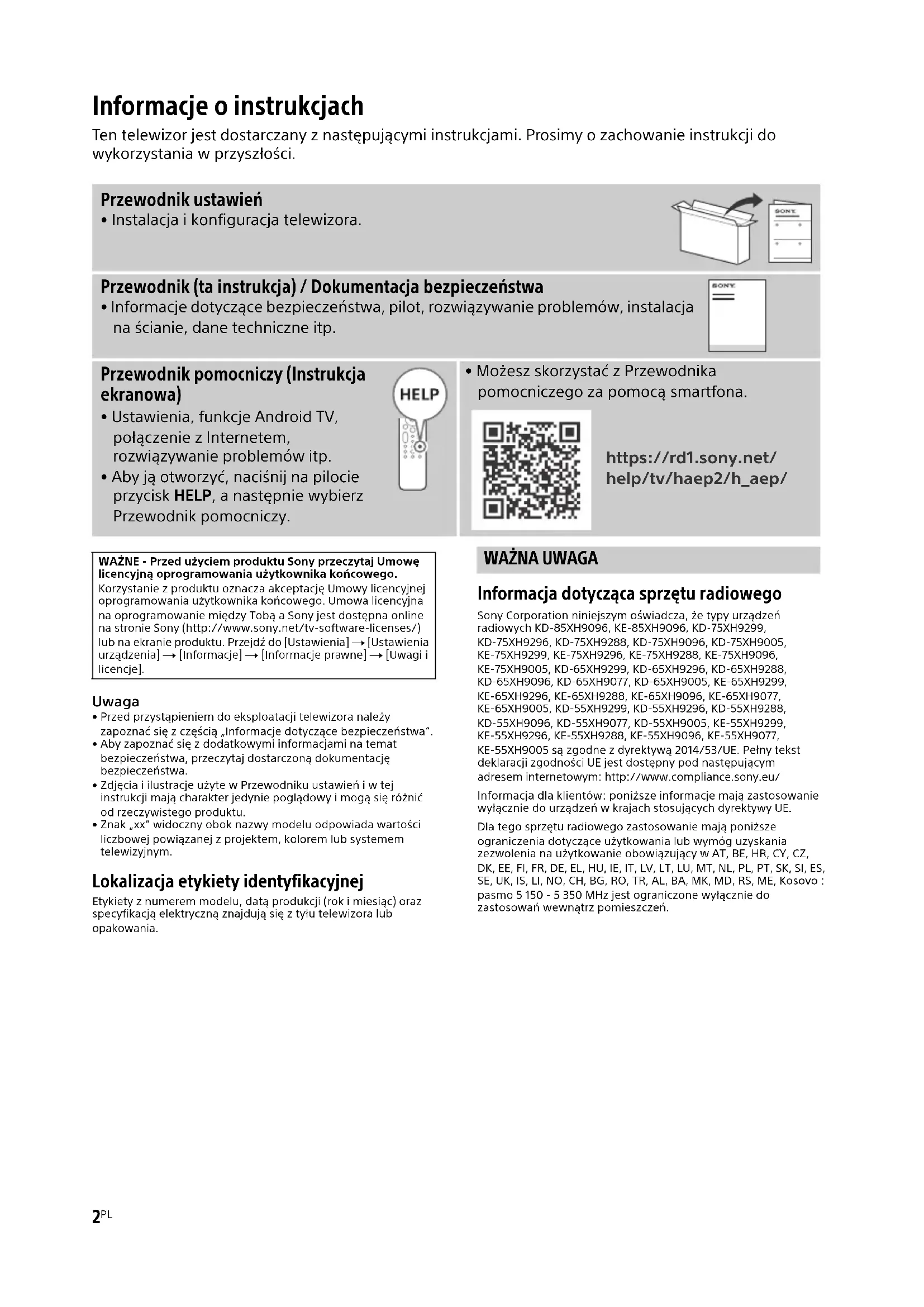 Informacja dotycząca sprzętu radiowego Sony Corporation niniejszym oświadcza, że typy urządzeń radiowych KD-85XH9096, KE-85XH9096, KD-75XH9299, KD-75XH9296, KD-75XH9288, KD-75XH9096, KD-75XH9005, KE-75XH9299, KE-75XH9296, KE-75XH9288, KE-75XH9096, KE-75XH9005, KD-65XH9299, KD-65XH9296, KD-65XH9288, KD-65XH9096, KD-65XH9077, KD-65XH9005, KE-65XH9299, KE-65XH9296, KE-65XH9288, KE-65XH9096, KE-65XH9077, KE-65XH9005, KD-55XH9299, KD-55XH9296, KD-55XH9288, KD-55XH9096, KD-55XH9077, KD-55XH9005, KE-55XH9299, KE-55XH9296, KE-55XH9288, KE-55XH9096, KE-55XH9077, KE-55XH9005 są zgodne z dyrektywą 2014/53/UE. Pełny tekst deklaracji zgodności UE jest dostępny pod następującym adresem internetowym: http://www.compliance.sony.eu/Informacja dla klientów: poniższe informacje mają zastosowanie wyłącznie do urządzeń w krajach stosujących dyrektywy UE.Dla tego sprzętu radiowego zastosowanie mają poniższe ograniczenia dotyczące użytkowania lub wymóg uzyskania zezwolenia na użytkowanie obowiązujący w AT, BE, HR, CY, CZ, DK, EE, FI, FR, DE, EL, HU, IE, IT, LV, LT, LU, MT, NL, PL, PT, SK, SI, ES, SE, UK, IS, LI, NO, CH, BG, RO, TR, AL, BA, MK, MD, RS, ME, Kosovo :pasmo 5 150 - 5 350 MHz jest ograniczone wyłącznie do zastosowań wewnątrz pomieszczeń. Informacje o instrukcjach Ten telewizor jest dostarczany z następującymi instrukcjami. Prosimy o zachowanie instrukcji do wykorzystania w przyszłości. Przewodnik ustawień