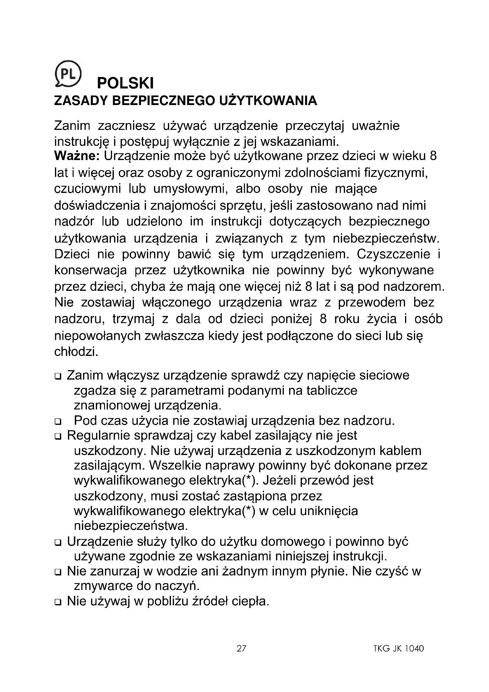 Zanim zaczniesz używać urządzenie przeczytaj uważnie instrukcję i postępuj wyłącznie z jej wskazaniami. Ważne: Urządzenie może być użytkowane przez dzieci w wieku 8 lat i więcej oraz osoby z ograniczonymi zdolnościami fizycznymi, czuciowymi lub umysłowymi, albo osoby nie mające doświadczenia i znajomości sprzętu, jeśli zastosowano nad nimi nadzór lub udzielono im instrukcji dotyczących bezpiecznego użytkowania urządzenia i związanych z tym niebezpieczeństw. Dzieci nie powinny bawić się tym urządzeniem. Czyszczenie i konserwacja przez użytkownika nie powinny być wykonywane przez dzieci, chyba że mają one więcej niż 8 lat i są pod nadzorem. Nie zostawiaj włączonego urządzenia wraz z przewodem bez nadzoru, trzymaj z dala od dzieci poniżej 8 roku życia i osób niepowołanych zwłaszcza kiedy jest podłączone do sieci lub się chłodzi. ❑ Zanim włączysz urządzenie sprawdź czy napięcie sieciowe zgadza się z parametrami podanymi na tabliczce znamionowej urządzenia. ❑ Pod czas użycia nie zostawiaj urządzenia bez nadzoru. ❑ Regularnie sprawdzaj czy kabel zasilający nie jest uszkodzony. Nie używaj urządzenia z uszkodzonym kablem zasilającym. Wszelkie naprawy powinny być dokonane przez wykwalifikowanego elektryka(*). Jeżeli przewód jest uszkodzony, musi zostać zastąpiona przez wykwalifikowanego elektryka(*) w celu uniknięcia niebezpieczeństwa. ❑ Urządzenie służy tylko do użytku domowego i powinno być używane zgodnie ze wskazaniami niniejszej instrukcji. ❑ Nie zanurzaj w wodzie ani żadnym innym płynie. Nie czyść w zmywarce do naczyń. ❑ Nie używaj w pobliżu źródeł ciepła.TKG JK 1040