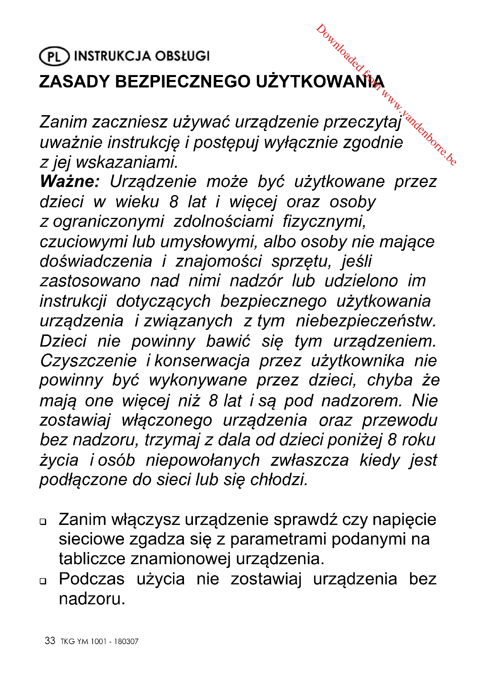 Zanim zaczniesz używać urządzenie przeczytaj uważnie instrukcję i postępuj wyłącznie zgodnie z jej wskazaniami. Ważne: Urządzenie może być użytkowane przez dzieci w wieku 8 lat i więcej oraz osoby z ograniczonymi zdolnościami fizycznymi, czuciowymi lub umysłowymi, albo osoby nie mające doświadczenia i znajomości sprzętu, jeśli zastosowano nad nimi nadzór lub udzielono im instrukcji dotyczących bezpiecznego użytkowania urządzenia i związanych z tym niebezpieczeństw. Dzieci nie powinny bawić się tym urządzeniem. Czyszczenie i konserwacja przez użytkownika nie powinny być wykonywane przez dzieci, chyba że mają one więcej niż 8 lat i są pod nadzorem. Nie zostawiaj włączonego urządzenia oraz przewodu bez nadzoru, trzymaj z dala od dzieci poniżej 8 roku życia i osób niepowołanych zwłaszcza kiedy jest podłączone do sieci lub się chłodzi. Zanim włączysz urządzenie sprawdź czy napięcie sieciowe zgadza się z parametrami podanymi na tabliczce znamionowej urządzenia. Podczas użycia nie zostawiaj urządzenia bez nadzoru. Downloaded from www.vandenborre.beCopies of the I/B. Please reproduce them without any changes except under special instruction from Team International BELGIUM. The pages must be reproduced and folded in order to obtain a booklet A5 (+/- 148.5 mm width x 210 mm height). When folding, make sure you keep the good numbering when you turn the pages of the I/B. Don’t change the page numbering. Keep the language integrity.