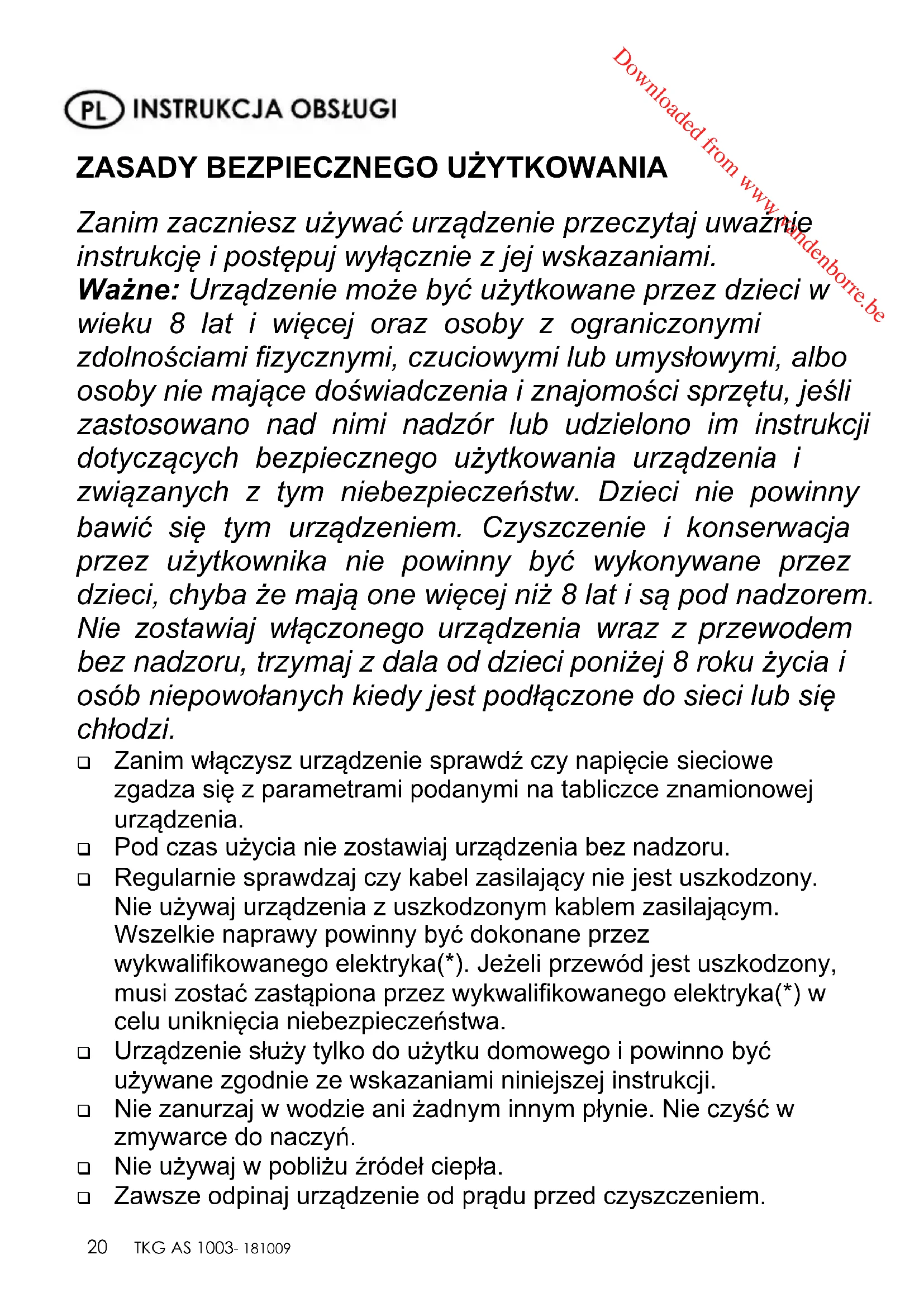 Zanim zaczniesz używać urządzenie przeczytaj uważnie instrukcję i postępuj wyłącznie z jej wskazaniami. Ważne: Urządzenie może być użytkowane przez dzieci w wieku 8 lat i więcej oraz osoby z ograniczonymi zdolnościami fizycznymi, czuciowymi lub umysłowymi, albo osoby nie mające doświadczenia i znajomości sprzętu, jeśli zastosowano nad nimi nadzór lub udzielono im instrukcji dotyczących bezpiecznego użytkowania urządzenia i związanych z tym niebezpieczeństw. Dzieci nie powinny bawić się tym urządzeniem. Czyszczenie i konserwacja przez użytkownika nie powinny być wykonywane przez dzieci, chyba że mają one więcej niż 8 lat i są pod nadzorem. Nie zostawiaj włączonego urządzenia wraz z przewodem bez nadzoru, trzymaj z dala od dzieci poniżej 8 roku życia i osób niepowołanych kiedy jest podłączone do sieci lub się chłodzi. ❑ Zanim włączysz urządzenie sprawdź czy napięcie sieciowe zgadza się z parametrami podanymi na tabliczce znamionowej urządzenia. ❑ Pod czas użycia nie zostawiaj urządzenia bez nadzoru. ❑ Regularnie sprawdzaj czy kabel zasilający nie jest uszkodzony. Nie używaj urządzenia z uszkodzonym kablem zasilającym. Wszelkie naprawy powinny być dokonane przez wykwalifikowanego elektryka(*). Jeżeli przewód jest uszkodzony, musi zostać zastąpiona przez wykwalifikowanego elektryka(*) w celu uniknięcia niebezpieczeństwa. ❑ Urządzenie służy tylko do użytku domowego i powinno być używane zgodnie ze wskazaniami niniejszej instrukcji. ❑ Nie zanurzaj w wodzie ani żadnym innym płynie. Nie czyść w zmywarce do naczyń. ❑ Nie używaj w pobliżu źródeł ciepła. ❑ Zawsze odpinaj urządzenie od prądu przed czyszczeniem. Downloaded from www.vandenborre.beCopies of the I/B. Please reproduce them without any changes except under special instruction from Team International BELGIUM. The pages must be reproduced and folded in order to obtain a booklet A5 (+/- 148.5 mm width x 210 mm height). When folding, make sure you keep the good numbering when you turn the pages of the I/B. Don’t change the page numbering. Keep the language integrity.
