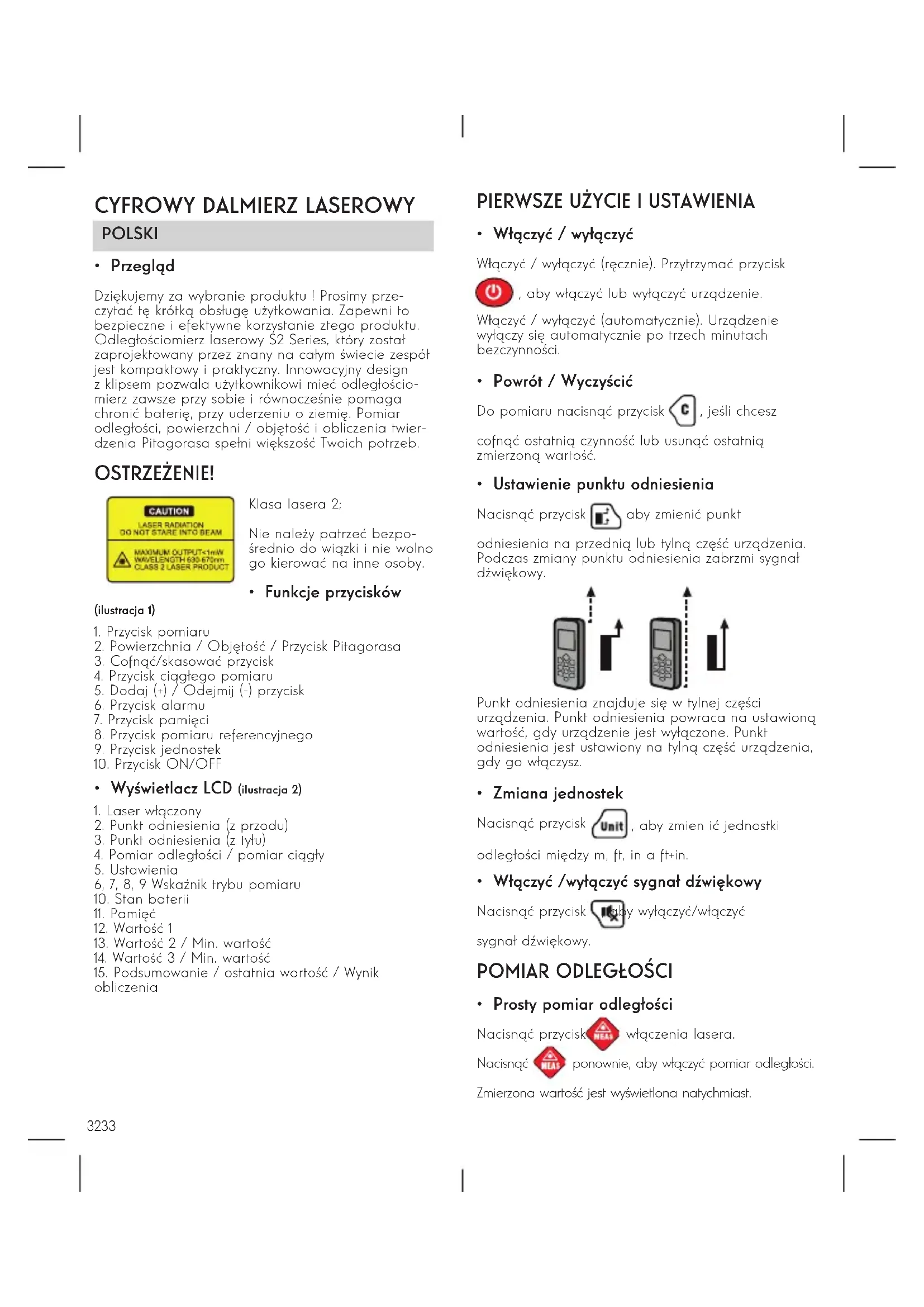 - Przegląd Dziękujemy za wybranie produktu ! Prosimy prze- czytać tę krótką obsługę użytkowania. Zapewni to bezpieczne i efektywne korzystanie ztego produktu. Odległościomierz laserowy S2 Series, który został zaprojektowany przez znany na całym świecie zespół jest kompaktowy i praktyczny. Innowacyjny design z klipsem pozwala użytkownikowi mieć odległościo- mierz zawsze przy sobie i równocześnie pomaga chronić baterię, przy uderzeniu o ziemię. Pomiar odległości, powierzchni / objętość i obliczenia twier- dzenia Pitagorasa spełni większość Twoich potrzeb. OSTRZEŻENIE!