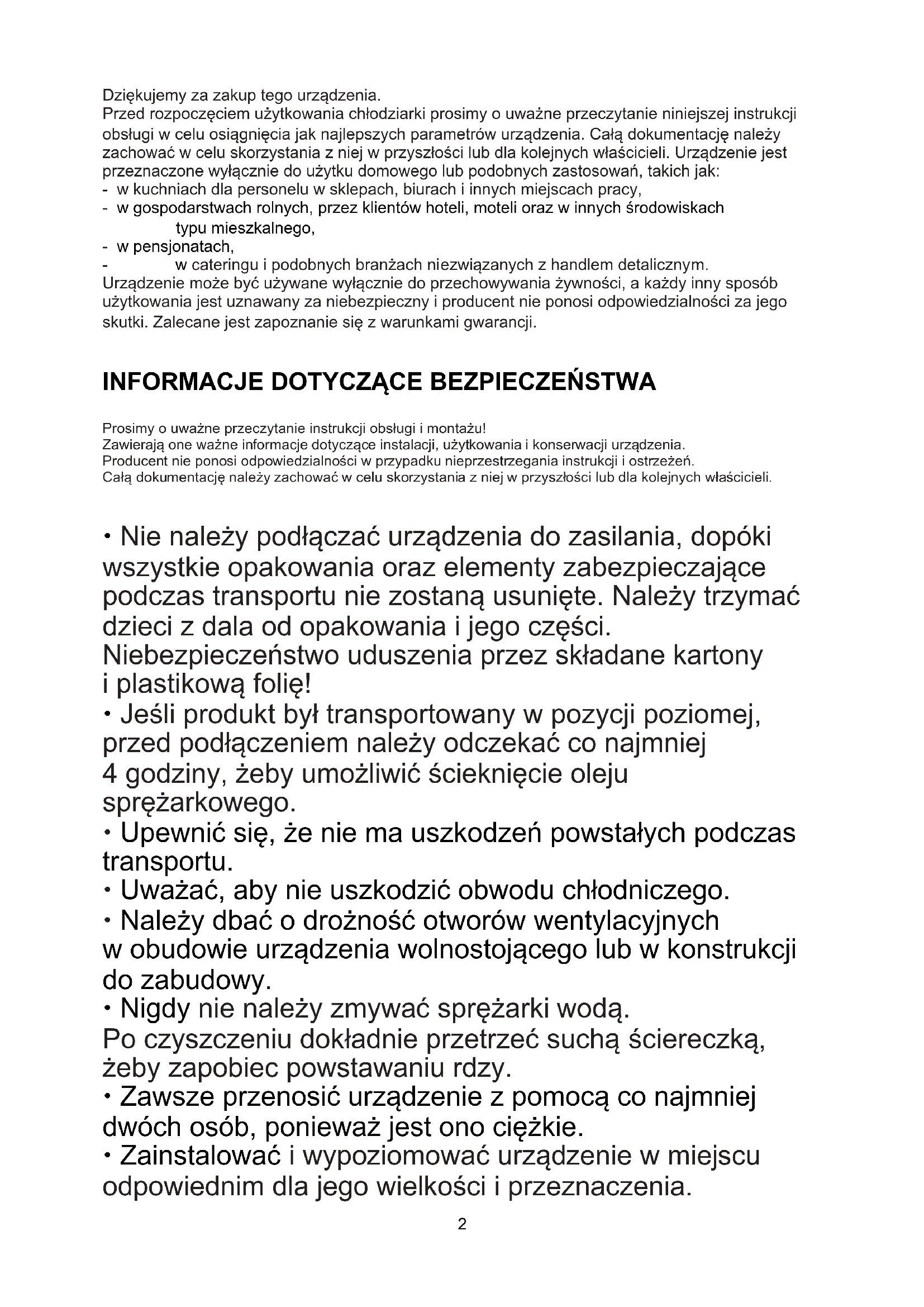 Dziękujemy za zakup tego urządzenia. Przed rozpoczęciem użytkowania chłodziarki prosimy o uważne przeczytanie niniejszej instrukcji obsługi w celu osiągnięcia jak najlepszych parametrów urządzenia. Całą dokumentację należy zachować w celu skorzystania z niej w przyszłości lub dla kolejnych właścicieli. Urządzenie jest przeznaczone wyłącznie do użytku domowego lub podobnych zastosowań, takich jak: - w kuchniach dla personelu w sklepach, biurach i innych miejscach pracy, - w gospodarstwach rolnych, przez klientów hoteli, moteli oraz w innych środowiskach typu mieszkalnego, - w pensjonatach, - w cateringu i podobnych branżach niezwiązanych z handlem detalicznym. Urządzenie może być używane wyłącznie do przechowywania żywności, a każdy inny sposób użytkowania jest uznawany za niebezpieczny i producent nie ponosi odpowiedzialności za jego skutki. Zalecane jest zapoznanie się z warunkami gwarancji.
