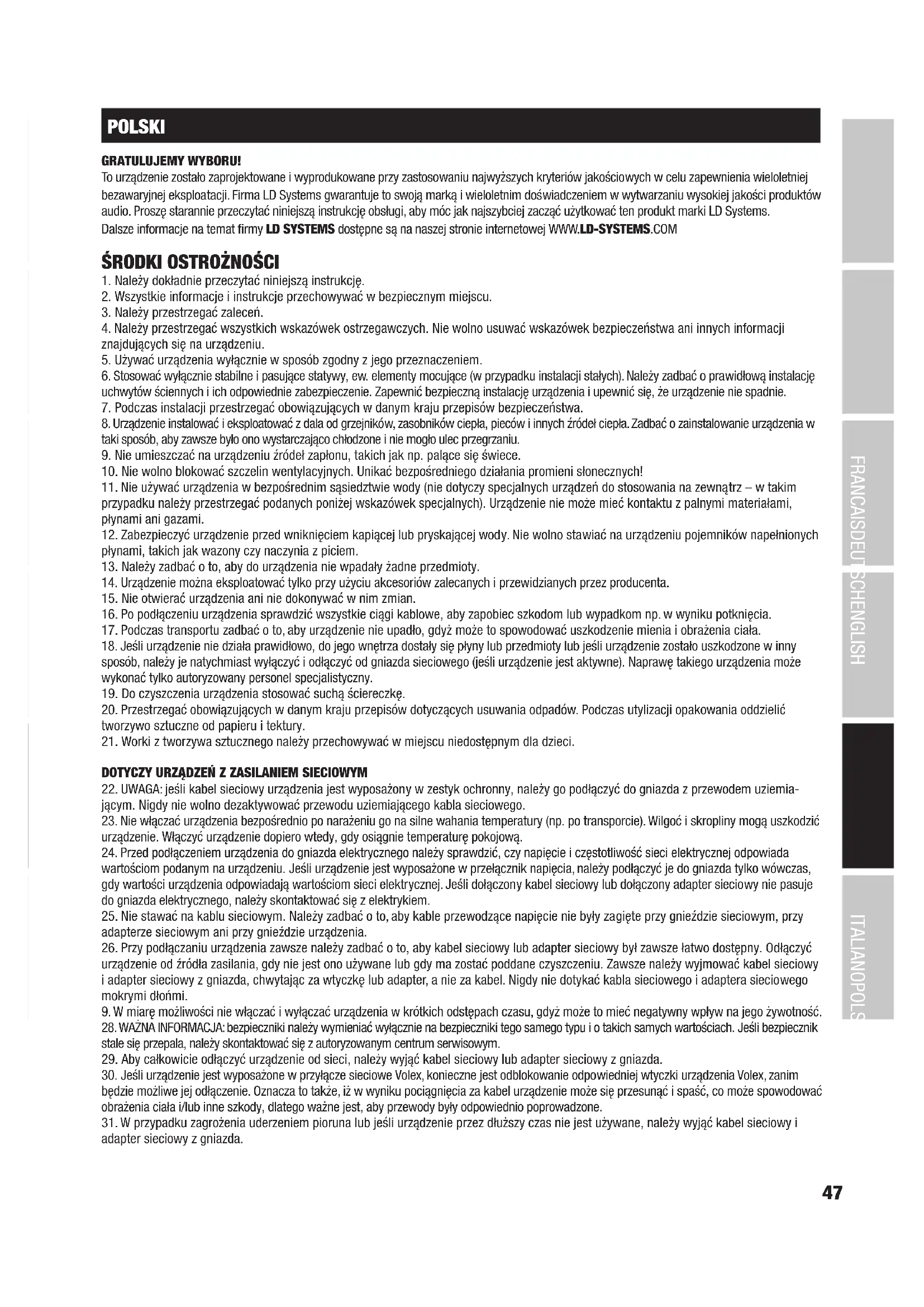 To urzadzenie zostalo zaprojektowane i wyprodukowane przy zastosowaniu najwyszych kryteriow jakosciych w celu zapewnienia wieleotnie bezawarynej eksploatacji. Firma LD Systems gwarantuje to swoja marki wieloletnim doswiadczemiw wytlwarzaniu wysockiej jakosci produktow audio. Prosze starannie przycztyacniniejsza instrukcje obslugui, aby moc jak najszybciej zaczac uzytkowac ten produkt marki LD Systems.