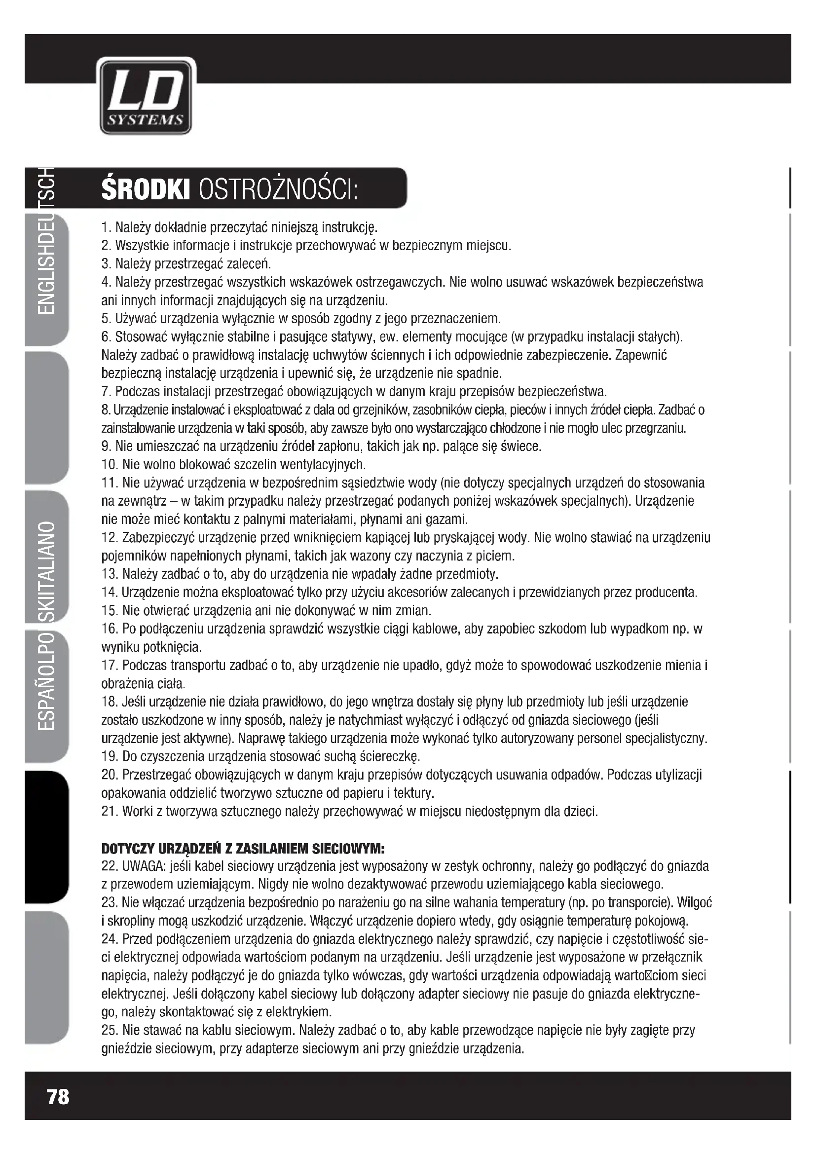 22. UWAGA: jeśli kabel sieciowy urządzenia jest wyposażony w zestyk ochronny, należy go podłączyć do gniazda
