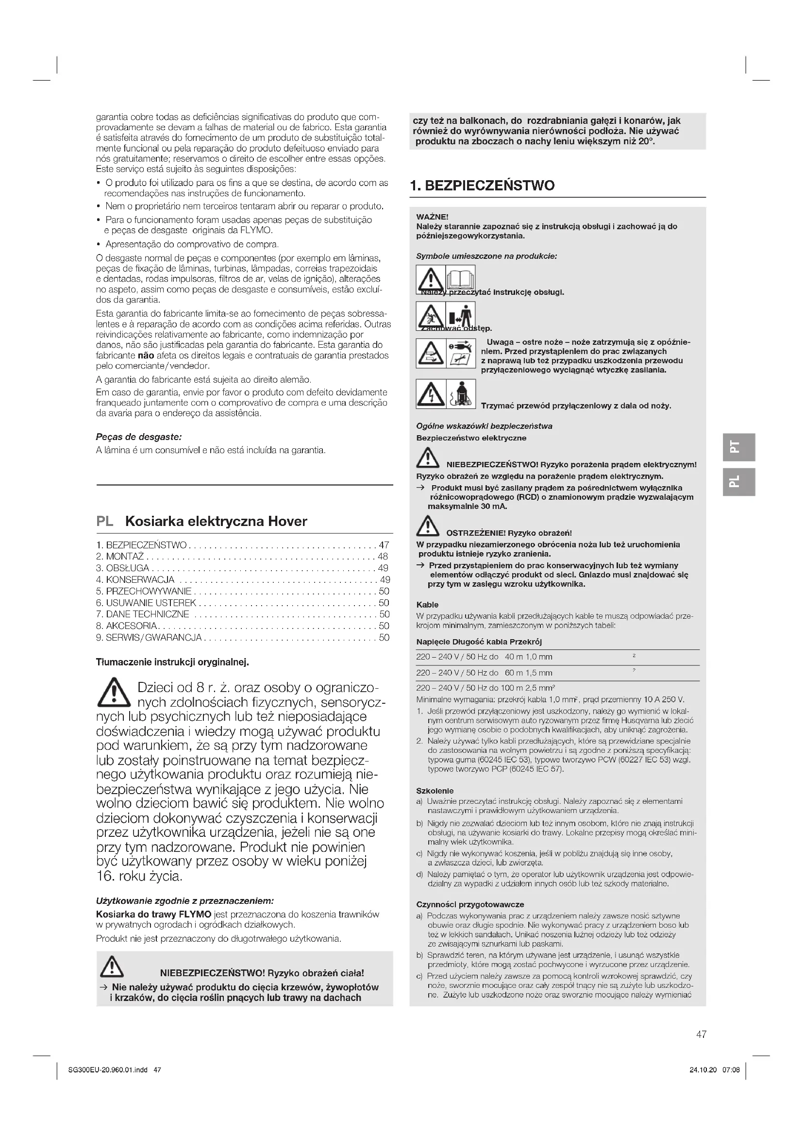 ) Wyłączyć silnik i wyciągnąć kluczyk z gniazda. Upewnić się, że wszystkie ruchome części całkowicie się zatrzymały: – zawsze, odchodząc od kosiarki do trawy; – przed zwolnieniem blokad lub też przystąpieniem do usuwania zatorów w kanale wyrzutowym; – przed przystąpieniem do sprawdzania, czyszczenia lub też wykonywania innych prac przy kosiarce do trawy; – w razie trafienia na ciało obce. Przed ponownym uruchomieniem i podjęciem pracy z użyciem kosiarki do trawy należy sprawdzić kosiarkę do trawy pod względem uszkodzeń i wykonać nie zbędne naprawy. Jeśli kosiarka do trawy zaczyna wibrować silnie w nietypowy sposób, konieczne jest jej natychmiastowe sprawdzenie: – poszukać uszkodzeń; – wykonać niezbędne naprawy uszkodzonych części; – zadbać o to, aby wszystkie nakrętki sworznie i śruby były mocno dokręcone. Konserwacja i przechowywanie a) Zadbać o to, aby wszystkie nakrętki sworznie i śruby były mocno dokręcone oraz aby urządzenie umożliwiało bezpieczne wykonywanie pracy. b) Sprawdzać regularnie pojemnik na skoszoną trawę pod względem zużycia lub też utraty sprawności działania. c) Ze względów bezpieczeństwa wymienić zużyte lub uszkodzone części. d) Zwracać uwagę na to, że w przypadku urządzeń z wieloma nożami ruch jednego noża może prowadzić do obrotu pozostałych noży. e) Podczas regulacji urządzenia zwracać uwagę na to, aby nie zakleszczyć palców pomiędzy ruchomymi nożami oraz stałymi elementami urządzenia. f) Przed odstawieniem urządzenia umożliwić ostygnięcie silnika. g) Podczas konserwacji noży zwracać uwagę na to, że nawet wtedy, gdy źródło napięcia, jest odłączone, noże mogą się poruszać. h) Używać wyłącznie oryginalnych części zamiennych oraz akcesoriów. Dodatkowe wskazówki bezpieczeństwa Bezpieczeństwo elektryczne NIEBEZPIECZEŃSTWO! Zatrzymanie akcji serca! Podczas pracy produkt wytwarza pole elektromagnetyczne. Wokreślo- nych warunkach pole to może oddziaływać na aktywne ipasywne implan- ty medyczne. Aby uniknąć ryzyka poważnych lub śmiertelnych obrażeń ciała, zalecamy osobom posiadającym implanty medyczne przedużyciem produktu skontaktować się zlekarzem lub producentem implantu. Przed użyciem sprawdzić kabel pod względem oznak uszkodzenia lub zużycia. Jeśli przewód jest uszkodzony, należy skontaktować się z autoryzowanym cen- trum serwisowym w celu wymiany przewodu. Nie używać produktu, jeśli kable elektryczne są uszkodzone lub zużyte. Jeśli kabel jest przecięty lub jeśli izolacja jest uszkodzona, należy go natychmiast odłączyć od zasilania. Kabla elektrycznego można dotykać dopiero wtedy, gdy zostanie odłączony od zasilania. Nie naprawiać przeciętego lub uszkodzonego kabla. Wymienić kabel na nowy. Kabel przedłużający należy odwinąć w celu użycia. Nawinięte kable mogą się przegrzewać i ograniczać w ten sposób wydajność kosiarki do trawników. Trzymać kabel przedłużający z dala od produktu. Wykonywać prace zawsze z dala od źródła prądu, poruszając się w jedną i w drugą stronę, nigdy zaś ruchem kolistym. Nigdy nie przeciągać kabla przez ostre przedmioty. Przed odłączeniem wtyczki, kabla lub też kabla przedłużającego zawsze wyłączyć zasilanie. Wyłączyć silnik, wyciągnąć wtyczkę z gniazda sieciowego i sprawdzić kabel pod względem uszkodzeń lub zużycia, zanim zostanie on ponownie nawinięty w celu schowania. W żadnym wypadku nie naprawiać uszkodzonego kabla. Wymienić kabel na nowy. Używać tylko oryginalnych kabli zamiennych. Zawsze nawijać kabel starannie i unikać zgięć. Nigdy nie przenosić produktu, trzymając za kabel. Nie ciągnąć za kabel w celu odłączenia wtyczki. Używać produktu tylko z podanym na tabliczce znamionowej produktu napięciem przemiennym sieci zasilającej. Nasze produkty są izolowane podwójnie zgodnie z normą EN 60335. Nie podłą- czać masy do żadnej części produktu. Sprawdzić obszar roboczy pod względem ukrytych kabli. Nie używać produktu do pielęgnacji stawów lub też w pobliżu wody. Bezpieczeństwo osobiste NIEBEZPIECZEŃSTWO! Ryzyko uduszenia! Istnieje ryzyko połknięcia drobnych części. Wprzypadku małych dzieci istnieje ryzyko uduszenia plastikową torebką. Dzieci należy trzymać zdala od miejsca montażu produktu. Przed przechowywaniem lub konserwacją poczekać co najmniej 30 minut, aż kosiarka ostygnie. W razie zablokowania elementu tnącego zatrzymać i sprawdzić produkt. Nie przechylać urządzenia w kierunku użytkownika. Nie jechać wstecz. W trakcie pracy zachować ostrożność. Nigdy nie używać produktu w miejscach, w których występuje zagrożenie wybuchem. Nie wolno używać produktu, jeśli operator jest zmęczony, chory, pod wpływem alkoholu, środków odurzających lub lekarstw. Unikać przeciążenia kosiarki do trawy. Nosić rękawice, obuwie antypoślizgowe oraz okulary ochronne. Nie należy używać produktu w wilgotnych warunkach. Nie używać na mokrej trawie. Nie demontować produktu w zakresie wykraczającym poza zakres dostawy. Uruchamiać kosiarkę do trawy tylko z prosto zamonto wanym uchwytem. Nie używać dźwigni uruchamiających naprzemiennie. Ostrożnie używać uchwytów. Wyłącznik bezpieczeństwa Silnik jest chroniony przez wyłącznik bezpieczeństwa, który włącza się, gdy nastąpi zakleszczenie noża lub też przeciążenie silnika. W takim wypadku należy zatrzymać produkt i odłączyć go od zasilania. Wyłącznik bezpie czeństwa jest resetowany dopiero wtedy, gdy zostanie zwolniona dźwignia Start/Stop. Przed dalszym użyciem produktu usunąć wszystkie przeszkody i zaczekać kilka minut, aż wyłącznik bezpieczeństwa zostanie zreseto wany.