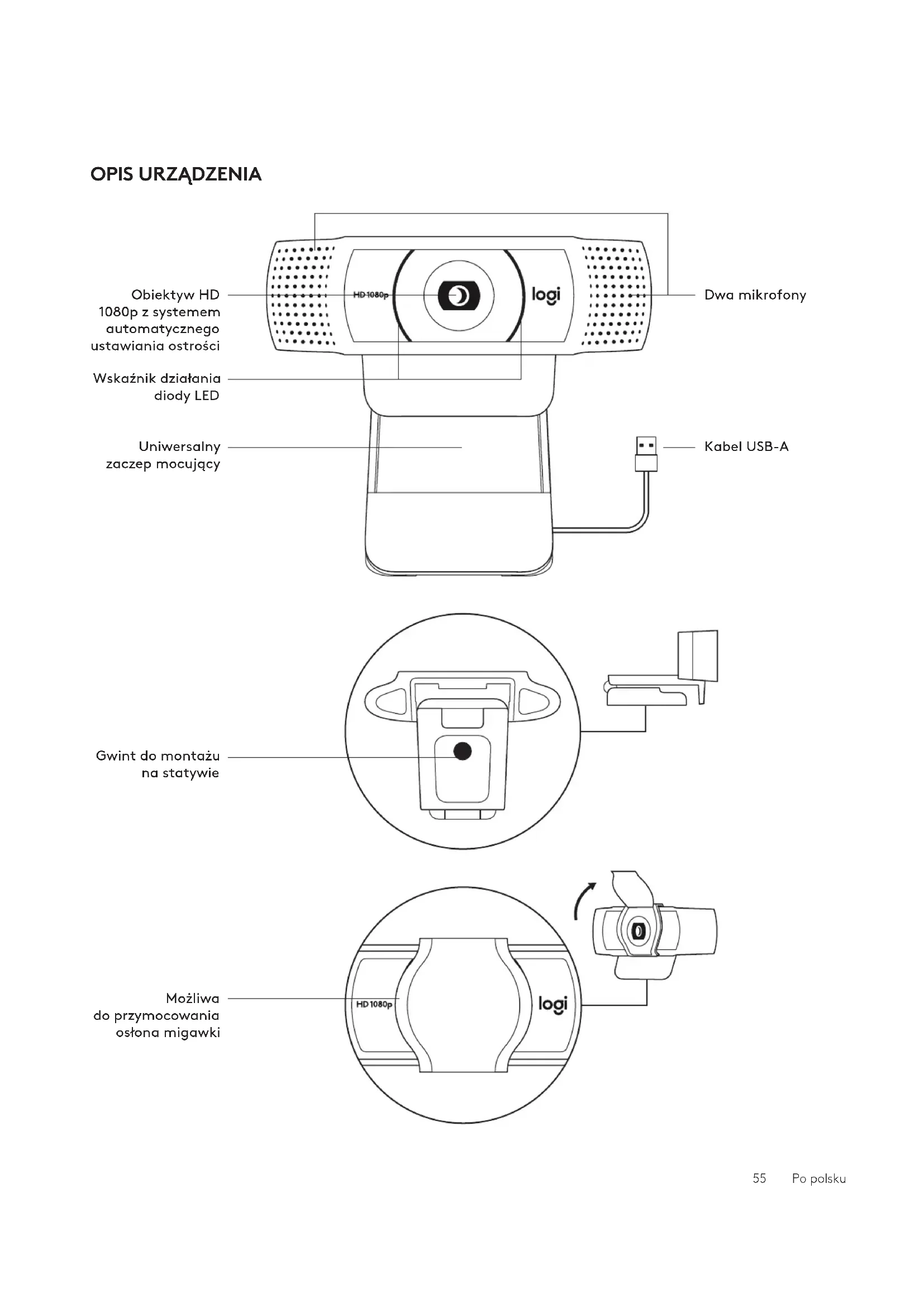 Dwa mikrofony 55 Po polskuMONTOWANIE OSŁONY MIGAWKI 1 Załóż zewnętrzną osłonę migawki, lokalizując obiektyw na kamerze internetowej. ZAWARTOŚĆ ZESTAWU 1 Kamera internetowa z dołączonym kablem USB-A o długości 1,5 m (5 stóp) 2 Osłona migawki 3 Dokumentacja produktu USB-A 2 Zatrzaśnij ją z przodu kamery internetowej, bezpośrednio na środku. 3 Ręcznie ustawi osłonę migawki tak, aby się otwierała lub zamykała w zależności od potrzeb. 56 Po polskuPRZYGOTOWYWANIE KAMERY INTERNETOWEJ W celu umieszczenia na monitorze 1 Umieść kamerę internetową na komputerze, laptopie lub monitorze pod kątem, który Ci odpowiada. W celu umieszczenia na statywie* 1 Zlokalizować gwint do montażu na statywie ¼” na dole uniwersalnego zaczepu mocującego. 2 Dostosuj kamerę internetową, aby upewnić się, że stopa na uniwersalnym zaczepie mocującym znajdowała się na równi z tylną częścią urządzenia. 3 Ręcznie wyreguluj kamerę internetową wgórę/w dół w celu uzyskania jak najlepszej pozycji do wykadrowania siebie. 2 Zamocuj kamerę internetową na statywie poprzez wkręcenie jej w gwint ¼ cala. 3 Umieść kamerę internetową ze statywem, abyuzyskać najlepszą pozycję do kadrowania.