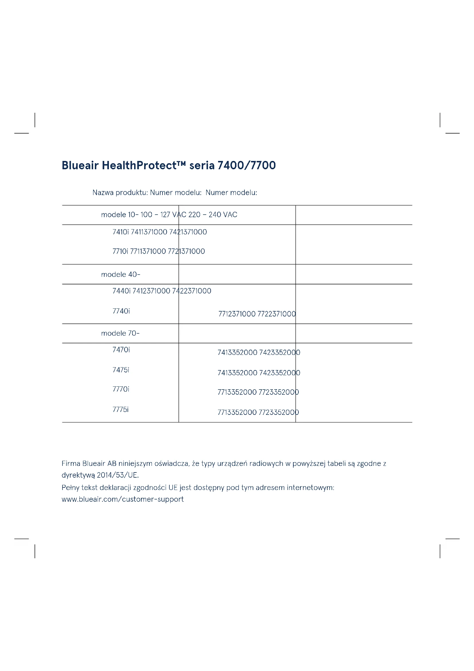 In overeenstemming met ANSI/AHAM AC-1-2019147Firma Blueair AB niniejszym oświadcza, że typy urządzeń radiowych w powyższej tabeli są zgodne z dyrektywą 2014/53/UE. Pełny tekst deklaracji zgodności UE jest dostępny pod tym adresem internetowym: www.blueair.com/customer-support Nazwa produktu: Numer modelu: Numer modelu: modele 10- 100 – 127 VAC 220 – 240 VAC 7410i 7411371000 7421371000 7710i 7711371000 7721371000 modele 40- 7440i 7412371000 7422371000 7740i
