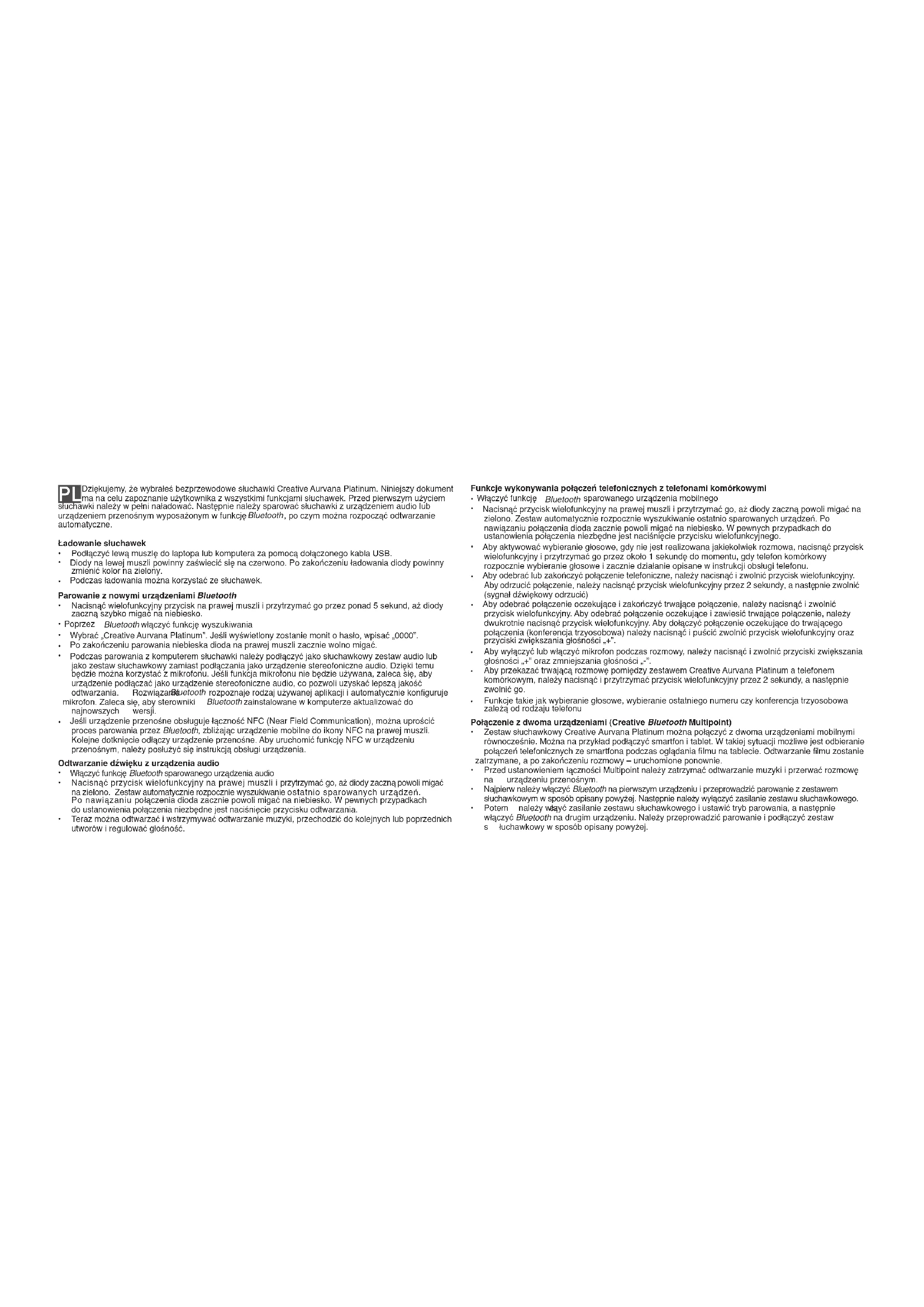- Uten ANCPL Dziękujemy, że wybrałeś bezprzewodowe słuchawki Creative Aurvana Platinum. Niniejszy dokument ma na celu zapoznanie użytkownika z wszystkimi funkcjami słuchawek. Przed pierwszym użyciem słuchawki należy w pełni naładować. Następnie należy sparować słuchawki z urządzeniem audio lub urządzeniem przenośnym wyposażonym w funkcję Bluetooth , po czym można rozpocząć odtwarzanie automatyczne. Ładowanie słuchawek