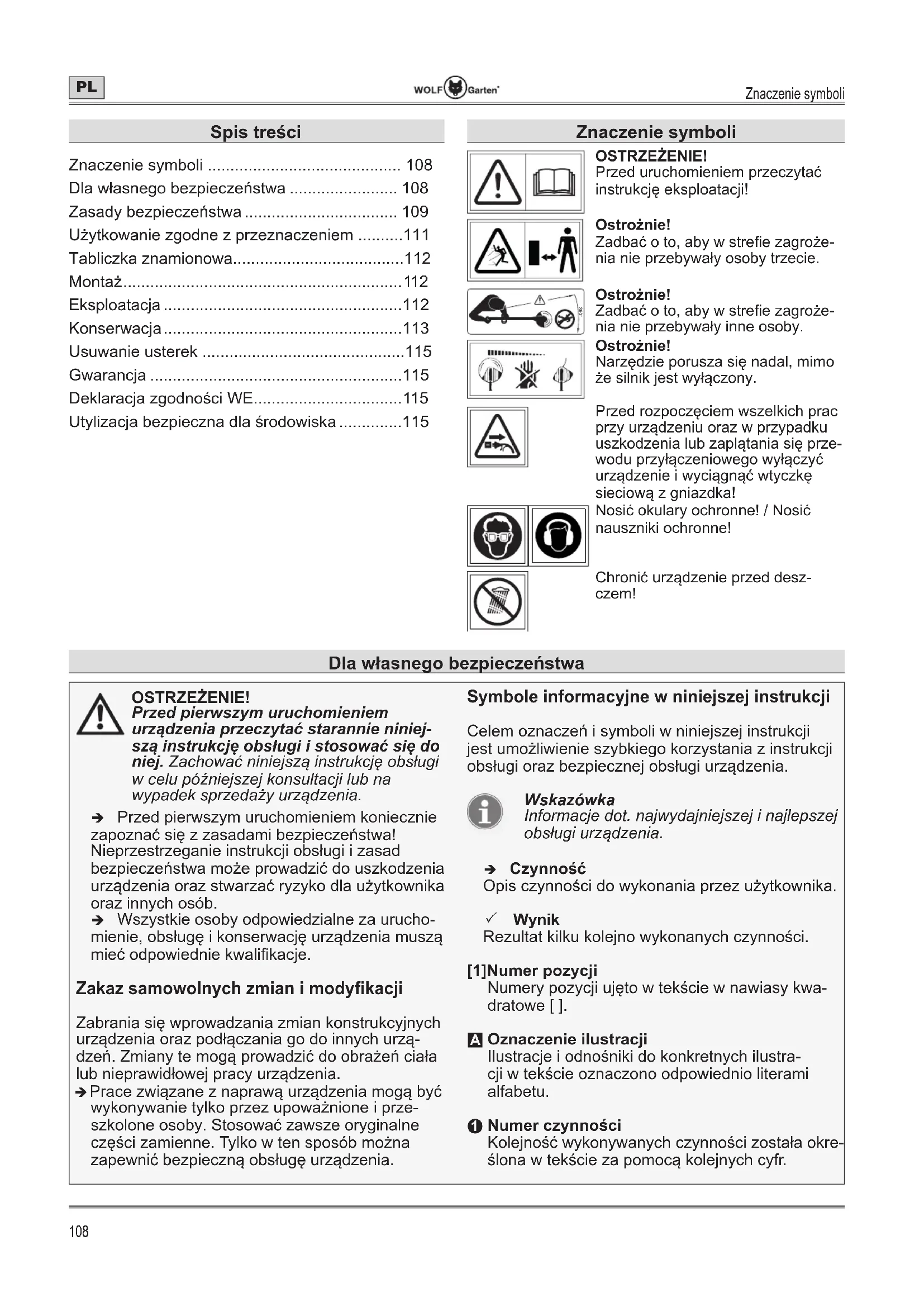- Numer czynnoĞci KolejnoĞü wykonywanych czynnoĞci zostaáa okre- Ğlona w tekĞcie za pomocą kolejnych cyfr. Dla wáasnego bezpieczeĔstwa Znaczenie symboli OSTRZEĩENIE! Przed uruchomieniem przeczytaü instrukcjĊ eksploatacji! OstroĪnie! Zadbaü o to, aby w stre¿e zagroĪe- nia nie przebywaáy osoby trzecie. 360° OstroĪnie! Zadbaü o to, aby w stre¿e zagroĪe- nia nie przebywaáy inne osoby. OstroĪnie! NarzĊdzie porusza siĊ nadal, mimo Īe silnik jest wyáączony. Przed rozpoczĊciem wszelkich prac przy urządzeniu oraz w przypadku uszkodzenia lub zaplątania siĊ prze- wodu przyáączeniowego wyáączyü urządzenie i wyciągnąü wtyczkĊ sieciową z gniazdka! Nosiü okulary ochronne! / Nosiü nauszniki ochronne! Chroniü urządzenie przed desz- czem! Spis treĞci Znaczenie symboli p. 108