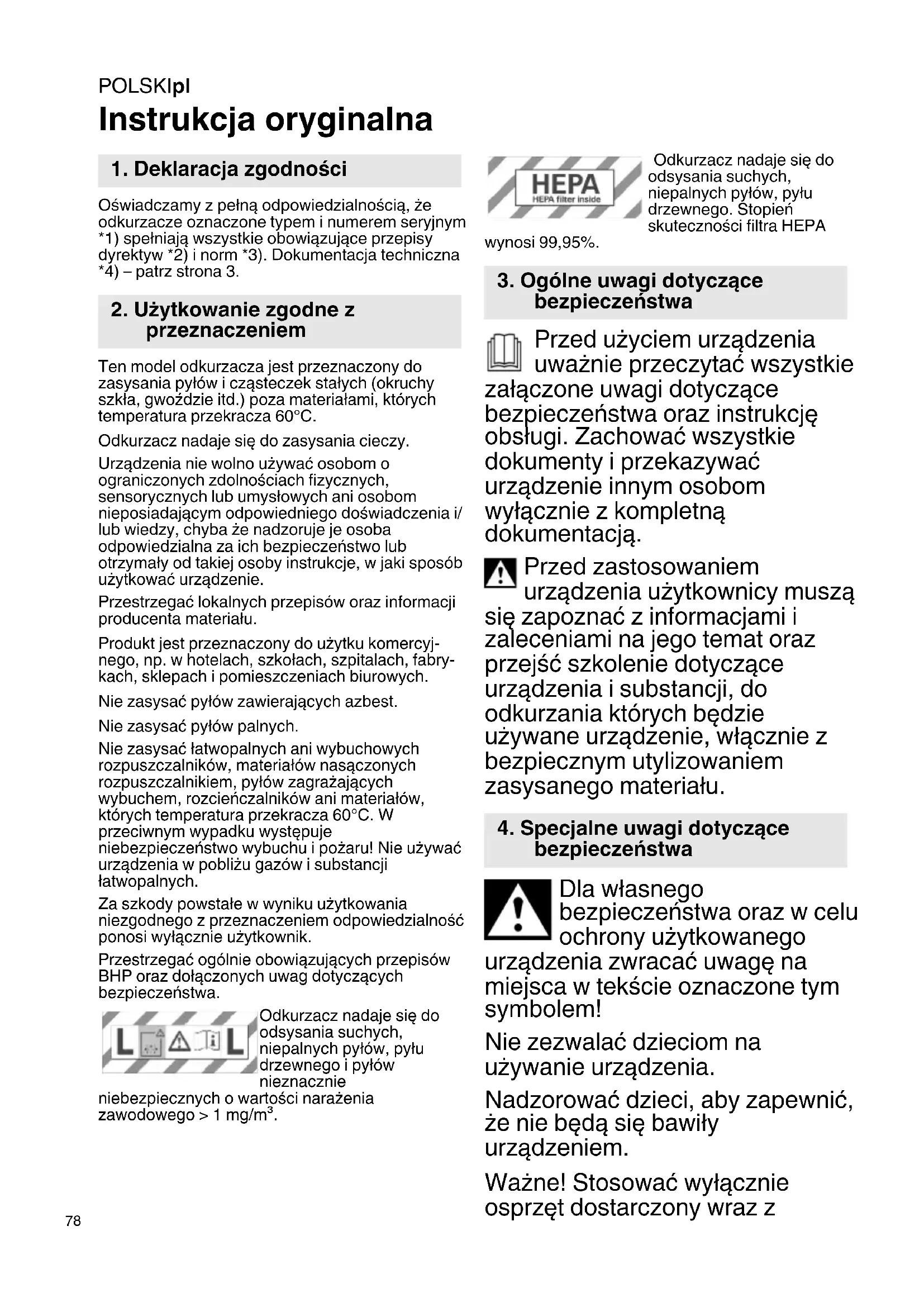 Instrukcja oryginalna Oświadczamy z pełną odpowiedzialnością, że odkurzacze oznaczone typem i numerem seryjnym *1) spełniają wszystkie obowiązujące przepisy dyrektyw *2) i norm *3). Dokumentacja techniczna *4) – patrz strona 3. Ten model odkurzacza jest przeznaczony do zasysania pyłów i cząsteczek stałych (okruchy szkła, gwoździe itd.) poza materiałami, których temperatura przekracza 60°C. Odkurzacz nadaje się do zasysania cieczy. Urządzenia nie wolno używać osobom o ograniczonych zdolnościach fizycznych, sensorycznych lub umysłowych ani osobom nieposiadającym odpowiedniego doświadczenia i/ lub wiedzy, chyba że nadzoruje je osoba odpowiedzialna za ich bezpieczeństwo lub otrzymały od takiej osoby instrukcje, w jaki sposób użytkować urządzenie. Przestrzegać lokalnych przepisów oraz informacji producenta materiału. Produkt jest przeznaczony do użytku komercyj- nego, np. w hotelach, szkołach, szpitalach, fabry- kach, sklepach i pomieszczeniach biurowych. Nie zasysać pyłów zawierających azbest. Nie zasysać pyłów palnych. Nie zasysać łatwopalnych ani wybuchowych rozpuszczalników, materiałów nasączonych rozpuszczalnikiem, pyłów zagrażających wybuchem, rozcieńczalników ani materiałów, których temperatura przekracza 60°C. W przeciwnym wypadku występuje niebezpieczeństwo wybuchu i pożaru! Nie używać urządzenia w pobliżu gazów i substancji łatwopalnych. Za szkody powstałe w wyniku użytkowania niezgodnego z przeznaczeniem odpowiedzialność ponosi wyłącznie użytkownik. Przestrzegać ogólnie obowiązujących przepisów BHP oraz dołączonych uwag dotyczących bezpieczeństwa. Odkurzacz nadaje się do odsysania suchych, niepalnych pyłów, pyłu drzewnego i pyłów nieznacznie niebezpiecznych o wartości narażenia zawodowego > 1 mg/m³. Odkurzacz nadaje się do odsysania suchych, niepalnych pyłów, pyłu drzewnego. Stopień skuteczności filtra HEPA wynosi 99,95%. Przed użyciem urządzenia uważnie przeczytać wszystkie załączone uwagi dotyczące bezpieczeństwa oraz instrukcję obsługi. Zachować wszystkie dokumenty i przekazywać urządzenie innym osobom wyłącznie z kompletną dokumentacją. Przed zastosowaniem urządzenia użytkownicy muszą się zapoznać z informacjami i zaleceniami na jego temat oraz przejść szkolenie dotyczące urządzenia i substancji, do odkurzania których będzie używane urządzenie, włącznie z bezpiecznym utylizowaniem zasysanego materiału. Dla własnego bezpieczeństwa oraz w celu ochrony użytkowanego urządzenia zwracać uwagę na miejsca w tekście oznaczone tym symbolem! Nie zezwalać dzieciom na używanie urządzenia. Nadzorować dzieci, aby zapewnić, że nie będą się bawiły urządzeniem. Ważne! Stosować wyłącznie osprzęt dostarczony wraz z