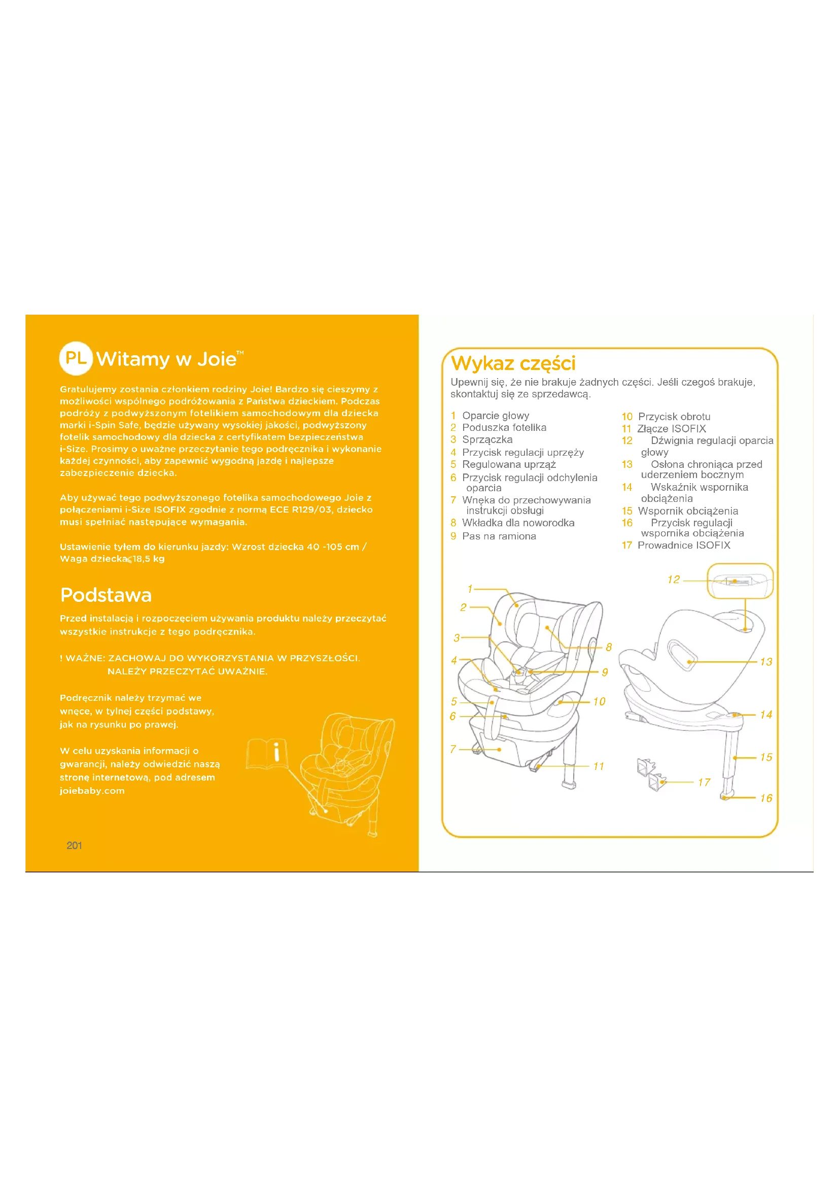 Gratulujemy zostania członkiem rodziny Joie! Bardzo się cieszymy z możliwości wspólnego podróżowania z Państwa dzieckiem. Podczas podróży z podwyższonym fotelikiem samochodowym dla dziecka marki i-Spin Safe, będzie używany wysokiej jakości, podwyższony fotelik samochodowy dla dziecka z certyfikatem bezpieczeństwa i-Size. Prosimy o uważne przeczytanie tego podręcznika i wykonanie każdej czynności, aby zapewnić wygodną jazdę i najlepsze zabezpieczenie dziecka.Aby używać tego podwyższonego fotelika samochodowego Joie z połączeniami i-Size ISOFIX zgodnie z normą ECE R129/03, dziecko musi spełniać następujące wymagania.Ustawienie tyłem do kierunku jazdy: Wzrost dziecka 40 -105 cm / Waga dziecka18,5 kg Podstawa Przed instalacją i rozpoczęciem używania produktu należy przeczytać wszystkie instrukcje z tego podręcznika.! WAŻNE: ZACHOWAJ DO WYKORZYSTANIA W PRZYSZŁOŚCI.NALEŻY PRZECZYTAĆ UWAŻNIE.Podręcznik należy trzymać we wnęce, w tylnej części podstawy, jak na rysunku po prawej.W celu uzyskania informacji o gwarancji, należy odwiedzić naszą stronę internetową, pod adresem joiebaby.com Wykaz części 1 Oparciegłowy2 Poduszkafotelika3 Sprzączka4 Przyciskregulacjiuprzęży5 Regulowanauprząż6 Przyciskregulacjiodchyleniaoparcia7 Wnękadoprzechowywaniainstrukcjiobsługi8 Wkładkadlanoworodka9 Pasnaramiona10 Przyciskobrotu11 ZłączeISOFIX12 Dźwigniaregulacjioparciagłowy13 Osłonachroniącaprzeduderzeniembocznym14 Wskaźnikwspornikaobciążenia15 Wspornikobciążenia16 Przyciskregulacjiwspornikaobciążenia17 ProwadniceISOFIXUpewnijsię,żeniebrakujeżadnychczęści.Jeśliczegośbrakuje,skontaktujsięzesprzedawcą.