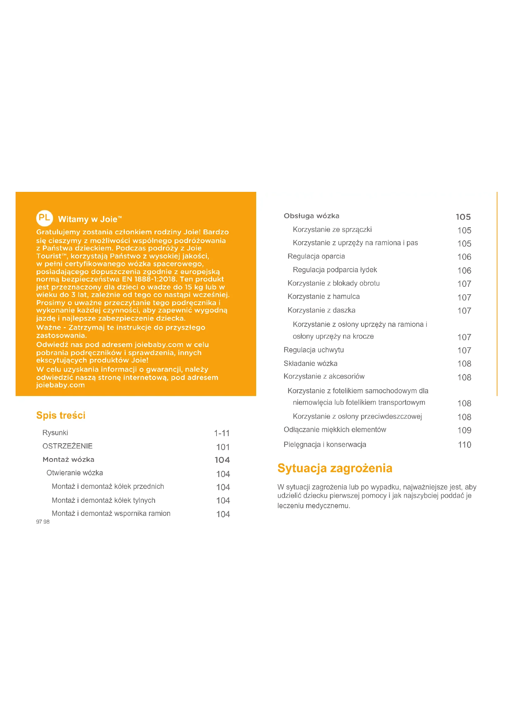 Gratulujemy zostania członkiem rodziny Joie! Bardzo się cieszymy z możliwości wspólnego podróżowania z Państwa dzieckiem. Podczas podróży z Joie Tourist™, korzystają Państwo z wysokiej jakości, w pełni certyfikowanego wózka spacerowego, posiadającego dopuszczenia zgodnie z europejską normą bezpieczeństwa EN 1888-1:2018. Ten produkt jest przeznaczony dla dzieci o wadze do 15 kg lub w wieku do 3 lat, zależnie od tego co nastąpi wcześniej. Prosimy o uważne przeczytanie tego podręcznika i wykonanie każdej czynności, aby zapewnić wygodną jazdę i najlepsze zabezpieczenie dziecka. Ważne - Zatrzymaj te instrukcje do przyszłego zastosowania. Odwiedź nas pod adresem joiebaby.com w celu pobrania podręczników i sprawdzenia, innych ekscytujących produktów Joie! W celu uzyskania informacji o gwarancji, należy odwiedzić naszą stronę internetową, pod adresem joiebaby.com Spis treści Rysunki 1-11 OSTRZEŻENIE