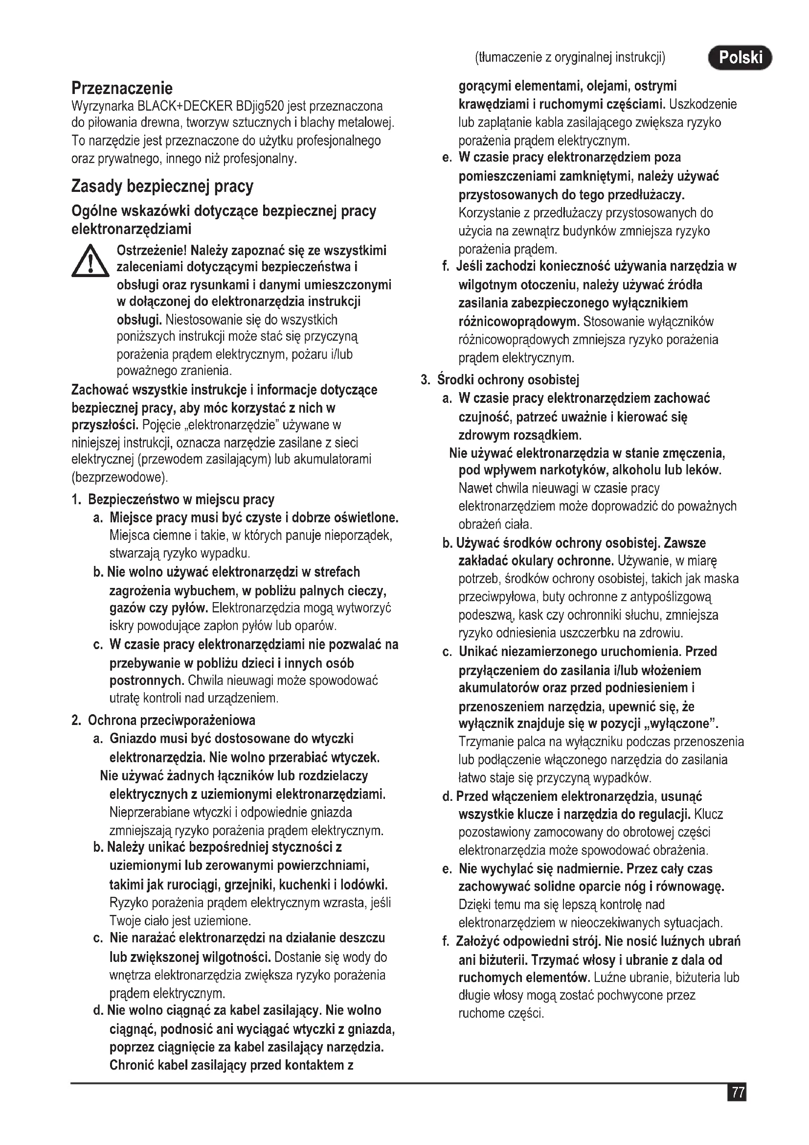 (tłumaczenie z oryginalnej instrukcji) Polski (tłumaczenie z oryginalnej instrukcji) Przeznaczenie Wyrzynarka BLACK+DECKER BDjig520 jest przeznaczona do piłowania drewna, tworzyw sztucznych i blachy metalowej. To narzędzie jest przeznaczone do użytku profesjonalnego oraz prywatnego, innego niż profesjonalny. Zasady bezpiecznej pracy Ogólne wskazówki dotyczące bezpiecznej pracy elektronarzędziami