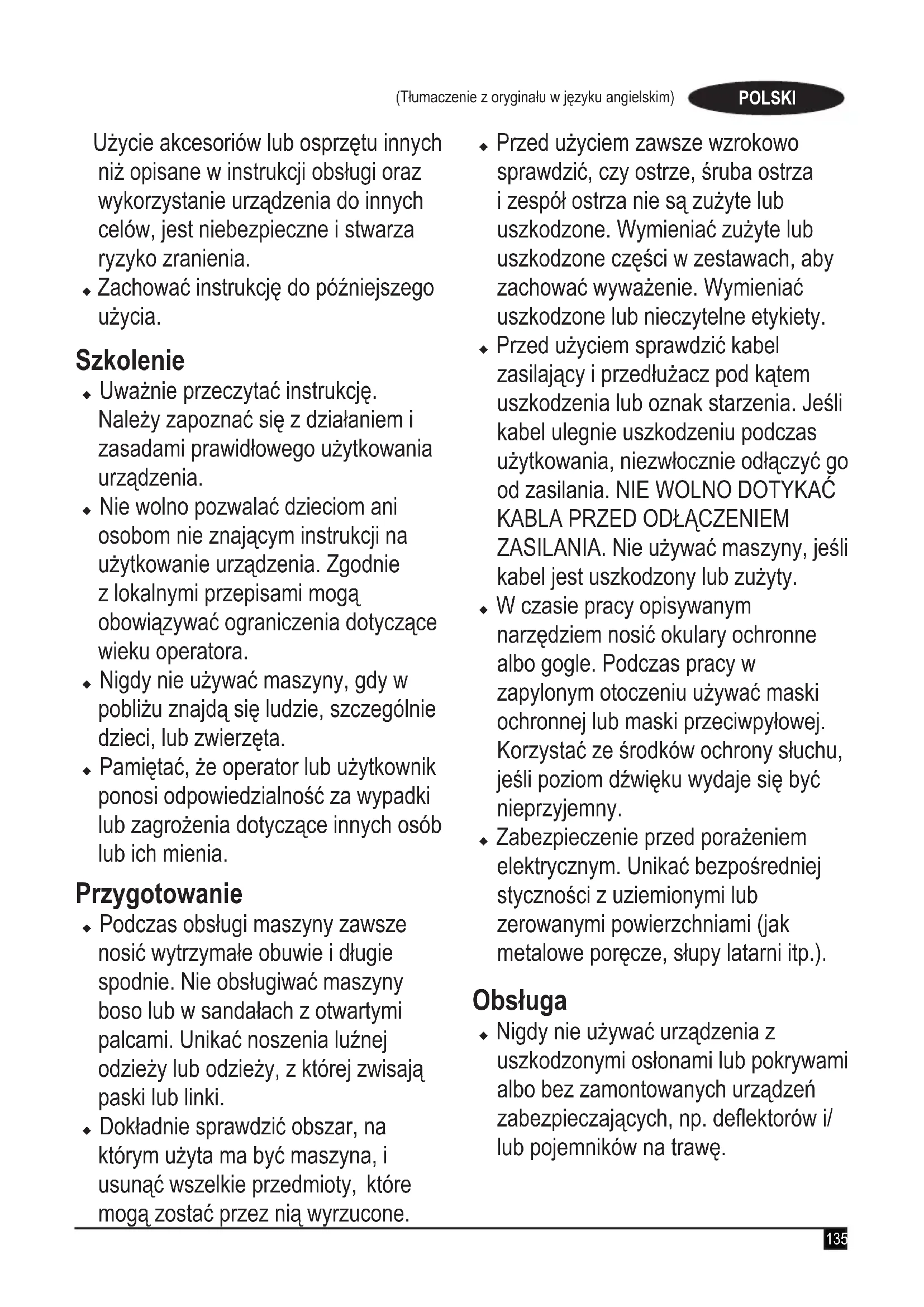 ZASILANIA. Nie używać maszyny, jeśli kabel jest uszkodzony lub zużyty. u W czasie pracy opisywanym narzędziem nosić okulary ochronne albo gogle. Podczas pracy w zapylonym otoczeniu używać maski ochronnej lub maski przeciwpyłowej. Korzystać ze środków ochrony słuchu, jeśli poziom dźwięku wydaje się być nieprzyjemny. u Zabezpieczenie przed porażeniem elektrycznym. Unikać bezpośredniej styczności z uziemionymi lub zerowanymi powierzchniami (jak metalowe poręcze, słupy latarni itp.). Obsługa u Nigdy nie używać urządzenia z uszkodzonymi osłonami lub pokrywami albo bez zamontowanych urządzeń zabezpieczających, np. deektorów i/ lub pojemników na trawę.136 (Tłumaczenie z oryginału w języku angielskim) POLSKI u Należy pracować przy świetle dziennym lub mocnym oświetleniu sztucznym. u Nie narażać urządzenia na działanie deszczu. Nie używać urządzenia w warunkach podwyższonej wilgotności. Lepiej nie używać urządzenia w mokrej trawie. u Stąpać ostrożnie, szczególnie na zboczach. Uważać, ponieważ świeżo ścięta trawa jest mokra i śliska. Nie używać na stromych zboczach. u Pracować w poprzek zbocza, nie w kierunku góra-dół. Zachować szczególną ostrożność podczas zmiany kierunku na zboczu. u Nie kosić na zbyt stromych zboczach. u Podczas użytkowania urządzenia chodzić, a nie biegać. Nie ciągnąć urządzenia do siebie ani nie chodzić wstecz podczas jego użytkowania. u Włączyć urządzenie zgodnie z instrukcją, utrzymując stopy z dala od ostrza. u Nie uruchamiać maszyny, stojąc przed otworem wylotowym. u Nie przechylać urządzenia podczas jego włączania, chyba że przechylenie urządzenia w celu uruchomienia jest wymagane. W takim przypadku nie przechylać urządzenia bardziej niż jest to absolutnie koniecznie i podnosić wyłącznie część, która znajduje się daleko od operatora. Zawsze dopilnować, aby obie ręce znajdowały się w pozycji roboczej przed ustawieniem urządzenia z powrotem na podłożu. u Wyłączyć urządzenie i poczekać na zatrzymanie zespołu ostrza, jeśli urządzenie wymaga przechylenia w celu przetransportowania przez powierzchnie inne niż trawa, a także podczas transportu urządzenia do i z miejsca koszenia. u Nie podnosić ani nie przenosić urządzenia, dopóki ostrze całkowicie się nie zatrzyma. u Trzymać dłonie i stopy z dala od ostrza. u Nie umieszczać dłoni ani stóp w pobliżu obracających się części lub pod nimi. u Trzymać się zawsze z dala od otworów wylotowych. u Wyłączyć urządzenie, wyjąć wtyczkę z gniazdka i upewnić się, czy ruchome części przestały się obracać, przed pozostawieniem urządzenia bez nadzoru i przed wymianą, czyszczeniem lub sprawdzeniem jakichkolwiek części albo przed usunięciem zatoru. Po uderzeniu w ciało obce. Sprawdzić maszynę pod kątem uszkodzeń i przeprowadzić naprawę przed ponownym uruchomieniem i użytkowaniem maszyny. u Jeśli urządzenie zacznie nietypowo drgać lub jeśli uderzy w ciało obce, wyłączyć urządzenie i wyjąć wtyczkę z gniazdka.137 POLSKI (Tłumaczenie z oryginału w języku angielskim) Sprawdzić urządzenie pod kątem uszkodzeń, wymienić lub naprawić wszelkie uszkodzone części, a następnie sprawdzić, czy nie ma żadnych poluzowanych części i dokręcić je, jeśli występują. u Zachować ostrożność, aby utrzymywać kabel zasilający z dala od ostrza. Zawsze kontrolować położenie kabla zasilającego. u Po wyłączeniu urządzenia jego silnik pracuje jeszcze przez kilka sekund. Nigdy nie próbować zatrzymywać ostrza. Konserwacja i przechowywanie u Przed użyciem sprawdzić, czy nie występują uszkodzenia lub wadliwe elementy. Sprawdzić, czy części ruchome nie są niedopasowane lub zakleszczone, czy części nie są pęknięte oraz czy osłony i przełączniki nie są uszkodzone i nie ma innych problemów, które mogłyby utrudniać pracę urządzenia. Dopilnować, aby urządzenie działało poprawnie i zgodnie z przeznaczeniem. Nigdy nie używać urządzenia, jeśli jakaś osłona lub obudowa jest uszkodzona lub nie znajduje się na miejscu. Nie wolno używać uszkodzonego lub zepsutego urządzenia. Nie wolno używać urządzenia z zepsutym włącznikiem, który nie pozwala na sprawne włączanie i wyłączanie. Zlecić naprawę lub wymianę uszkodzonych lub wadliwych części w autoryzowanym serwisie. u Często sprawdzać kabel pod kątem uszkodzeń. Jeśli kabel jest uszkodzony, konieczna jest jego wymiana przez autoryzowany serwis w celu uniknięcia zagrożeń. Okresowo sprawdzać przedłużacze. Niezwłocznie wymienić uszkodzony przedłużacz. u Utrzymywać prawidłowe dokręcenie wszystkich nakrętek, śrub i wkrętów urządzenia, aby utrzymać je w dobrym stanie technicznym. u Sprawdzać pojemnik na trawę pod kątem zużycia lub uszkodzeń i wymieniać go w razie potrzeby. Nigdy nie używać urządzenia bez pojemnika na trawę. u Zachować ostrożność podczas regulacji maszyny, aby uniknąć ściśnięcia palców między ruchomymi ostrzami a nieruchomymi częściami maszyny. u Podczas serwisowania ostrzy pamiętać, że nawet mimo wyłączenia zasilania, ostrza mogą zostać przemieszczone. u Nieużywane urządzenie należy przechowywać w suchym miejscu. Dzieci nie mogą mieć dostępu do urządzenia. u Przed rozpoczęciem przechowywania zawsze poczekać, aż maszyna ostygnie. u Dopilnować, aby ostrza zostały wymienione na ostrza zamienne właściwego typu.138 (Tłumaczenie z oryginału w języku angielskim) POLSKI u Stosować wyłącznie zalecane przez BLACK+DECKER części zamienne i akcesoria. Dodatkowe instrukcje bezpieczeństwa dla kosiarek u Używać wyłącznie przedłużaczy posiadających atest i przystosowanych do zasilania danego narzędzia (patrz dane techniczne). Przedłużacz musi być przeznaczony do użycia na dworze i posiadać odpowiednie oznaczenia. Użycie przedłużacza oznaczonego HO5VV-F, o maksymalnej długości 30 m i przekr