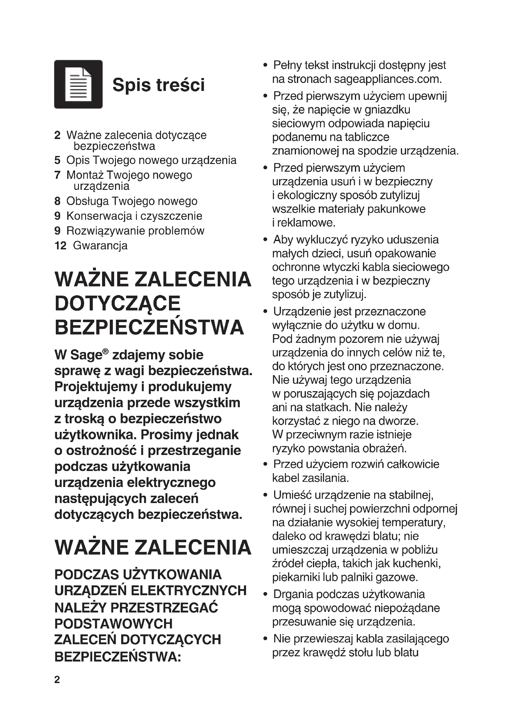 - Pełny tekst instrukcji dostępny jest na stronach sageappliances.com.