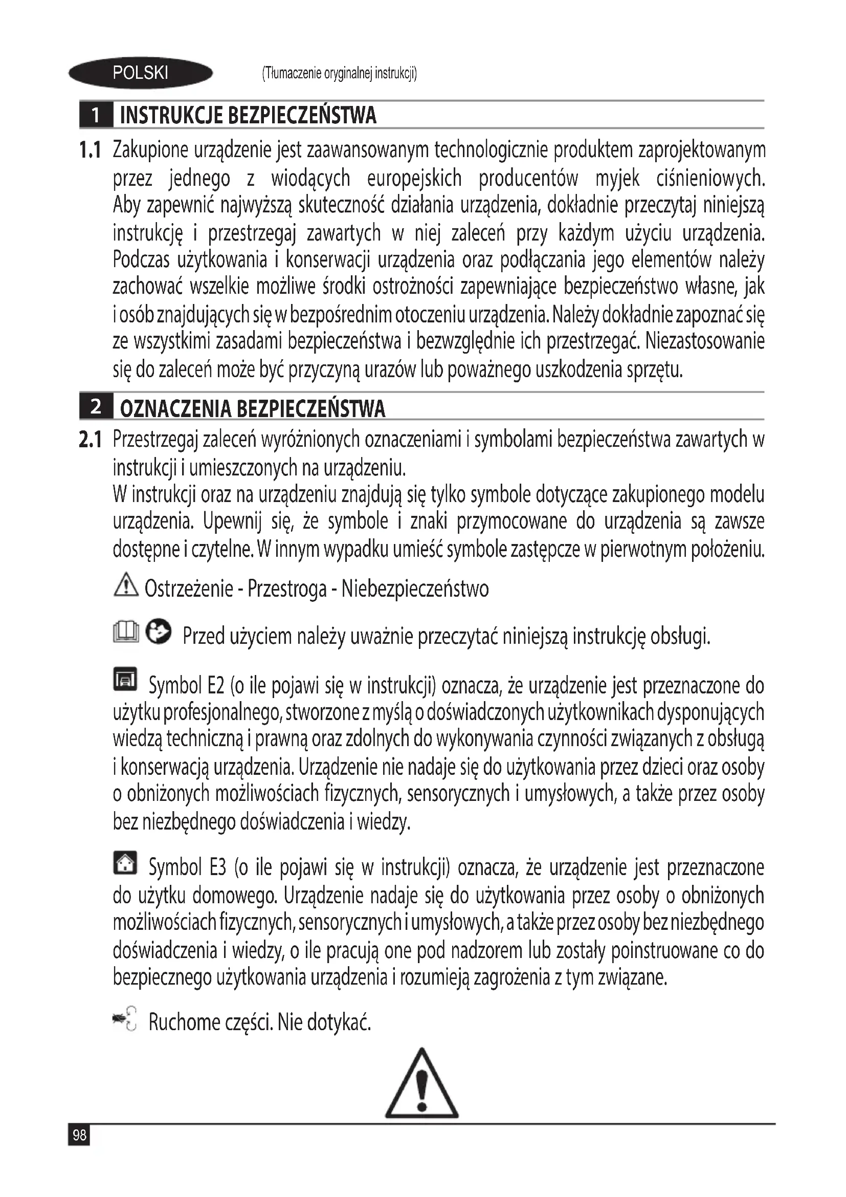 Przestrzegaj zaleceń wyróżnionych oznaczeniami i symbolami bezpieczeństwa zawartych w instrukcji i umieszczonych na urządzeniu. W instrukcji oraz na urządzeniu znajdują się tylko symbole dotyczące zakupionego modelu urządzenia. Upewnij się, że symbole i znaki przymocowane do urządzenia są zawsze dostępne i czytelne. W innym wypadku umieść symbole zastępcze w pierwotnym położeniu. Ostrzeżenie - Przestroga - Niebezpieczeństwo Przed użyciem należy uważnie przeczytać niniejszą instrukcję obsługi. Symbol E2 (o ile pojawi się winstrukcji) oznacza, że urządzenie jest przeznaczone do użytku profesjonalnego, stworzone z myślą o doświadczonych użytkownikach dysponujących wiedzą techniczną i prawną oraz zdolnych do wykonywania czynności związanych z obsługą i konserwacją urządzenia. Urządzenie nie nadaje się do użytkowania przez dzieci oraz osoby o obniżonych możliwościach fizycznych, sensorycznych i umysłowych, a także przez osoby bez niezbędnego doświadczenia i wiedzy. Symbol E3 (o ile pojawi się w instrukcji) oznacza, że urządzenie jest przeznaczone do użytku domowego. Urządzenie nadaje się do użytkowania przez osoby o obniżonych możliwościach fizycznych, sensorycznych i umysłowych, a także przez osoby bez niezbędnego doświadczenia i wiedzy, o ile pracują one pod nadzorem lub zostały poinstruowane co do bezpiecznego użytkowania urządzenia i rozumieją zagrożenia z tym związane. Ruchome części. Nie dotykać.99 POLSKI (Tłumaczenie oryginalnej instrukcji) 0 Przełącznik w pozycji wyłączonej I Przełącznik w pozycji włączonej Gwarantowany poziom mocy akustycznej Znak zakazu informujący uż ytkowników o tym, że lokalne przepisy prawne mogą zabraniać podłączania produktu do sieci wodociągowej. Znak niebezpieczeństwa ostrzegający użytkowników o tym, że nie wolno kierować strumienia wody na ludzi, sprzęt elektryczny lub na samo urządzenie. Ten produkt jest oznaczony II klasą izolacji. Oznacza to, że izolacja jest wzmocniona lub podwójna (dotyczy tylko urządzeń, na których znajduje się ten symbol). Ten produkt jest oznaczony I klasą izolacji. Oznacza to, że jest wyposażony w przewód uziemiający (dotyczy tylko urządzeń, na których znajduje się ten symbol). Niniejszy produkt jest zgodny zwymaganiami stosownych dyrektyw europejskich. Symbol E1 oznacza, że urządzenie nie może być utylizowane wraz z odpadami komunalnymi. Można przekazać je dystrybutorowi przy zakupie nowego urządzenia. Części elektryczne i elektroniczne urządzenia nie nadają się do ponownego użycia lub innych niewłaściwych form użytkowania ze względu na zawartość substancji groźnych dla zdrowia. Stosuj ochronę słuchu. Stosuj maskę ochronną. Stosuj środki ochrony dróg oddechowych. Stosuj rękawice ochronne. Stosuj obuwie ochronne. Stosuj odzież ochronną.100 POLSKI (Tłumaczenie oryginalnej instrukcji)