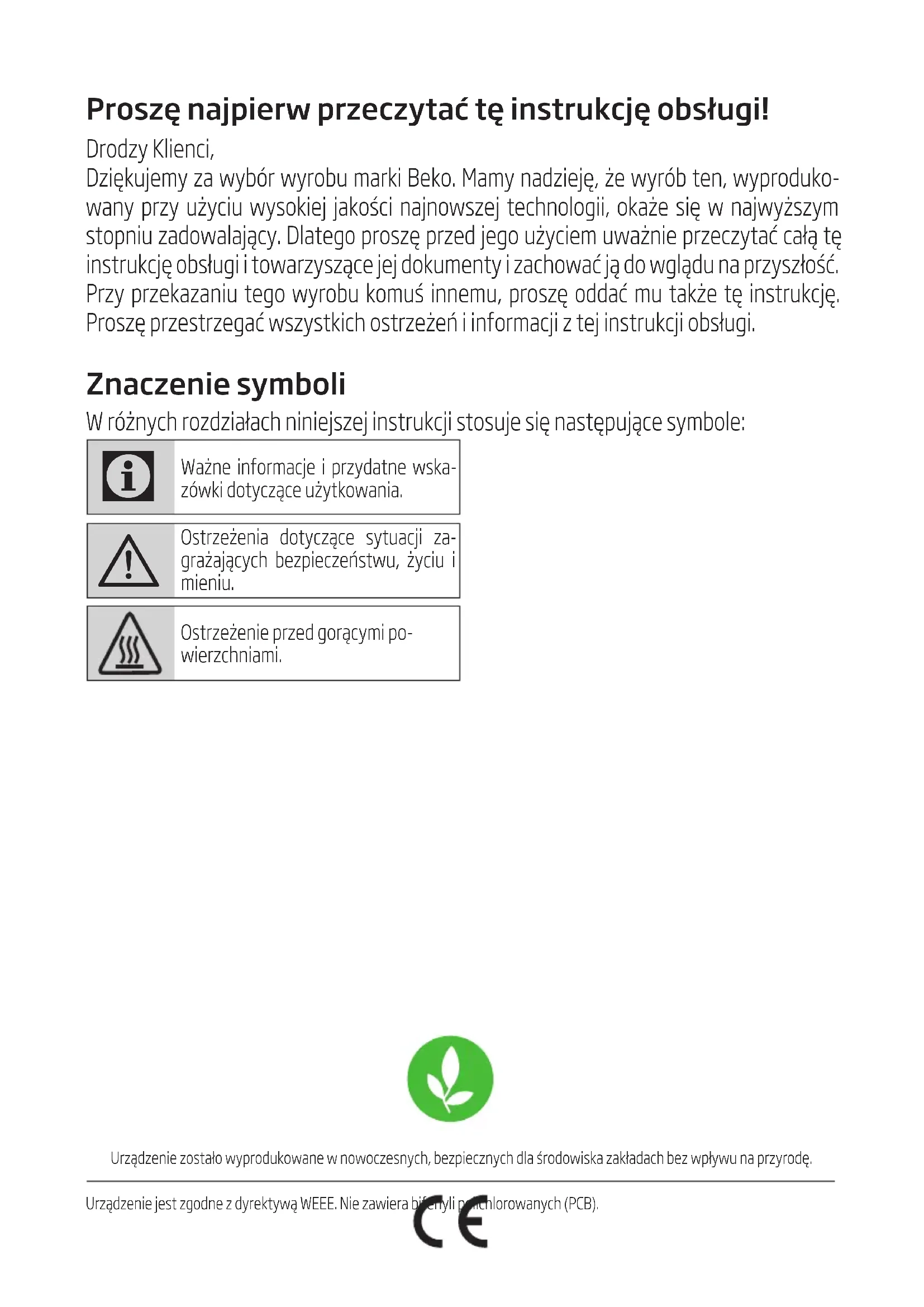 bodem van de oven zijn vuil. Raadpleeg het deel 'Reinigen en onderhoud' om vuile delen te reinigen.Proszę najpierw przeczytać tę instrukcję obsługi! Drodzy Klienci, Dziękujemy za wybór wyrobu marki Beko. Mamy nadzieję, że wyrób ten, wyproduko- wany przy użyciu wysokiej jakości najnowszej technologii, okaże się w najwyższym stopniu zadowalający. Dlatego proszę przed jego użyciem uważnie przeczytać całą tę instrukcję obsługi i towarzyszące jej dokumenty i zachować ją do wglądu na przyszłość. Przy przekazaniu tego wyrobu komuś innemu, proszę oddać mu także tę instrukcję. Proszę przestrzegać wszystkich ostrzeżeń i informacji z tej instrukcji obsługi. Znaczenie symboli W różnych rozdziałach niniejszej instrukcji stosuje się następujące symbole: