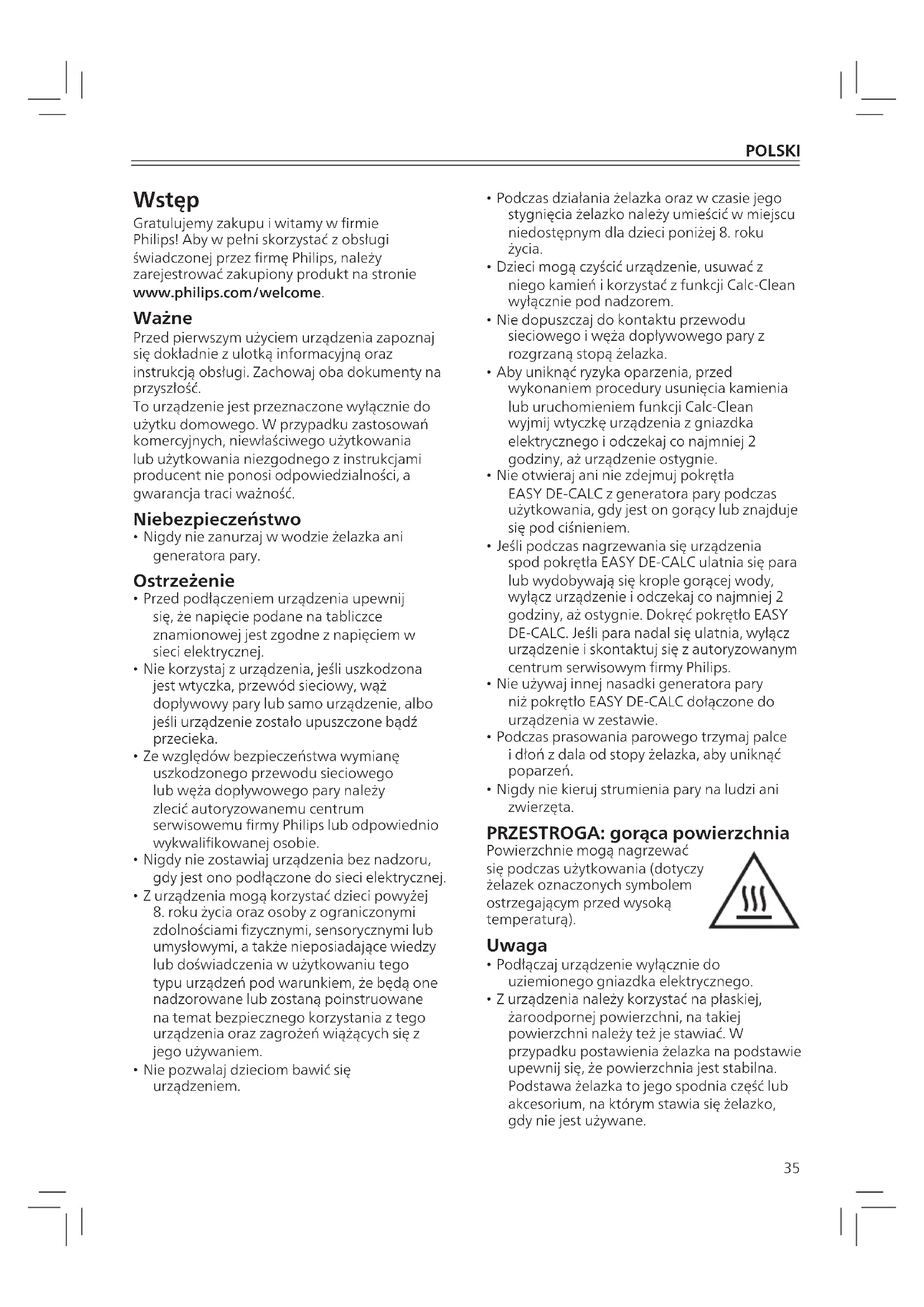 - Z urządzenia należy korzystać na płaskiej, żaroodpornej powierzchni, na takiej powierzchni należy też je stawiać. W przypadku postawienia żelazka na podstawie upewnij się, że powierzchnia jest stabilna. Podstawa żelazka to jego spodnia część lub akcesorium, na którym stawia się żelazko, gdy nie jest używane. Wstęp Gratulujemy zakupu i witamy w rmie Philips! Aby w pełni skorzystać z obsługi świadczonej przez rmę Philips, należy zarejestrować zakupiony produkt na stronie www.philips.com/welcome. Ważne Przed pierwszym użyciem urządzenia zapoznaj się dokładnie z ulotką informacyjną oraz instrukcją obsługi. Zachowaj oba dokumenty na przyszłość. To urządzenie jest przeznaczone wyłącznie do użytku domowego. W przypadku zastosowań komercyjnych, niewłaściwego użytkowania lub użytkowania niezgodnego z instrukcjami producent nie ponosi odpowiedzialności, a gwarancja traci ważność. Niebezpieczeństwo