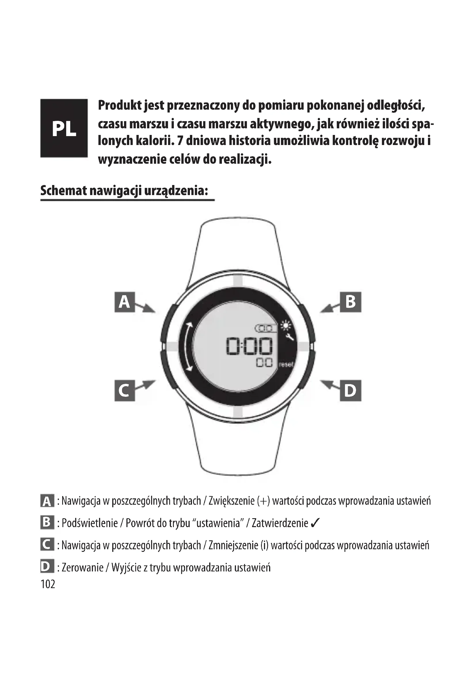 Produkt jest przeznaczony do pomiaru pokonanej odległości, czasu marszu i czasu marszu aktywnego, jak również ilości spa- lonych kalorii. 7 dniowa historia umożliwia kontrolę rozwoju i wyznaczenie celów do realizacji. A B C D