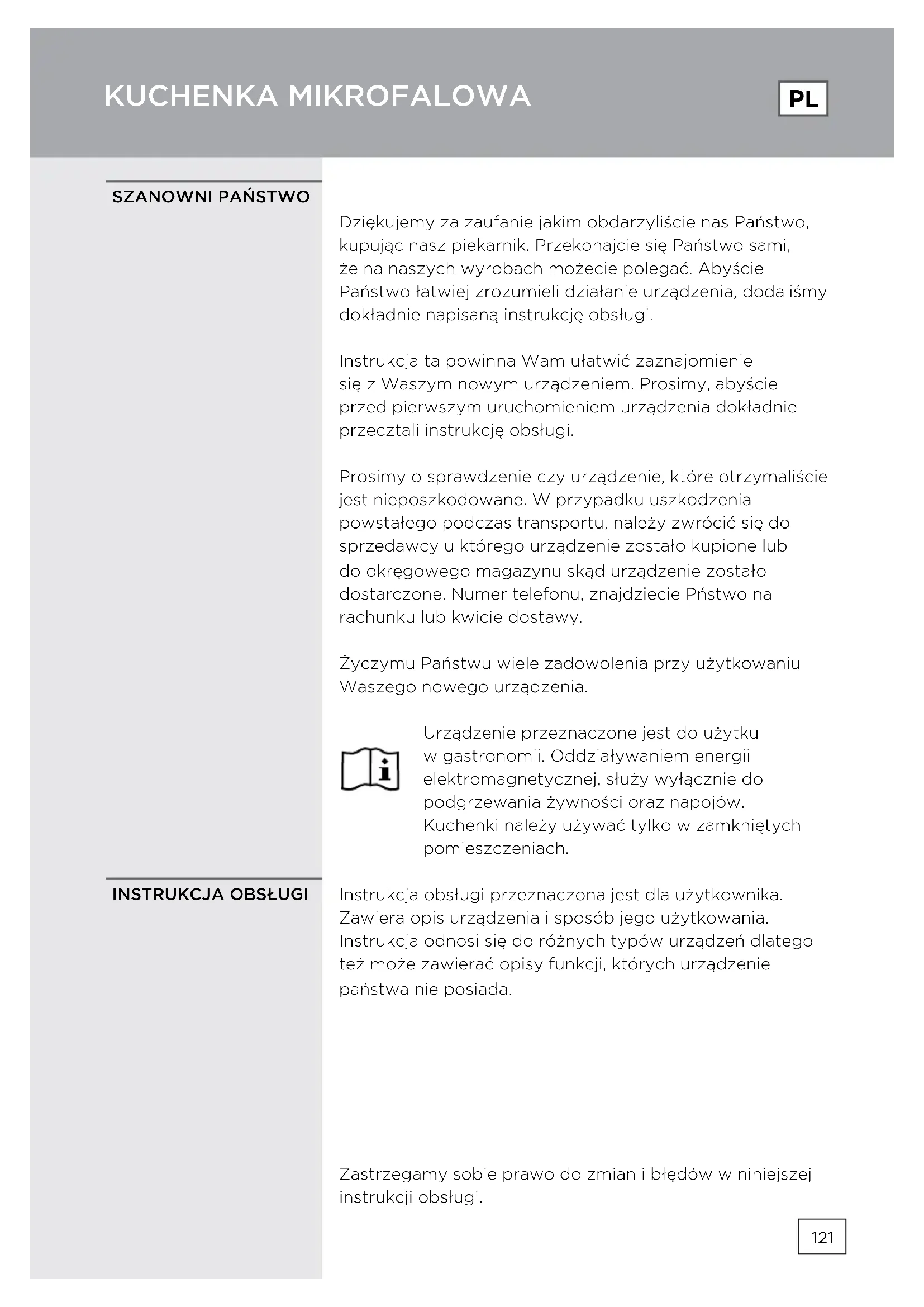 Dziękujemy za zaufanie jakim obdarzyliście nas Państwo, kupując nasz piekarnik. Przekonajcie się Państwo sami, że na naszych wyrobach możecie polegać. Abyście Państwo łatwiej zrozumieli działanie urządzenia, dodaliśmy dokładnie napisaną instrukcję obsługi. Instrukcja ta powinna Wam ułatwić zaznajomienie się z Waszym nowym urządzeniem. Prosimy, abyście przed pierwszym uruchomieniem urządzenia dokładnie przecztali instrukcję obsługi. Prosimy o sprawdzenie czy urządzenie, które otrzymaliście jest nieposzkodowane. W przypadku uszkodzenia powstałego podczas transportu, należy zwrócić się do sprzedawcy u którego urządzenie zostało kupione lub do okręgowego magazynu skąd urządzenie zostało dostarczone. Numer telefonu, znajdziecie Pństwo na rachunku lub kwicie dostawy. Życzymu Państwu wiele zadowolenia przy użytkowaniu Waszego nowego urządzenia. Urządzenie przeznaczone jest do użytku w gastronomii. Oddziaływaniem energii elektromagnetycznej, służy wyłącznie do podgrzewania żywności oraz napojów. Kuchenki należy używać tylko w zamkniętych pomieszczeniach. Instrukcja obsługi przeznaczona jest dla użytkownika. Zawiera opis urządzenia i sposób jego użytkowania. Instrukcja odnosi się do różnych typów urządzeń dlatego też może zawierać opisy funkcji, których urządzenie państwa nie posiada. Zastrzegamy sobie prawo do zmian i błędów w niniejszej instrukcji obsługi.