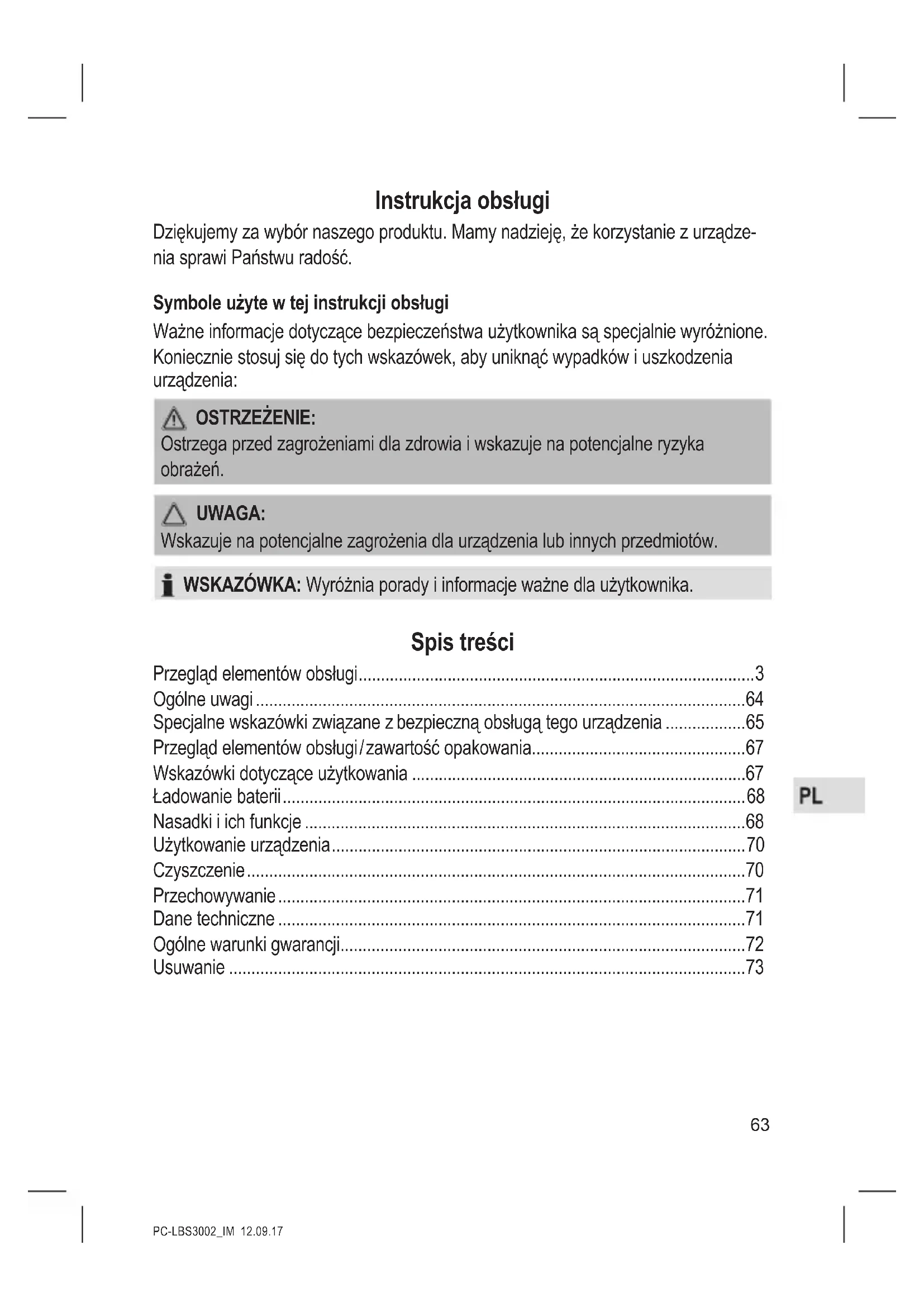 Usuwanie Utylizacja akumulatora / baterii Urządzenie posiada akumulator. Zużytych baterii / akumulatorów nie na- leży wyrzucać do zwykłych odpadów domowych. Akumulator należy wyjąć, zanim produkt zostanie poddany recyklingowi. Skontaktuj się z wykwalikowanym personelem. Informacje na temat utylizacji baterii / akumulatorów można uzyskać od władz lokal- nych lub miejskich. Znaczenie symbolu „Pojemnik na śmieci” Proszę oszczędzać nasze środowisko, sprzęt elektryczny nie należy do śmieci domowych. Proszę korzystać z punktów zbiorczych, przewidzianych do zdawania sprzętu elektrycznego, i tam proszę oddawać sprzęt elektryczny, którego już nie będą Państwo używać. Tym sposobem pomagają Państwo unikać potencjalnych następstw niewłaściwego usuwania odpadów, mających wpływ na środowisko i zdrowie ludzi. Tą drogą przyczyniają się Państwo do ponownego użycia, do recyklingu i do innych form wykorzystania starego sprzętu elektrycznego i elektronicznego. Informacje, gdzie można zdać sprzęt, otrzymają Państwo w swoich urzędach komu- nalnych lub w administracji gminy.PC-LBS3002_IM 12.09.17