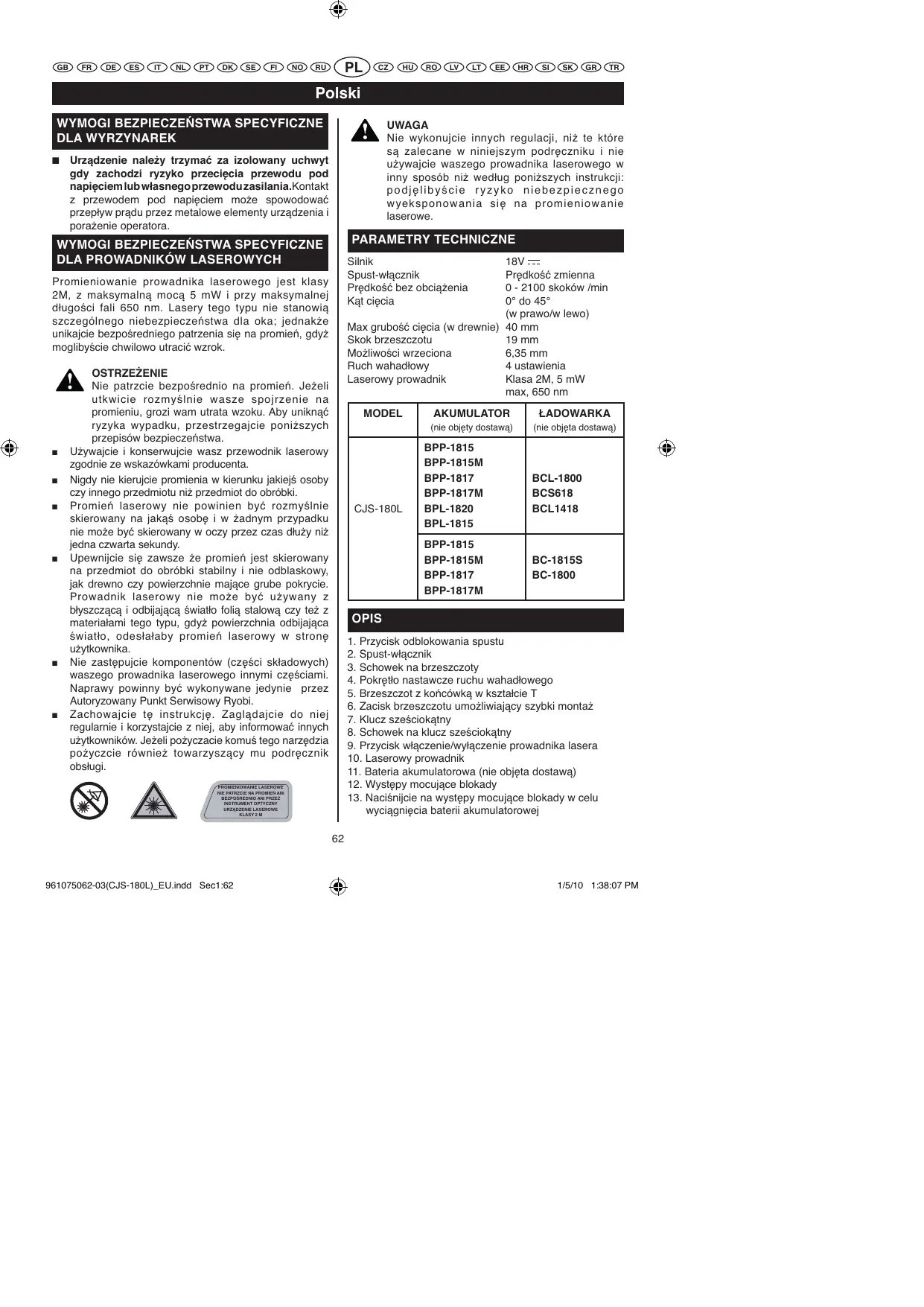 OSTRZEENIE Nie patrzcie bezporednio na promie. Jeeli utkwicie rozmylnie wasze spojrzenie na promieniu, grozi wam utrata wzoku. Aby unikn ryzyka wypadku, przestrzegajcie poniszych przepisów bezpieczestwa. Uywajcie i konserwujcie wasz przewodnik laserowy zgodnie ze wskazówkami producenta. Nigdy nie kierujcie promienia w kierunku jakiej osoby czy innego przedmiotu ni przedmiot do obróbki. Promie laserowy nie powinien by rozmylnie skierowany na jak osob i w adnym przypadku nie moe by skierowany w oczy przez czas duy ni jedna czwarta sekundy. Upewnijcie si zawsze e promie jest skierowany na przedmiot do obróbki stabilny i nie odblaskowy, jak drewno czy powierzchnie majce grube pokrycie. Prowadnik laserowy nie moe by uywany z byszczc i odbijajc wiato foli stalow czy te z materiaami tego typu, gdy powierzchnia odbijajca wiato, odesaaby promie laserowy w stron uytkownika. Nie zastpujcie komponentów (czci skadowych) waszego prowadnika laserowego innymi czciami. Naprawy powinny by wykonywane jedynie przez Autoryzowany Punkt Serwisowy Ryobi. Zachowajcie t instrukcj. Zagldajcie do niej regularnie i korzystajcie z niej, aby informowa innych uytkowników. Jeeli poyczacie komu tego narzdzia poyczcie równie towarzyszcy mu podrcznik obsugi. MODEL CJS-180L AKUMULATOR ADOWARKA (nie objty dostaw) (nie objta dostaw) BPP-1815 BPP-1815M BPP-1817 BPP-1817M BPL-1820 BPL-1815 BPP-1815 BPP-1815M BPP-1817 BPP-1817M BCL-1800 BCS618 BCL1418 BC-1815S BC-1800 OPIS