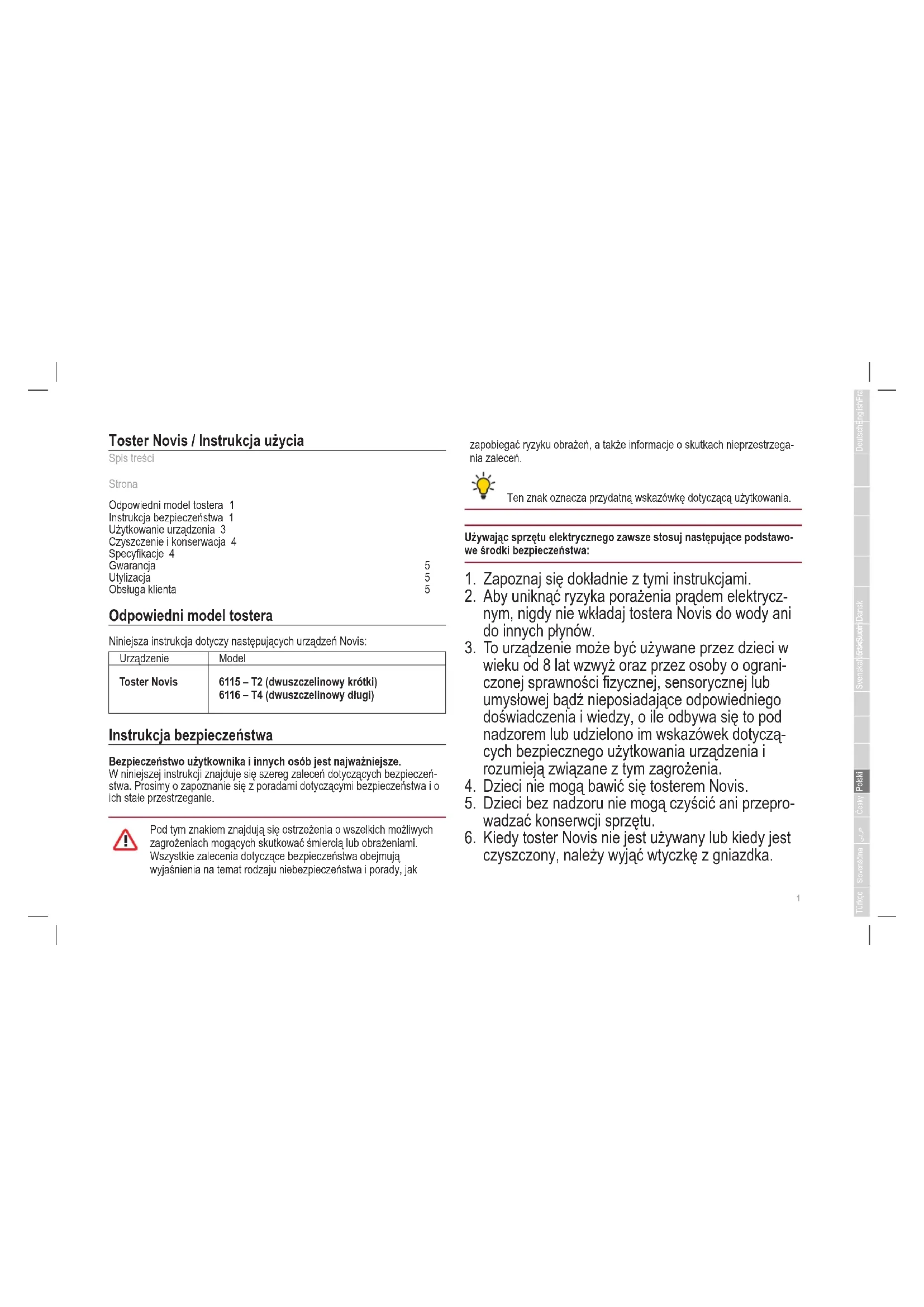 Toster Novis / Instrukcja użycia Spis treści Strona Odpowiedni model tostera 1 Instrukcja bezpieczeństwa 1 Użytkowanie urządzenia 3 Czyszczenie i konserwacja 4 Specyfikacje 4 Gwarancja 5 Utylizacja 5 Obsługa klienta 5 Odpowiedni model tostera Niniejsza instrukcja dotyczy następujących urządzeń Novis: Urządzenie Model Toster Novis 6115 – T2 (dwuszczelinowy krótki) 6116 – T4 (dwuszczelinowy długi) Instrukcja bezpieczeństwa Bezpieczeństwo użytkownika i innych osób jest najważniejsze. W niniejszej instrukcji znajduje się szereg zaleceń dotyczących bezpieczeń- stwa. Prosimy o zapoznanie się z poradami dotyczącymi bezpieczeństwa i o ich stałe przestrzeganie. Pod tym znakiem znajdują się ostrzeżenia o wszelkich możliwych zagrożeniach mogących skutkować śmiercią lub obrażeniami. Wszystkie zalecenia dotyczące bezpieczeństwa obejmują wyjaśnienia na temat rodzaju niebezpieczeństwa i porady, jak zapobiegać ryzyku obrażeń, a także informacje o skutkach nieprzestrzega- nia zaleceń. Ten znak oznacza przydatną wskazówkę dotyczącą użytkowania. Używając sprzętu elektrycznego zawsze stosuj następujące podstawo- we środki bezpieczeństwa: