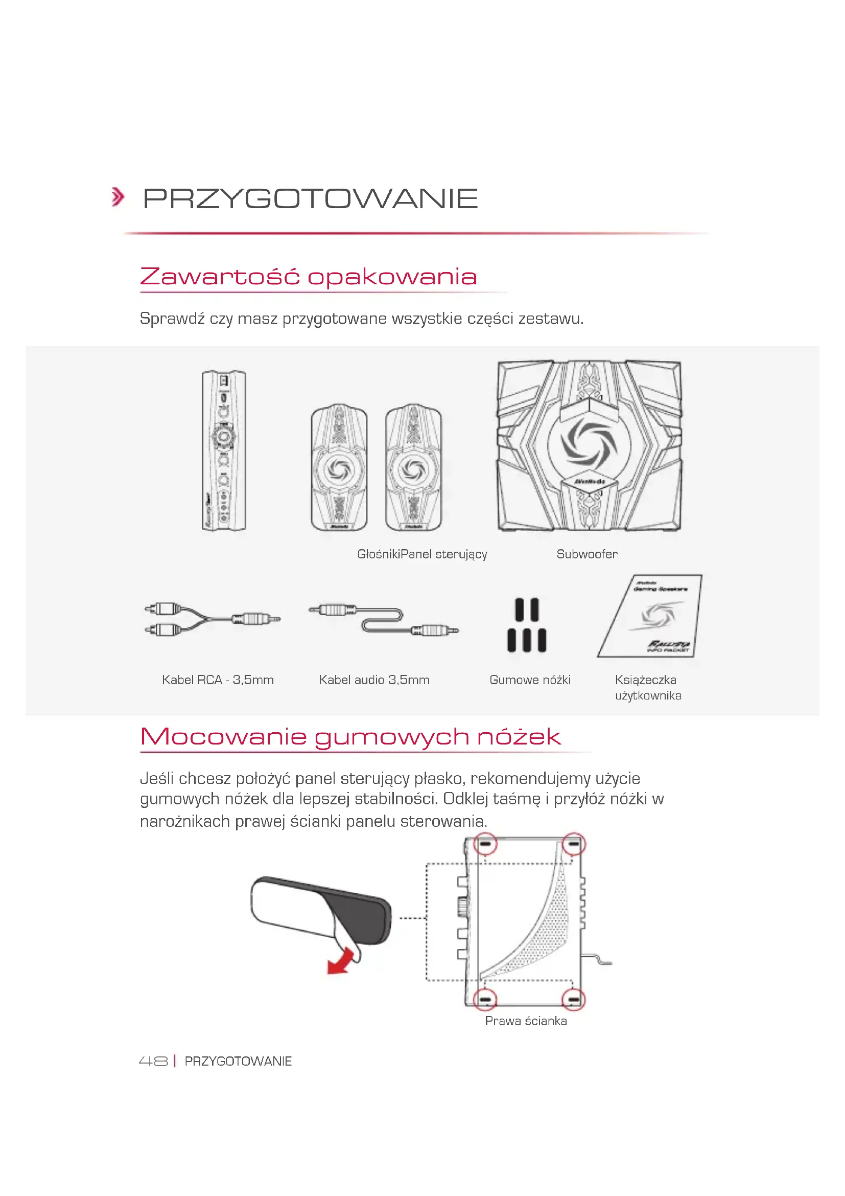 RU48 PRZYGOTOWANIE PRZYGOTOWANIE Zawartość opakowania Sprawdź czy masz przygotowane wszystkie części zestawu. Subwoofer Kabel RCA - 3,5mm Mocowanie gumowych nóżek Jeśli chcesz położyć panel sterujący płasko, rekomendujemy użycie gumowych nóżek dla lepszej stabilności. Odklej taśmę i przyłóż nóżki w narożnikach prawej ścianki panelu sterowania. Książeczka użytkownika GłośnikiPanel sterujący Kabel audio 3,5mm Prawa ścianka Gumowe nóżki49 PRZYGOTOWANIE Przegląd panelu sterującego 1 Przycisk zasilania 10 Wyjście na mikrofon 2 Przycisk trybu asasyna 11 Wejście AUX 3 Przełącznik źródła 12 Lewe wejście audio 4 Regulator głośności 13 Prawe wejście audio 5 Regulator tonów wysokich 14 Wyjście na lewy głośnik 6 Regulator tonów niskich 15 Wyjście na prawy głośnik 7 Wyjście na słuchawki 16 Wyjście na subwoofer 8 Wejście na mikrofon 17 Wejście na zasilanie 9 Wejście liniowe