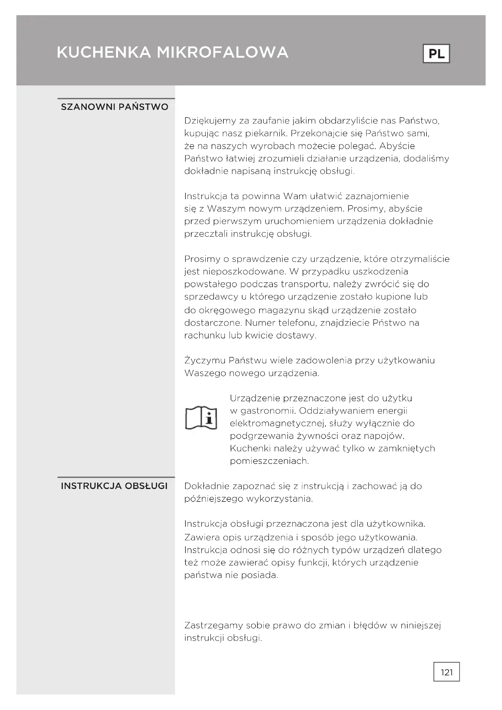 Dziękujemy za zaufanie jakim obdarzyliście nas Państwo, kupując nasz piekarnik. Przekonajcie się Państwo sami, że na naszych wyrobach możecie polegać. Abyście Państwo łatwiej zrozumieli działanie urządzenia, dodaliśmy dokładnie napisaną instrukcję obsługi. Instrukcja ta powinna Wam ułatwić zaznajomienie się z Waszym nowym urządzeniem. Prosimy, abyście przed pierwszym uruchomieniem urządzenia dokładnie przecztali instrukcję obsługi. Prosimy o sprawdzenie czy urządzenie, które otrzymaliście jest nieposzkodowane. W przypadku uszkodzenia powstałego podczas transportu, należy zwrócić się do sprzedawcy u którego urządzenie zostało kupione lub do okręgowego magazynu skąd urządzenie zostało dostarczone. Numer telefonu, znajdziecie Pństwo na rachunku lub kwicie dostawy. Życzymu Państwu wiele zadowolenia przy użytkowaniu Waszego nowego urządzenia. Urządzenie przeznaczone jest do użytku w gastronomii. Oddziaływaniem energii elektromagnetycznej, służy wyłącznie do podgrzewania żywności oraz napojów. Kuchenki należy używać tylko w zamkniętych pomieszczeniach. Dokładnie zapoznać się z instrukcją i zachować ją do późniejszego wykorzystania. Instrukcja obsługi przeznaczona jest dla użytkownika. Zawiera opis urządzenia i sposób jego użytkowania. Instrukcja odnosi się do różnych typów urządzeń dlatego też może zawierać opisy funkcji, których urządzenie państwa nie posiada. Zastrzegamy sobie prawo do zmian i błędów w niniejszej instrukcji obsługi.