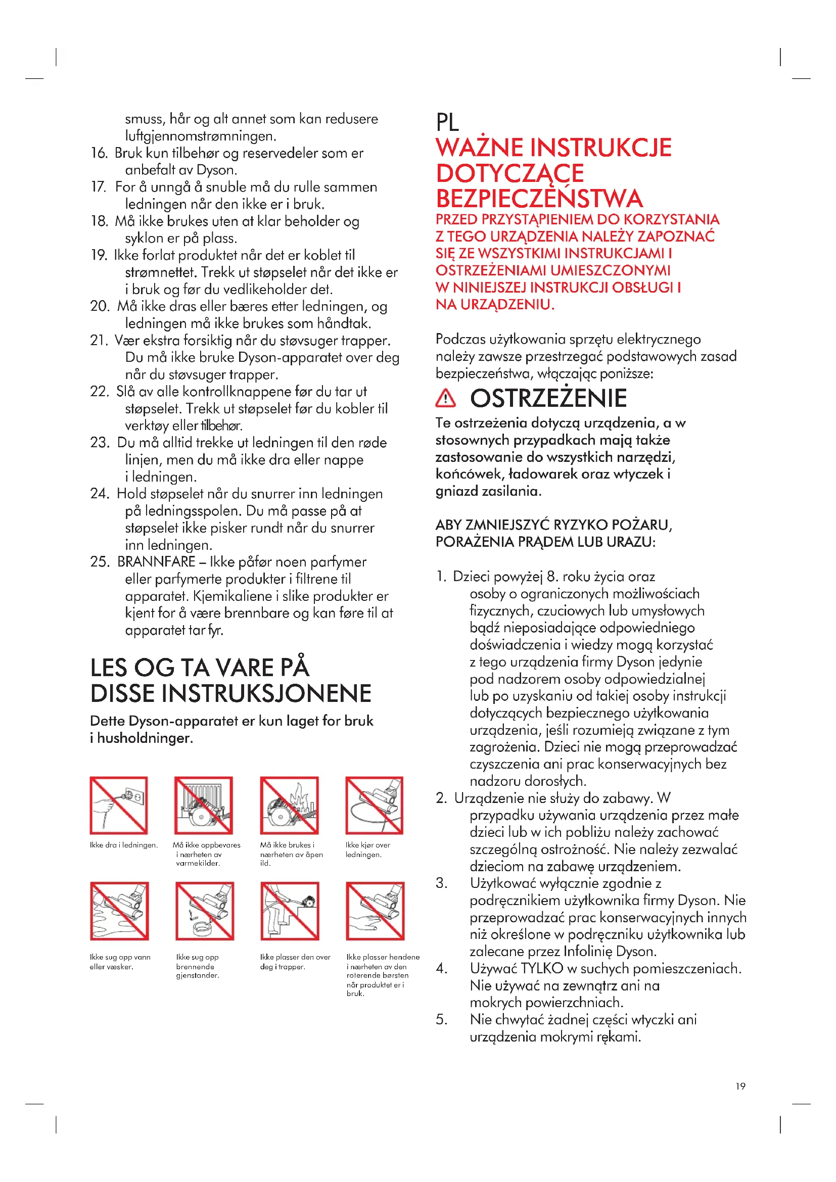 - Przypadkowego uszkodzenia, usterek wynikających z nieprawidłowego albo nieostrożnego użycia lub konserwacji, użycia urządzenia niezgodnie z przeznaczeniem, niestaranności, nieostrożnej obsługi lub przenoszenia urządzenia niezgodnie z instrukcją obsługi firmy Dyson.