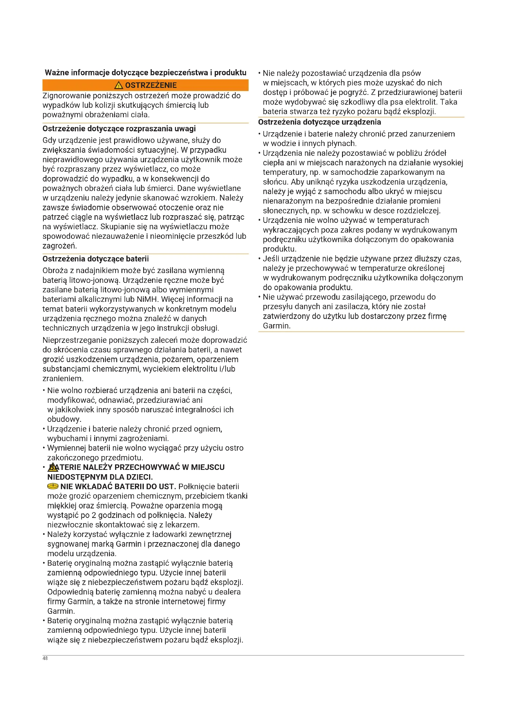 - Zużyte urządzenie/baterię nienadającą się do dalszego użytku należy przekazać do punktu utylizacji i powtórnego przetwarzania odpadów zgodnie z prawem i przepisami obowiązującymi na danym obszarze. Uwaga dotycząca systemu GPS Może dojść do pogorszenia wydajności pracy urządzenia nawigacyjnego, jeśli w jego pobliżu znajdują się jakiekolwiek urządzenia korzystające z naziemnej sieci szerokopasmowej o częstotliwościach zbliżonych do częstotliwości systemu GNSS (globalnego systemu nawigacji satelitarnej), jak na przykład usługi GPS. Korzystanie z takich urządzeń może niekorzystnie wpływać na odbiór sygnałów GNSS. Programy ochrony środowiska dotyczące produktu Informacje na temat programu recyklingu produktu firmy Garmin oraz dyrektyw WEEE, RoHS i REACH, a także innych programów można znaleźć na stronie www.garmin.com/aboutGarmin/environment. 49Deklaracja zgodności Firma Garmin niniejszym oświadcza, że produkt ten spełnia wymagania dyrektywy 2014/53/UE. Pełny tekst deklaracji zgodności z przepisami unijnymi można znaleźć na stronie: www.garmin.com/compliance. Informacje o radiu VHF Urządzenie to korzysta ze ściśle określonych częstotliwości radiowych, które różnią się w zależności od kraju użytkowania produktu. Urządzenie ręczne i nadajnik mają możliwość zainstalowania innej anteny przez użytkownika. Zmiana anteny może poprawić działanie komunikacji radiowej oraz zapewnić silniejszy sygnał nadawania. Urządzenia nie można używać z anteną innego producenta ani z anteną, która nie została zatwierdzona przez firmę Garmin. Odwiedź stronę www.garmin.com/tracking-legal, aby uzyskać informacje na temat działania tego produktu i używanej przez niego częstotliwości radiowej, a także oryginalnych akcesoriów i ograniczeń mocy nadajników obowiązujących w poszczególnych krajach. Dane kartograficzne Firma Garmin wykorzystujemy różne rządowe i prywatne źródła danych. Praktycznie wszystkie źródła danych zawierają pewne niedokładne lub niepełne informacje. W niektórych krajach pełne i dokładne dane kartograficzne nie są dostępne lub ich cena jest zbyt wysoka. Ograniczona gwarancja Niniejsza gwarancja Garmin jest gwarancją producenta, która przenosi na konsumenta prawa niezależne od praw wynikających z praw ochrony konsumenta (rękojmia), przy czym niniejszy dokument tych ostatnich nie ogranicza ani nie wyklucza. Niniejsza gwarancja pozostaje w mocy przez okres dwóch (2) lat od daty zakupu produktu Garmin w Polsce. Prawa ochrony konsumenta: W razie wykrycia wady produktu Garmin, konsument może skorzystać z praw wynikających z następujących przepisów: