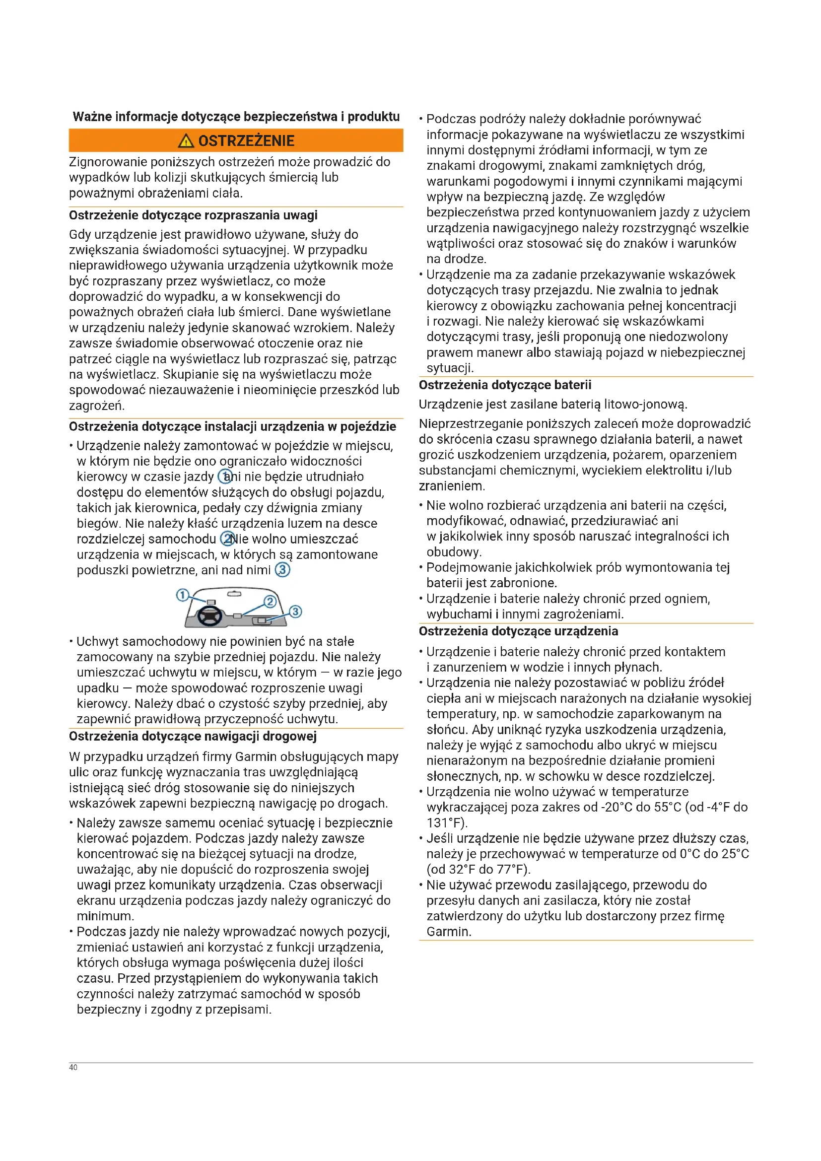 - Urządzenie należy zamontować w pojeździe w miejscu, w którym nie będzie ono ograniczało widoczności kierowcy w czasie jazdy ani nie będzie utrudniało dostępu do elementów służących do obsługi pojazdu, takich jak kierownica, pedały czy dźwignia zmiany biegów. Nie należy kłaść urządzenia luzem na desce rozdzielczej samochodu . Nie wolno umieszczać urządzenia w miejscach, w których są zamontowane poduszki powietrzne, ani nad nimi .