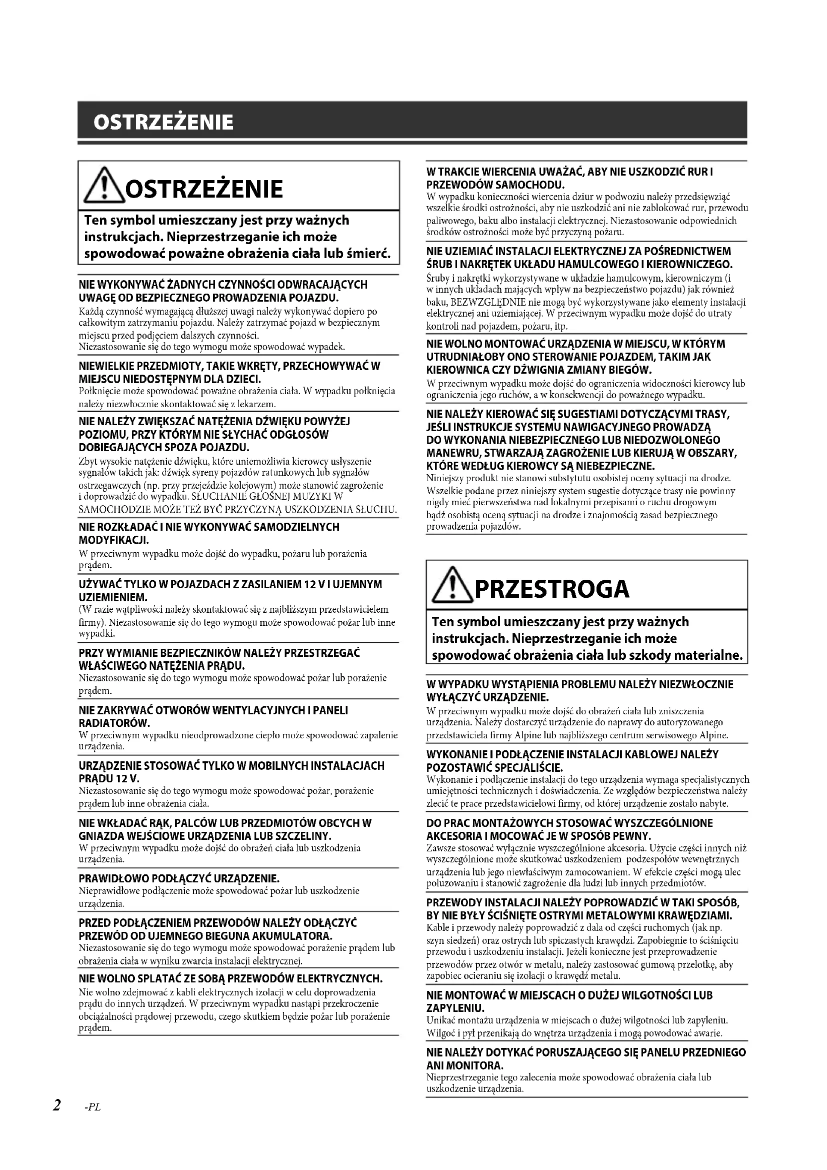 - Dane techniczne ALPINE X800D-U QRG 68-24567Z45-A (PL) 2-PL Wpr Obsług System mPopuRozmiese OSTRZEŻENIE OSTRZEŻENIE Ten symbol umieszczany jest przy ważnych instrukcjach. Nieprzestrzeganie ich może spowodować poważne obrażenia ciała lub śmierć.NIE WYKONYWAĆ ŻADNYCH CZYNNOŚCI ODWRACAJĄCYCH UWAGĘ OD BEZPIECZNEGO PROWADZENIA POJAZDU.Każdą czynność wymagającą dłuższej uwagi należy wykonywać dopiero po całkowitym zatrzymaniu pojazdu. Należy zatrzymać pojazd w bezpiecznym miejscu przed podjęciem dalszych czynności.Niezastosowanie się do tego wymogu może spowodować wypadek.NIEWIELKIE PRZEDMIOTY, TAKIE WKRĘTY, PRZECHOWYWAĆ W MIEJSCU NIEDOSTĘPNYM DLA DZIECI.Połknięcie może spowodować poważne obrażenia ciała. W wypadku połknięcia należy niezwłocznie skontaktować się z lekarzem.NIE NALEŻY ZWIĘKSZAĆ NATĘŻENIA DŹWIĘKU POWYŻEJ POZIOMU, PRZY KTÓRYM NIE SŁYCHAĆ ODGŁOSÓW DOBIEGAJĄCYCH SPOZA POJAZDU.Zbyt wysokie natężenie dźwięku, które uniemożliwia kierowcy usłyszenie sygnałów takich jak: dźwięk syreny pojazdów ratunkowych lub sygnałów ostrzegawczych (np. przy przejeździe kolejowym) może stanowić zagrożenie i doprowadzić do wypadku. SŁUCHANIE GŁOŚNEJ MUZYKI W SAMOCHODZIE MOŻE TEŻ BYĆ PRZYCZYNĄ USZKODZENIA SŁUCHU.NIE ROZKŁADAĆ I NIE WYKONYWAĆ SAMODZIELNYCH MODYFIKACJI.W przeciwnym wypadku może dojść do wypadku, pożaru lub porażenia prądem.UŻYWAĆ TYLKO W POJAZDACH Z ZASILANIEM 12 V I UJEMNYM UZIEMIENIEM.(W razie wątpliwości należy skontaktować się z najbliższym przedstawicielem firmy). Niezastosowanie się do tego wymogu może spowodować pożar lub inne wypadki.PRZY WYMIANIE BEZPIECZNIKÓW NALEŻY PRZESTRZEGAĆ WŁAŚCIWEGO NATĘŻENIA PRĄDU.Niezastosowanie się do tego wymogu może spowodować pożar lub porażenie prądem.NIE ZAKRYWAĆ OTWORÓW WENTYLACYJNYCH I PANELI RADIATORÓW.W przeciwnym wypadku nieodprowadzone ciepło może spowodować zapalenie urządzenia.URZĄDZENIE STOSOWAĆ TYLKO W MOBILNYCH INSTALACJACH PRĄDU 12 V.Niezastosowanie się do tego wymogu może spowodować pożar, porażenie prądem lub inne obrażenia ciała.NIE WKŁADAĆ RĄK, PALCÓW LUB PRZEDMIOTÓW OBCYCH W GNIAZDA WEJŚCIOWE URZĄDZENIA LUB SZCZELINY.W przeciwnym wypadku może dojść do obrażeń ciała lub uszkodzenia urządzenia.PRAWIDŁOWO PODŁĄCZYĆ URZĄDZENIE.Nieprawidłowe podłączenie może spowodować pożar lub uszkodzenie urządzenia.PRZED PODŁĄCZENIEM PRZEWODÓW NALEŻY ODŁĄCZYĆ PRZEWÓD OD UJEMNEGO BIEGUNA AKUMULATORA.Niezastosowanie się do tego wymogu może spowodować porażenie prądem lub obrażenia ciała w wyniku zwarcia instalacji elektrycznej.NIE WOLNO SPLATAĆ ZE SOBĄ PRZEWODÓW ELEKTRYCZNYCH.Nie wolno zdejmować z kabli elektrycznych izolacji w celu doprowadzenia prądu do innych urządzeń. W przeciwnym wypadku nastąpi przekroczenie obciążalności prądowej przewodu, czego skutkiem będzie pożar lub porażenie prądem.W TRAKCIE WIERCENIA UWAŻAĆ, ABY NIE USZKODZIĆ RUR I PRZEWODÓW SAMOCHODU.W wypadku konieczności wiercenia dziur w podwoziu należy przedsięwziąć wszelkie środki ostrożności, aby nie uszkodzić ani nie zablokować rur, przewodu paliwowego, baku albo instalacji elektrycznej. Niezastosowanie odpowiednich środków ostrożności może być przyczyną pożaru.NIE UZIEMIAĆ INSTALACJI ELEKTRYCZNEJ ZA POŚREDNICTWEM ŚRUB I NAKRĘTEK UKŁADU HAMULCOWEGO I KIEROWNICZEGO.Śruby i nakrętki wykorzystywane w układzie hamulcowym, kierowniczym (i w innych układach mających wpływ na bezpieczeństwo pojazdu) jak również baku, BEZWZGLĘDNIE nie mogą być wykorzystywane jako elementy instalacji elektrycznej ani uziemiającej. W przeciwnym wypadku może dojść do utraty kontroli nad pojazdem, pożaru, itp.NIE WOLNO MONTOWAĆ URZĄDZENIA W MIEJSCU, W KTÓRYM UTRUDNIAŁOBY ONO STEROWANIE POJAZDEM, TAKIM JAK KIEROWNICA CZY DŹWIGNIA ZMIANY BIEGÓW.W przeciwnym wypadku może dojść do ograniczenia widoczności kierowcy lub ograniczenia jego ruchów, a w konsekwencji do poważnego wypadku.NIE NALEŻY KIEROWAĆ SIĘ SUGESTIAMI DOTYCZĄCYMI TRASY, JEŚLI INSTRUKCJE SYSTEMU NAWIGACYJNEGO PROWADZĄ DO WYKONANIA NIEBEZPIECZNEGO LUB NIEDOZWOLONEGO MANEWRU, STWARZAJĄ ZAGROŻENIE LUB KIERUJĄ W OBSZARY, KTÓRE WEDŁUG KIEROWCY SĄ NIEBEZPIECZNE.Niniejszy produkt nie stanowi substytutu osobistej oceny sytuacji na drodze. Wszelkie podane przez niniejszy system sugestie dotyczące trasy nie powinny nigdy mieć pierwszeństwa nad lokalnymi przepisami o ruchu drogowym bądź osobistą oceną sytuacji na drodze i znajomością zasad bezpiecznego prowadzenia pojazdów. PRZESTROGA Ten symbol umieszczany jest przy ważnych instrukcjach. Nieprzestrzeganie ich może spowodować obrażenia ciała lub szkody materialne.W WYPADKU WYSTĄPIENIA PROBLEMU NALEŻY NIEZWŁOCZNIE WYŁĄCZYĆ URZĄDZENIE.W przeciwnym wypadku może dojść do obrażeń ciała lub zniszczenia urządzenia. Należy dostarczyć urządzenie do naprawy do autoryzowanego przedstawiciela firmy Alpine lub najbliższego centrum serwisowego Alpine.WYKONANIE I PODŁĄCZENIE INSTALACJI KABLOWEJ NALEŻY POZOSTAWIĆ SPECJALIŚCIE.Wykonanie i podłączenie instalacji do tego urządzenia wymaga specjalistycznych umiejętności technicznych i doświadczenia. Ze względów bezpieczeństwa należy zlecić te prace przedstawicielowi firmy, od której urządzenie zostało nabyte.DO PRAC MONTAŻOWYCH STOSOWAĆ WYSZCZEGÓLNIONE AKCESORIA I MOCOWAĆ JE W SPOSÓB PEWNY.Zawsze stosować wyłącznie wyszczególnione akcesoria. Użycie części innych niż wyszczególnione może skutkować uszkodzeniem podzespołów wewnętrznych urządzenia lub jego niewłaściwym zamocowaniem. W efekcie części mogą ulec poluzowaniu i stanowić zagrożenie dla ludzi lub innych przedmiotów.PRZEWODY INSTALACJI NALEŻY POPROWADZIĆ W TAKI SPOSÓB, BY NIE BYŁY ŚCIŚNIĘTE OSTRYMI METALOWYMI KRAWĘDZIAMI.Kable i przewody należy poprowadzić z dala od czę