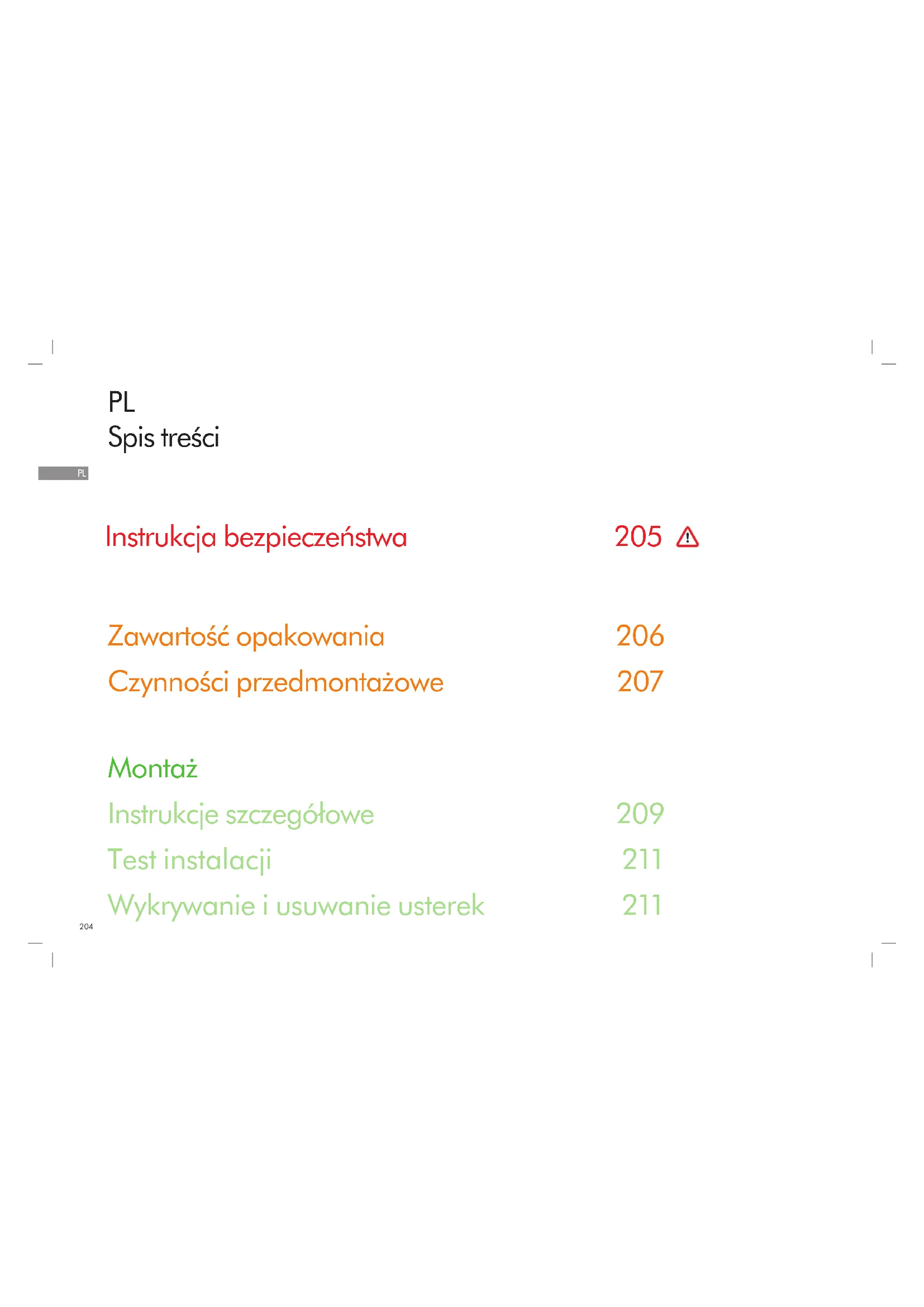 Instrukcja bezpieczeństwa Zawartość opakowania Czynności przedmontażowe Montaż Instrukcje szczegółowe Test instalacji Wykrywanie i usuwanie usterek