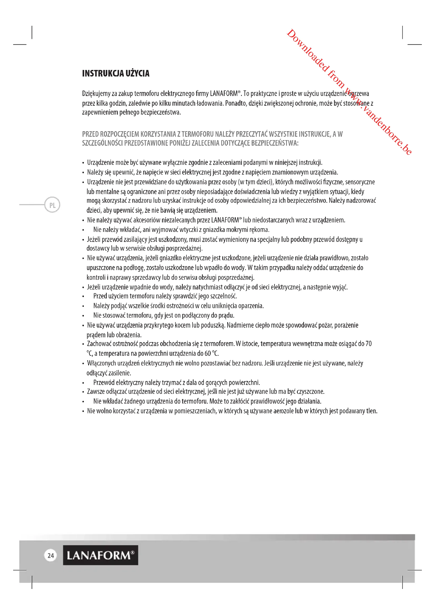Dziękujemy za zakup termoforu elektrycznego rmy LANAFORM®. To praktyczne i proste w użyciu urządzenie ogrzewa przez kilka godzin, zaledwie po kilku minutach ładowania. Ponadto, dzięki zwiększonej ochronie, może być stosowane z zapewnieniem pełnego bezpieczeństwa. PRZED ROZPOCZĘCIEM KORZYSTANIA Z TERMOFORU NALEŻY PRZECZYTAĆ WSZYSTKIE INSTRUKCJE, A W SZCZEGÓLNOŚCI PRZEDSTAWIONE PONIŻEJ ZALECENIA DOTYCZĄCE BEZPIECZEŃSTWA: