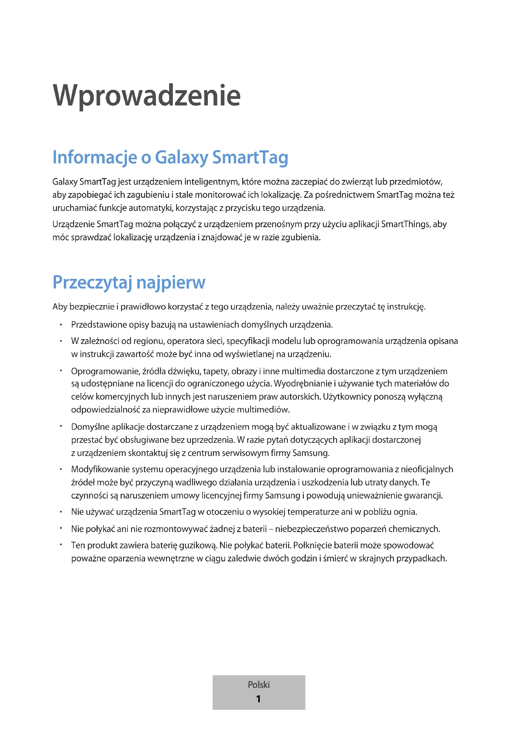 Wprowadzenie Informacje oGalaxy SmartTag Galaxy SmartTag jest urządzeniem inteligentnym, które można zaczepiać do zwierząt lub przedmiotów, aby zapobiegać ich zagubieniu istale monitorować ich lokalizację. Za pośrednictwem SmartTag można też uruchamiać funkcje automatyki, korzystając z przycisku tego urządzenia. Urządzenie SmartTag można połączyć zurządzeniem przenośnym przy użyciu aplikacji SmartThings, aby móc sprawdzać lokalizację urządzenia iznajdować je wrazie zgubienia. Przeczytaj najpierw Aby bezpiecznie i prawidłowo korzystać z tego urządzenia, należy uważnie przeczytać tę instrukcję.