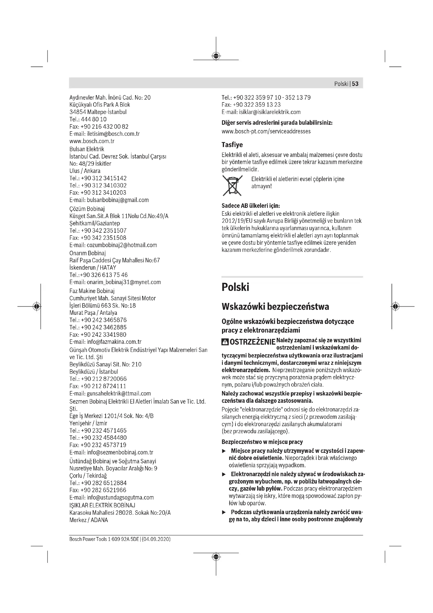 Karasoku Mahallesi 28028. Sokak No:20/A Merkez / ADANA Tel.: +903223599710 -3521379 Fax: +903223591323 E-mail: isiklar@isiklarelektrik.com Diğer servis adreslerini şurada bulabilirsiniz: www.bosch-pt.com/serviceaddresses Tasfiye Elektrikli el aleti, aksesuar ve ambalaj malzemesi çevre dostu bir yöntemle tasfiye edilmek üzere tekrar kazanım merkezine gönderilmelidir. Elektrikli el aletlerini evsel çöplerin içine atmayın! Sadece AB ülkeleri için: Eski elektrikli el aletleri ve elektronik aletlere ilişkin 2012/19/EU sayılı Avrupa Birliği yönetmeliği ve bunların tek tek ülkelerin hukuklarına uyarlanması uyarınca, kullanım ömrünü tamamlamış elektrikli el aletleri ayrı ayrı toplanmak ve çevre dostu bir yöntemle tasfiye edilmek üzere yeniden kazanım merkezlerine gönderilmek zorundadır. Polski Wskazówki bezpieczeństwa Ogólne wskazówki bezpieczeństwa dotyczące pracy z elektronarzędziami OSTRZEŻENIE Należy zapoznać się ze wszystkimi ostrzeżeniami i wskazówkami do- tyczącymi bezpieczeństwa użytkowania oraz ilustracjami i danymi technicznymi, dostarczonymi wraz z niniejszym elektronarzędziem. Nieprzestrzeganie poniższych wskazó- wek może stać się przyczyną porażenia prądem elektrycz- nym, pożaru i/lub poważnych obrażeń ciała. Należy zachować wszystkie przepisy i wskazówki bezpie- czeństwa dla dalszego zastosowania. Pojęcie "elektronarzędzie" odnosi się do elektronarzędzi za- silanych energią elektryczną z sieci (z przewodem zasilają- cym) i do elektronarzędzi zasilanych akumulatorami (bezprzewodu zasilającego). Bezpieczeństwo w miejscu pracy u Miejsce pracy należy utrzymywać w czystości i zapew- nić dobre oświetlenie. Nieporządek i brak właściwego oświetlenia sprzyjają wypadkom. u Elektronarzędzi nie należy używać w środowiskach za- grożonym wybuchem, np. w pobliżu łatwopalnych cie- czy, gazów lub pyłów. Podczas pracy elektronarzędziem wytwarzają się iskry, które mogą spowodować zapłon py- łów lub oparów. u Podczas użytkowania urządzenia należy zwrócić uwa- gę na to, aby dzieci i inne osoby postronne znajdowały Bosch Power Tools 1 609 92A 5DE | (04.09.2020)54 | Polski się w bezpiecznej odległości. Czynniki rozpraszające mogą spowodować utratę panowania nad elektronarzę- dziem. Bezpieczeństwo elektryczne u Wtyczki elektronarzędzi muszą pasować do gniazd. Nie wolno w żadnej sytuacji i w żaden sposób modyfi- kować wtyczek. Podczas pracy elektronarzędziami z uziemieniem ochronnym nie wolno stosować żadnych wtyków adaptacyjnych. Oryginalne wtyczki i pasujące do nich gniazda sieciowe zmniejszają ryzyko porażenia prądem. u Należy unikać kontaktu z uziemionymi elementami lub zwartymi z masą, takimi jak rury, grzejniki, kuchenki ilodówki. Uziemienie ciała zwiększa ryzyko porażenia prądem elektrycznym. u Elektronarzędzi nie wolno narażać na kontakt z desz- czem ani wilgocią. Przedostanie się wody do wnętrza obudowy zwiększa ryzyko porażenia prądem elektrycz- nym. u Nie używać przewodu zasilającego do innych celów. Nie wolno używać przewodu do przenoszenia ani prze- suwania elektronarzędzia; nie wolno też wyjmować wtyczki z gniazda, pociągając za przewód. Przewód należy chronić przed wysokimi temperaturami, należy go trzymać zdala od oleju, ostrych krawędzi i rucho- mych części urządzenia. Uszkodzone lub splątane prze- wody zwiększają ryzyko porażenia prądem elektrycznym. u Używając elektronarzędzia na świeżym powietrzu, na- leży upewnić się, że przedłużacz jest przeznaczony do pracy na zewnątrz. Użycie przedłużacza przeznaczone- go do pracy na zewnątrz zmniejsza ryzyko porażenia prą- dem elektrycznym. u Jeżeli nie ma innej możliwości, niż użycie elektrona- rzędzia w wilgotnym otoczeniu, należy podłączyć je do źródła zasilania wyposażonego w wyłącznik ochronny różnicowoprądowy. Zastosowanie wyłącznika ochron- nego różnicowoprądowego zmniejsza ryzyko porażenia prądem elektrycznym. Bezpieczeństwo osób u Podczas pracy z elektronarzędziem należy zachować czujność, każdą czynność wykonywać ostrożnie i z rozwagą. Nie przystępować do pracy elektronarzę- dziem w stanie zmęczenia lub będąc pod wpływem narkotyków, alkoholu lub leków. Chwila nieuwagi pod- czas pracy może grozić bardzo poważnymi obrażeniami ciała. u Stosować środki ochrony osobistej. Należy zawsze nosić okulary ochronne. Środki ochrony osobistej, np. maska przeciwpyłowa, antypoślizgowe obuwie, kask ochronny czy ochraniacze na uszy, w określonych warun- kach pracy obniżają ryzyko obrażeń ciała. u Należy unikać niezamierzonego uruchomienia narzę- dzia. Przed podłączeniem elektronarzędzia do źródła zasilania i/lub podłączeniem akumulatora, podniesie- niem albo transportem urządzenia, należy upewnić się, że włącznik elektronarzędzia znajduje się w pozy- cji wyłączonej. Przenoszenie elektronarzędzia z palcem opartym na włączniku/wyłączniku lub włożenie do gniaz- da sieciowego wtyczki włączonego narzędzia, może stać się przyczyną wypadków. u Przed włączeniem elektronarzędzia należy usunąć wszystkie narzędzia nastawcze i klucze maszynowe. Narzędzia lub klucze, pozostawione wruchomych czę- ściach urządzenia, mogą spowodować obrażenia ciała. u Należy unikać nienaturalnych pozycji przy pracy. Na- leży dbać o stabilną pozycję przy pracy i zachowanie równowagi. Dzięki temu można będzie łatwiej zapano- wać nad elektronarzędziem w nieprzewidzianych sytu- acjach. u Należy nosić odpowiednią odzież. Nie należy nosić luźnej odzieży ani biżuterii. Włosy i odzież należy trzy- mać z dala od ruchomych części. Luźna odzież, biżuteria lub długie włosy mogą zostać pochwycone przez ruchome części. u Jeżeli producent przewidział możliwość podłączenia odkurzacza lub systemu odsysania pyłu, należy upew- nić się, że s