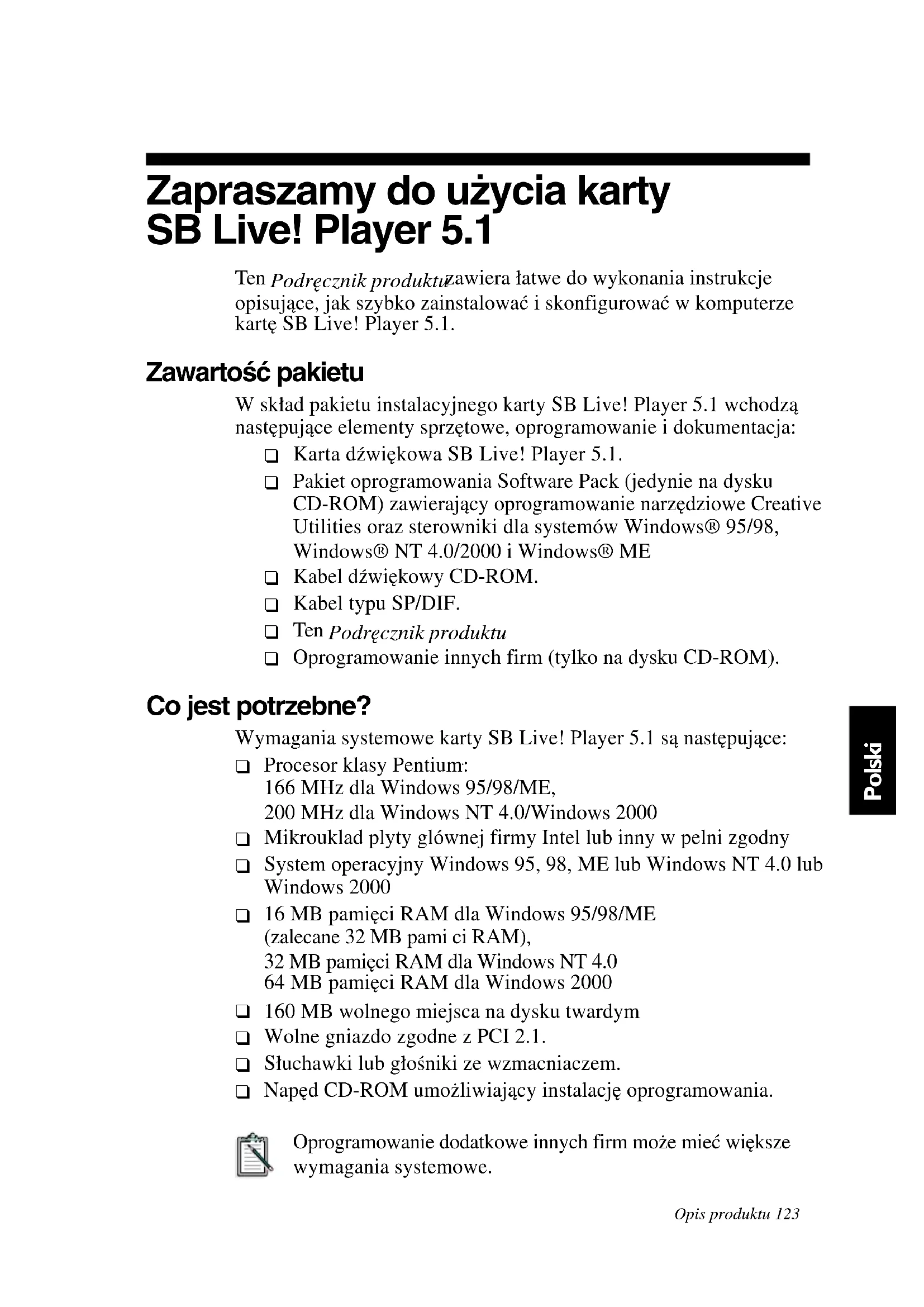 oprogramowanie. Jeli potrzebujesz bardziej szczegó³owych informacji na temat instalacji i u¿ywania karty SB Live! Player 5.1, zajrzyj do instrukcji obs³ugi Instrukcja obslugi online karty SB Live! Player 5.1 na dysku instalacyjnym CD. W Windows 95/98/NT 4.0, 2000 and ME, podwojnie kliknac .zbior .exe w