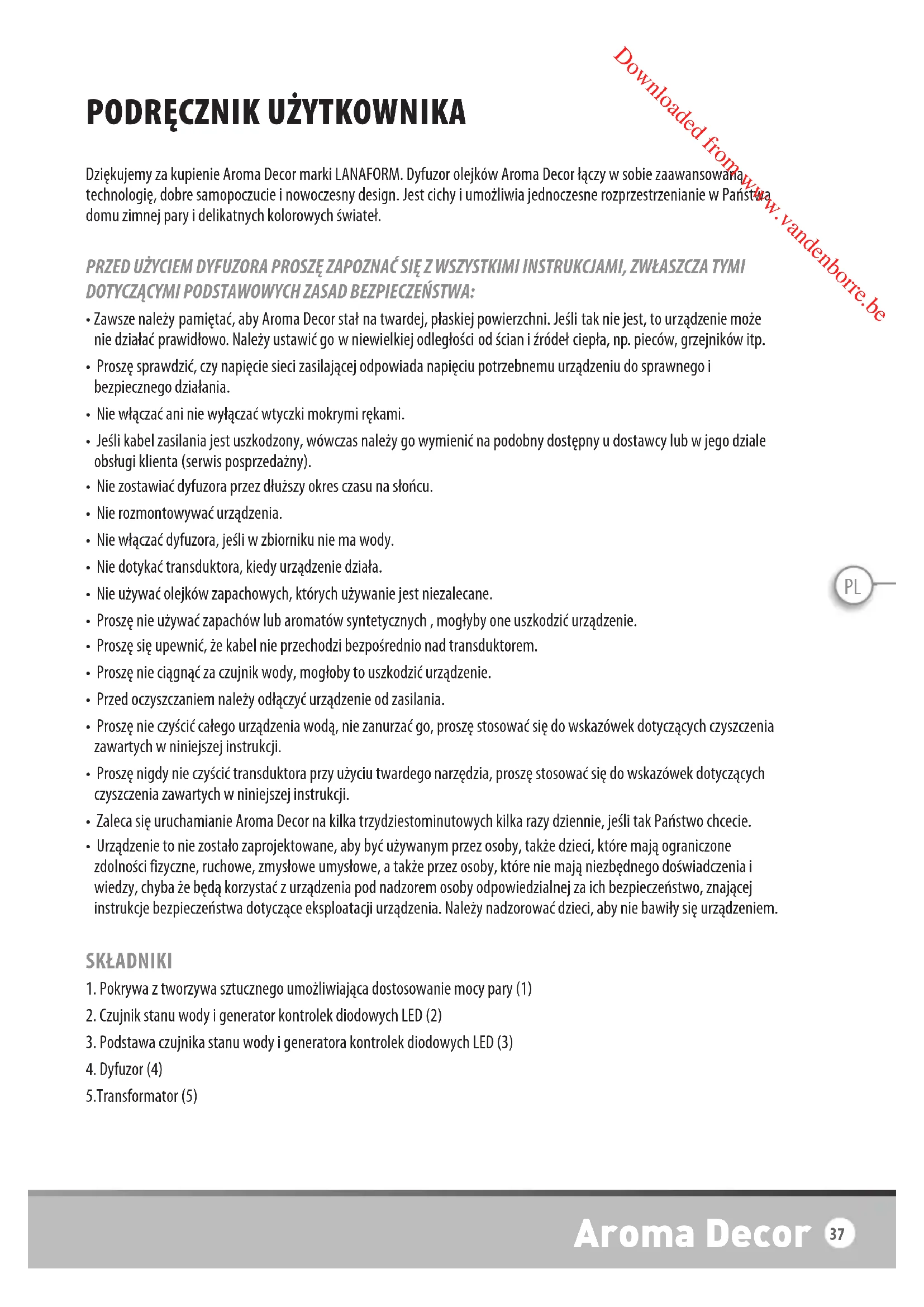 Downloaded from www.vandenborre.bePL - Dopilnuj, aby dzieci i osoby nieletnie nie bawiły się urządzeniem i nie używały go. - Zaledwie kilka kropel (maksymalnie 3-4 krople) olejków eterycznych wystarczy do zapewnienia prawidłowego działania urządzenia i rozprzestrzeniania się zapachu. Nadmierne stosowanie olejków eterycznych może spowodować uszkodzenie urządzenia. - Zanim dodasz krople olejku eterycznego, wlej najpierw wodę do zbiornika. - Lanaform ® nie ponosi odpowiedzialności za jakiekolwiek przypadkowe szkody wynikające z użycia niezgodnego z zapisami niniejszej instrukcji.