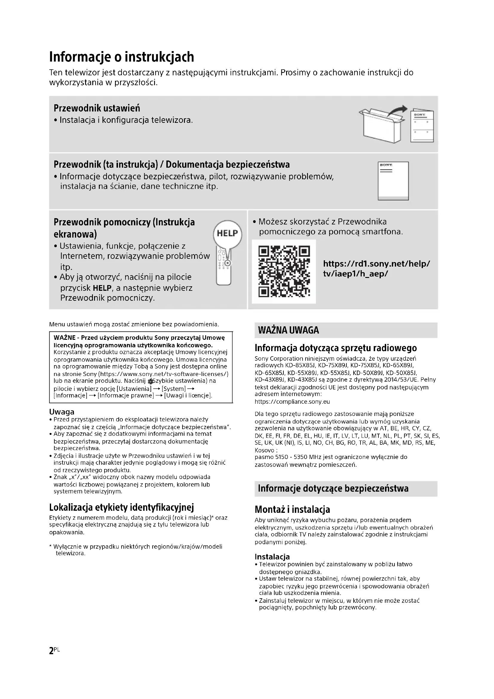 - Możesz skorzystać z Przewodnika pomocniczego za pomocą smartfona. https://rd1.sony.net/help/ tv/iaep1/h_aep/ WAŻNE - Przed użyciem produktu Sony przeczytaj Umowę licencyjną oprogramowania użytkownika końcowego. Korzystanie z produktu oznacza akceptację Umowy licencyjnej oprogramowania użytkownika końcowego. Umowa licencyjna na oprogramowanie między Tobą a Sony jest dostępna online na stronie Sony (https://www.sony.net/tv-software-licenses/) lub na ekranie produktu. Naciśnij (Szybkie ustawienia) na pilocie i wybierz opcję [Ustawienia] [System] [Informacje] [Informacje prawne] [Uwagi i licencje].