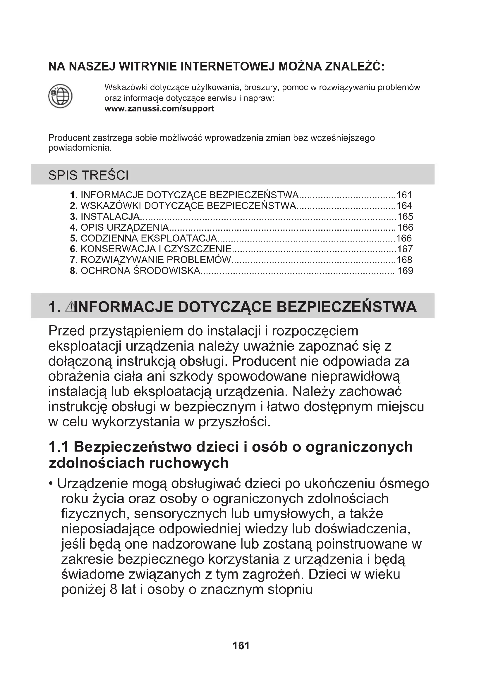 Problem Prawdopodobna przyczyna Środek zaradczy Urządzenie nie włącza się. Urządzenie nie jest podłączone do zasilania lub jest podłączone niepra‐ widłowo. Sprawdzić, czy urządzenie prawidło‐ wo podłączono do zasilania. Urządzenie nie włącza się. Zadziałał bezpiecznik. Sprawdzić, czy przyczyną niepra‐ widłowego działania jest bezpiecz‐ nik. Jeżeli nadal będzie dochodzić do wyzwalania bezpiecznika, należy skontaktować się z wykwalifikowa‐ nym elektrykiem. Nie działa oświetlenie. Wystąpiła usterka oświetlenia. Wymienić żarówkę. Patrz rozdział „Konserwacja i czyszczenie”. Urządzenie nie pochłania wystar‐ czającej ilości oparów. Obroty silnika za niskie w stosunku do ilości oparów. Zmienić prędkość obrotową silnika. 1688. OCHRONA ŚRODOWISKA Materiały oznaczone symbolem należy poddać utylizacji. Opakowanie urządzenia włożyć do odpowiedniego pojemnika w celu przeprowadzenia recyklingu. Należy zadbać o ponowne przetwarzanie odpadów urządzeń elektrycznych i elektronicznych, aby chronić środowisko naturalne oraz ludzkie zdrowie. Nie wolno wyrzucać urządzeń oznaczonych symbolem razem z odpadami domowymi. Należy zwrócić produkt do miejscowego punktu ponownego przetwarzania lub skontaktować się z odpowiednimi władzami miejskimi. 169VISITE O NOSSO WEBSITE PARA: Obter conselhos de utilização, folhetos, resolução de problemas e informações sobreassistência e reparações:www.zanussi.com/supportSujeito a alterações sem aviso prévio. ÍNDICE 1. INFORMAÇÕES DE SEGURANÇA............................................................1702. INSTRUÇÕES DE SEGURANÇA...............................................................173