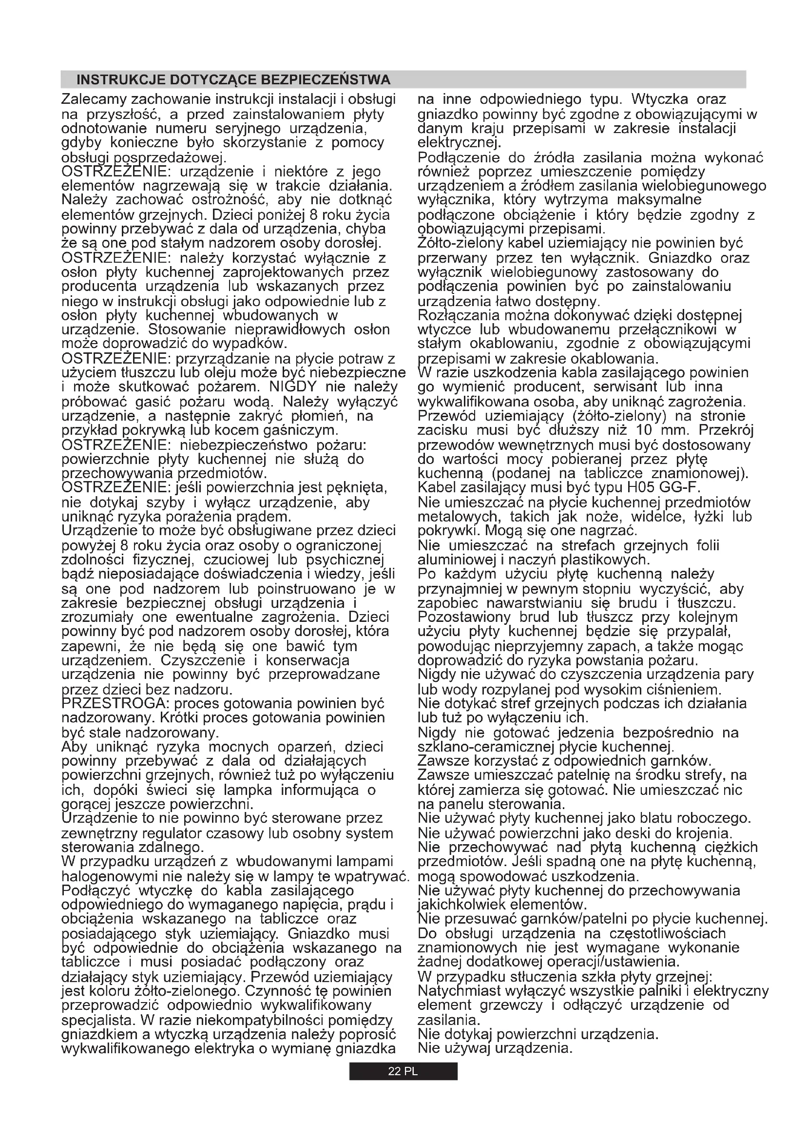 Al mostrar el logo marcado en este producto, declaramos, bajo nuestra propia responsabilidad, el cumplimiento de todos los requisitos europeos en términos de seguridad, salud y medio ambiente, establecidos en la legislación de este producto. El aparato cumple con la Directiva Europea 2009/142/CE (GAD) y, a partir del 21/04/2018, con el Reglamento para Aparatos de Gas 2016/426 (GAR). Rejillas cromadas y quemadores Las rejillas cromadas y los quemadores tienen tendencia a ponerse oscuros con el uso. Es algo normal e inevitable, pero es algo que no altera en absoluto el funcionamiento de la placa de cocina. En todo caso en nuestro centro de servicio de post-venta pueden encontrarse piezas de recambio.22 PL OSTRZEŻENIE: urządzenie i niektóre z jego elementów nagrzewają się w trakcie działania. Należy zachować ostrożność, aby nie dotknąć elementów grzejnych. Dzieci poniżej 8 roku życia powinny przebywać z dala od urządzenia, chyba że są one pod stałym nadzorem osoby dorosłej. Zalecamy zachowanie instrukcji instalacji i obsługi na przyszłość, a przed zainstalowaniem płyty odnotowanie numeru seryjnego urządzenia, gdyby konieczne było skorzystanie z pomocy obsługi posprzedażowej. OSTRZEŻENIE: jeśli powierzchnia jest pęknięta, nie dotykaj szyby i wyłącz urządzenie, aby uniknąć ryzyka porażenia prądem. OSTRZEŻENIE: przyrządzanie na płycie potraw z użyciem tłuszczu lub oleju może być niebezpieczne i może skutkować pożarem. NIGDY nie należy próbować gasić pożaru wodą. Należy wyłączyć urządzenie, a następnie zakryć płomień, na przykład pokrywką lub kocem gaśniczym. Aby uniknąć ryzyka mocnych oparzeń, dzieci powinny przebywać z dala od działających powierzchni grzejnych, również tuż po wyłączeniu ich, dopóki świeci się lampka informująca o gorącej jeszcze powierzchni. PRZESTROGA: proces gotowania powinien być nadzorowany. Krótki proces gotowania powinien być stale nadzorowany. Urządzenie to może być obsługiwane przez dzieci powyżej 8 roku życia oraz osoby o ograniczonej zdolności fizycznej, czuciowej lub psychicznej bądź nieposiadające doświadczenia i wiedzy, jeśli są one pod nadzorem lub poinstruowano je w zakresie bezpiecznej obsługi urządzenia i zrozumiały one ewentualne zagrożenia. Dzieci powinny być pod nadzorem osoby dorosłej, która zapewni, że nie będą się one bawić tym urządzeniem. Czyszczenie i konserwacja urządzenia nie powinny być przeprowadzane przez dzieci bez nadzoru. OSTRZEŻENIE: niebezpieczeństwo pożaru: powierzchnie płyty kuchennej nie służą do przechowywania przedmiotów. Urządzenie to nie powinno być sterowane przez zewnętrzny regulator czasowy lub osobny system sterowania zdalnego. W przypadku urządzeń z wbudowanymi lampami halogenowymi nie należy się w lampy te wpatrywać. Podłączyć wtyczkę do kabla zasilającego odpowiedniego do wymaganego napięcia, prądu i obciążenia wskazanego na tabliczce oraz posiadającego styk uziemiający. Gniazdko musi być odpowiednie do obciążenia wskazanego na tabliczce i musi posiadać podłączony oraz działający styk uziemiający. Przewód uziemiający jest koloru żółto-zielonego. Czynność tę powinien przeprowadzić odpowiednio wykwalifikowany specjalista. W razie niekompatybilności pomiędzy gniazdkiem a wtyczką urządzenia należy poprosić wykwalifikowanego elektryka o wymianę gniazdka OSTRZEŻENIE: należy korzystać wyłącznie z osłon płyty kuchennej zaprojektowanych przez producenta urządzenia lub wskazanych przez niego w instrukcji obsługi jako odpowiednie lub z osłon płyty kuchennej wbudowanych w urządzenie. Stosowanie nieprawidłowych osłon może doprowadzić do wypadków.